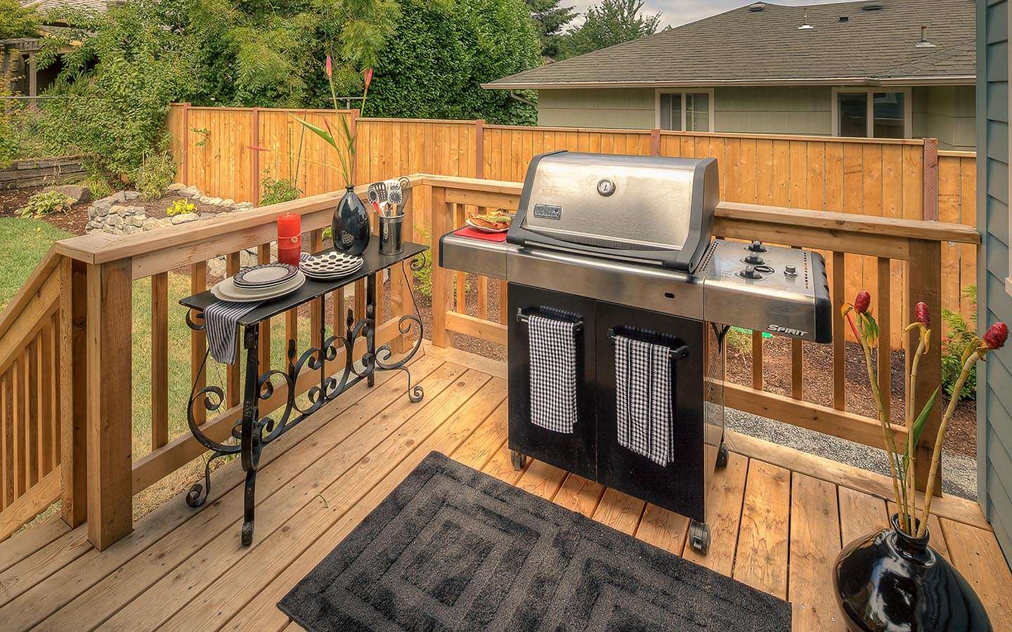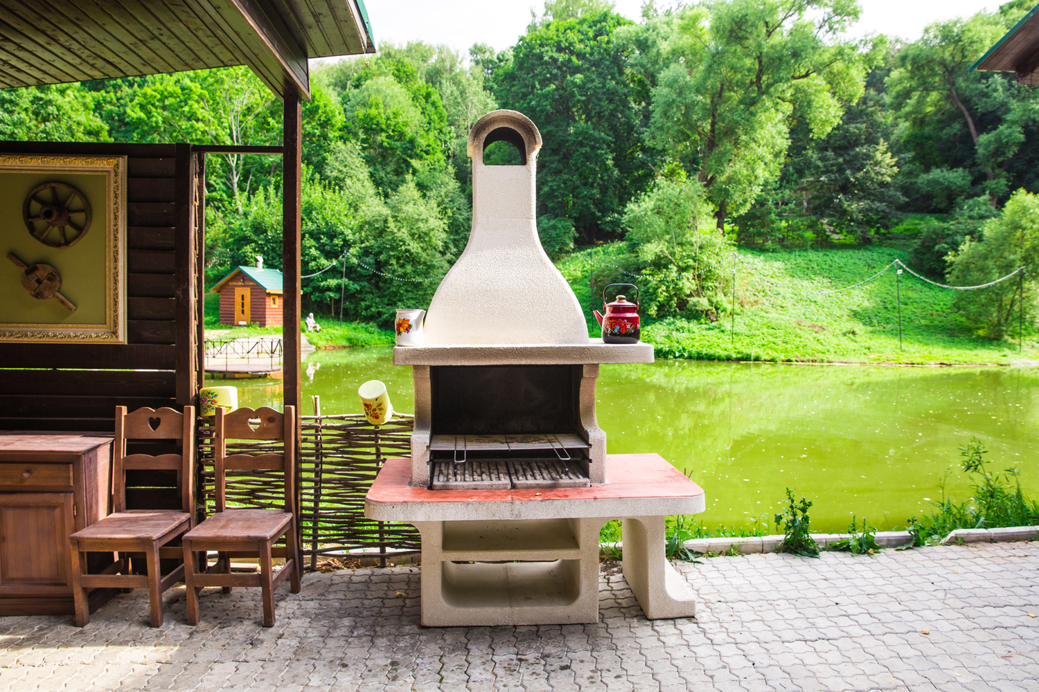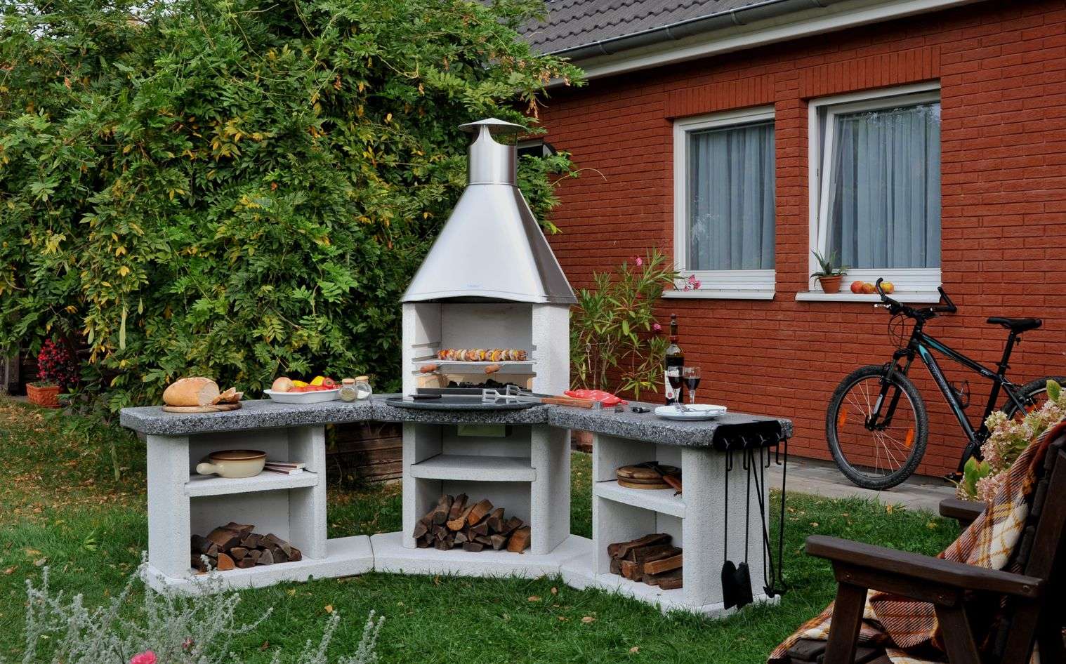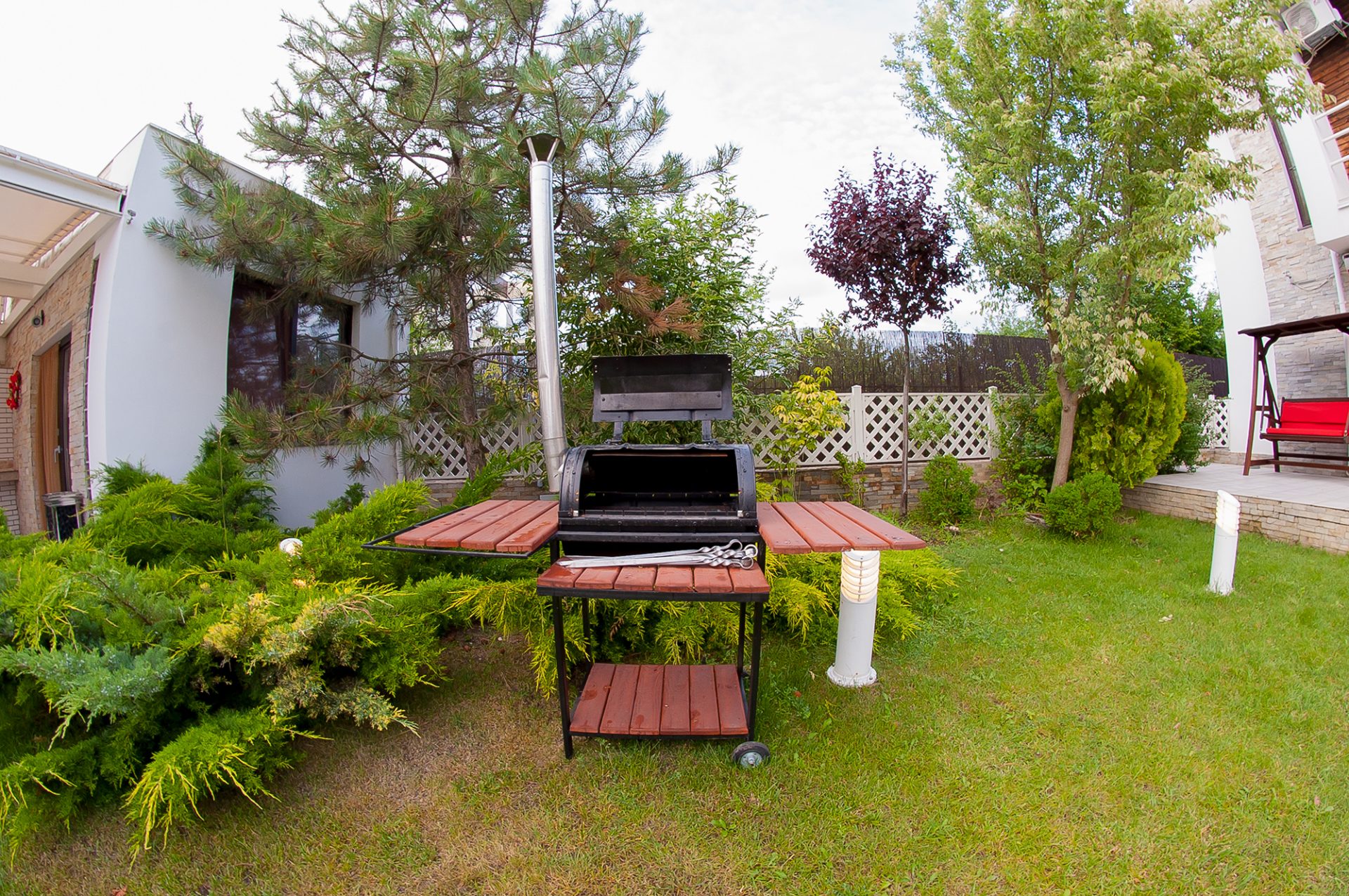 - Distância de casa. Se não estamos falando de um pátio onde tudo está claro, problemas podem surgir com a distância. Por um lado, não deve ser pequeno - caso contrário, logo que você tenha recolhido convidados, a fumaça pode entrar em casa. Por outro lado, não deve ser grande - caso contrário, você será atormentado trazendo comida da geladeira e levando embora os pratos sujos. Em geral, é melhor que seja mais do que menos - você não fará nada com a fumaça, mas os convidados ajudarão a transportar as coisas.