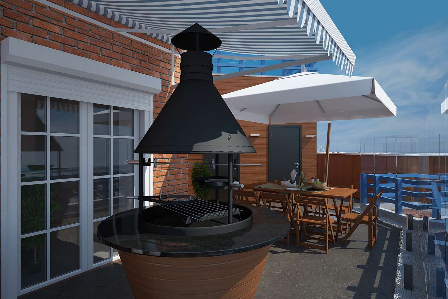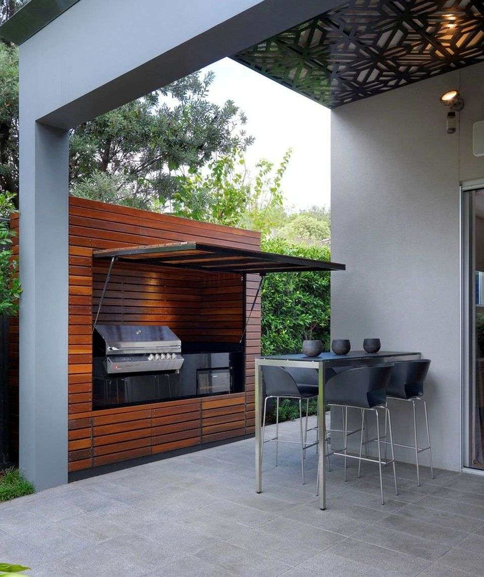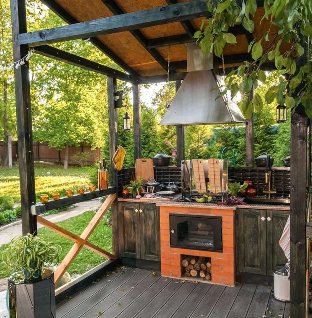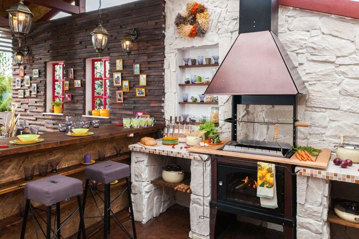- Para fora. Se a área de jantar em um andar, enquanto sob o toldo, e trabalhando ao ar livre, no outro andar - o contraste será impressionante. Além disso, a fumaça definitivamente sairá, e o cozinheiro poderá se concentrar.
