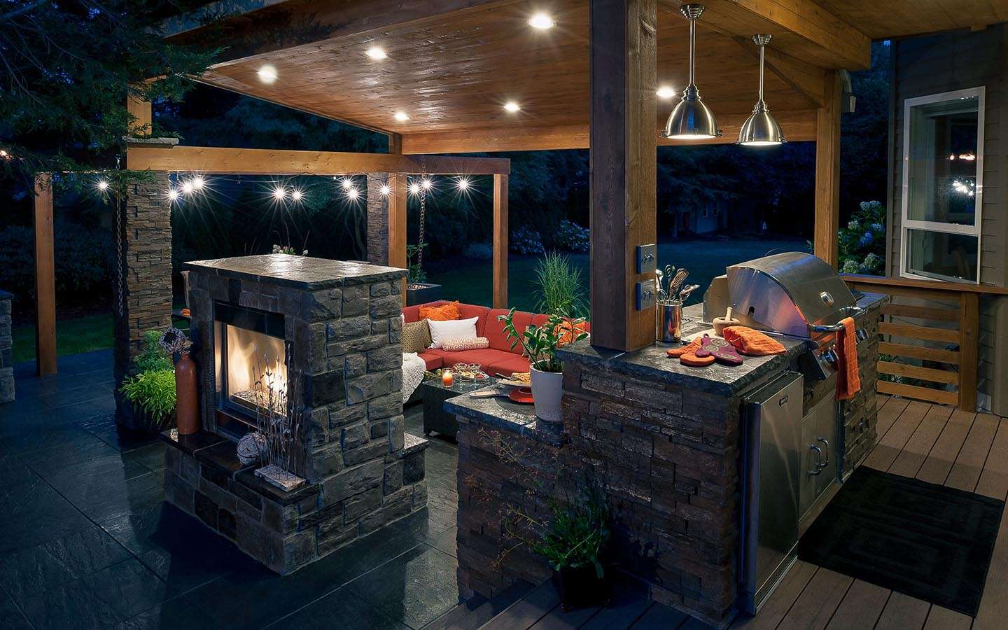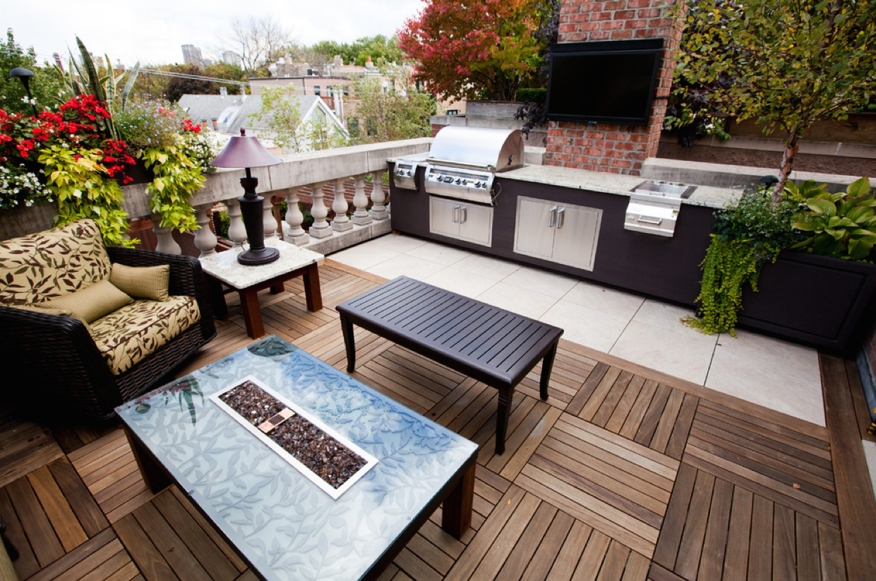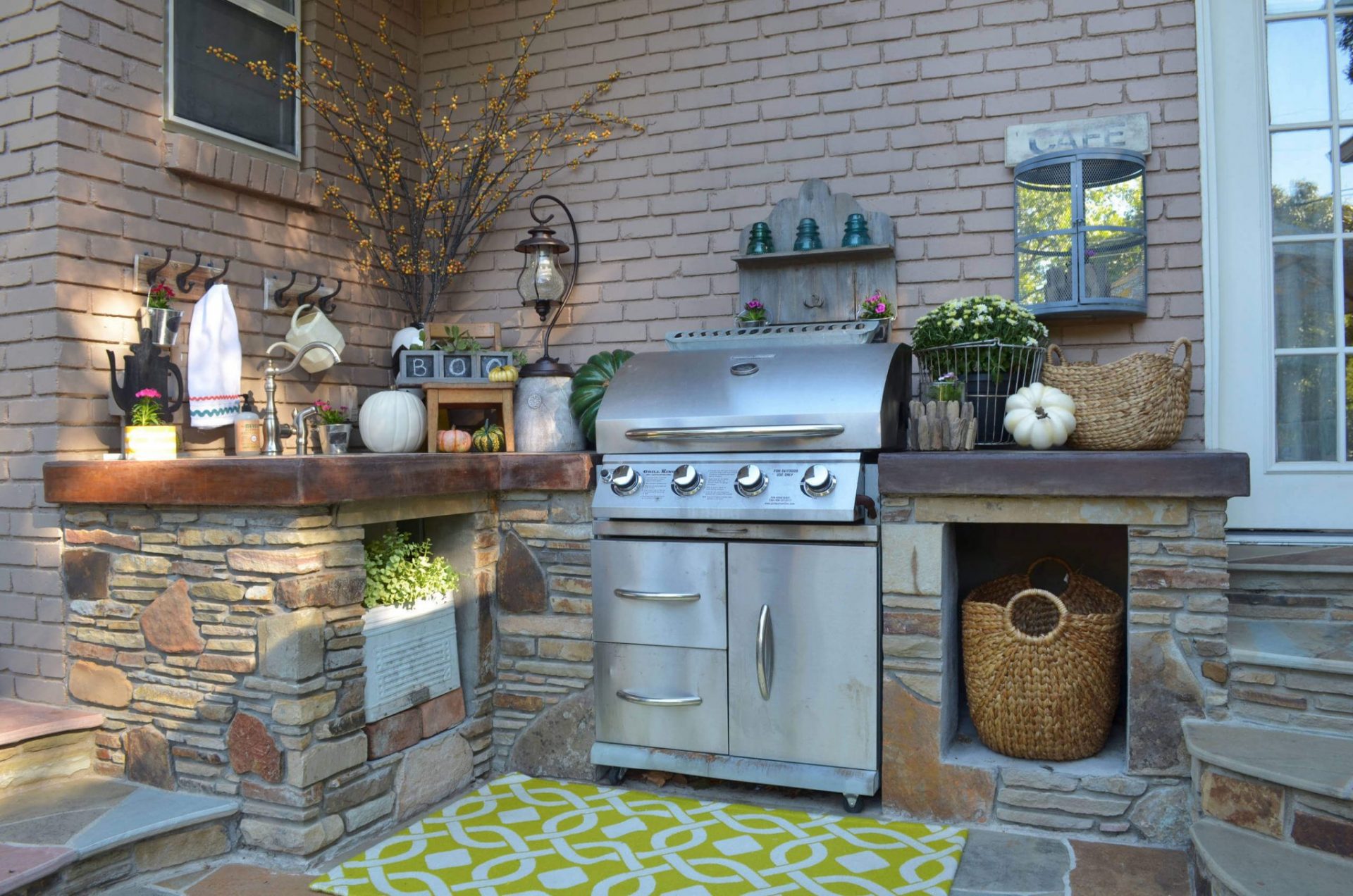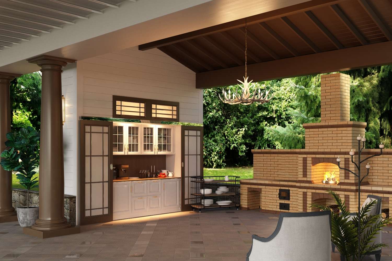 - Para fora. Se a área de jantar em um andar, enquanto sob o toldo, e trabalhando ao ar livre, no outro andar - o contraste será impressionante. Além disso, a fumaça definitivamente sairá, e o cozinheiro poderá se concentrar.
