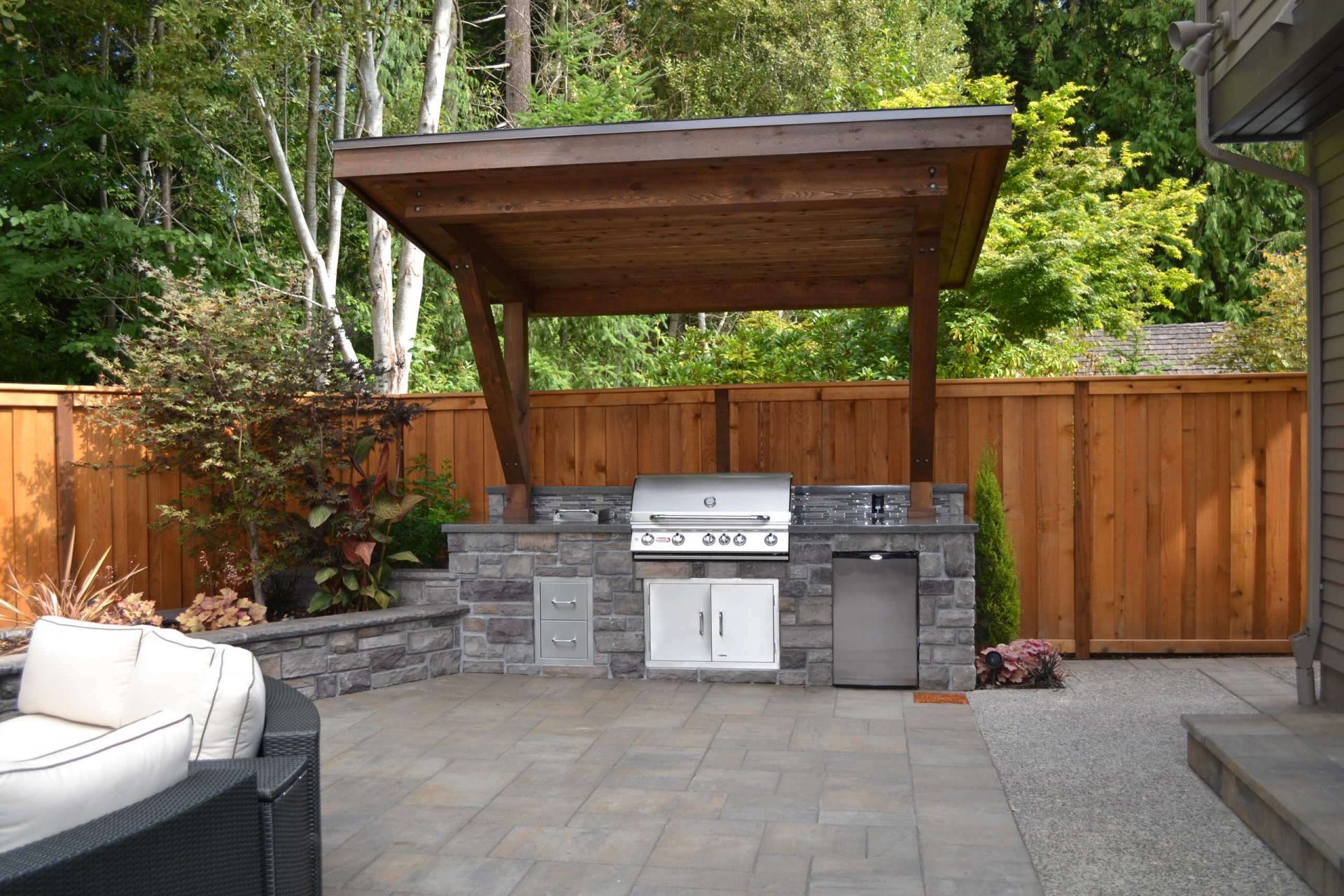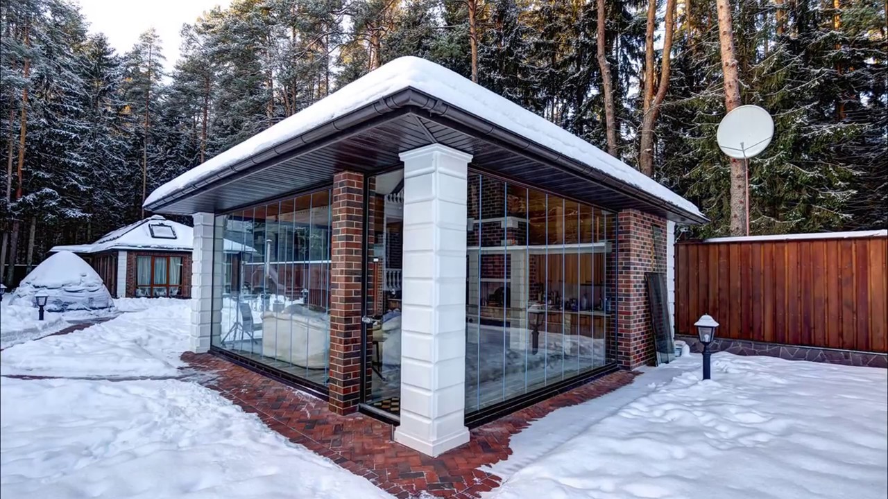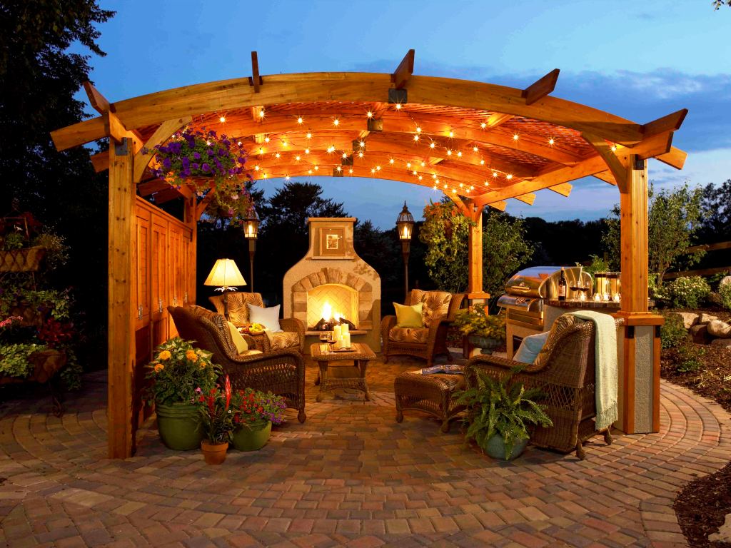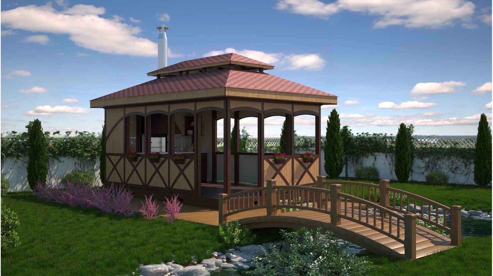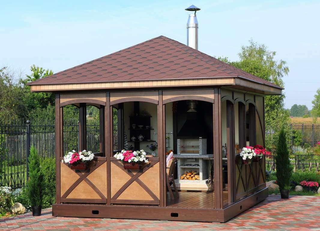 - Arbor. Ela tem uma parede com telhado, parece uma casa pequena e protege perfeitamente não só da chuva, mas também do frio. Construí-lo pode ser caro, mas você pode usá-lo no inverno, se você quiser relaxar na natureza.