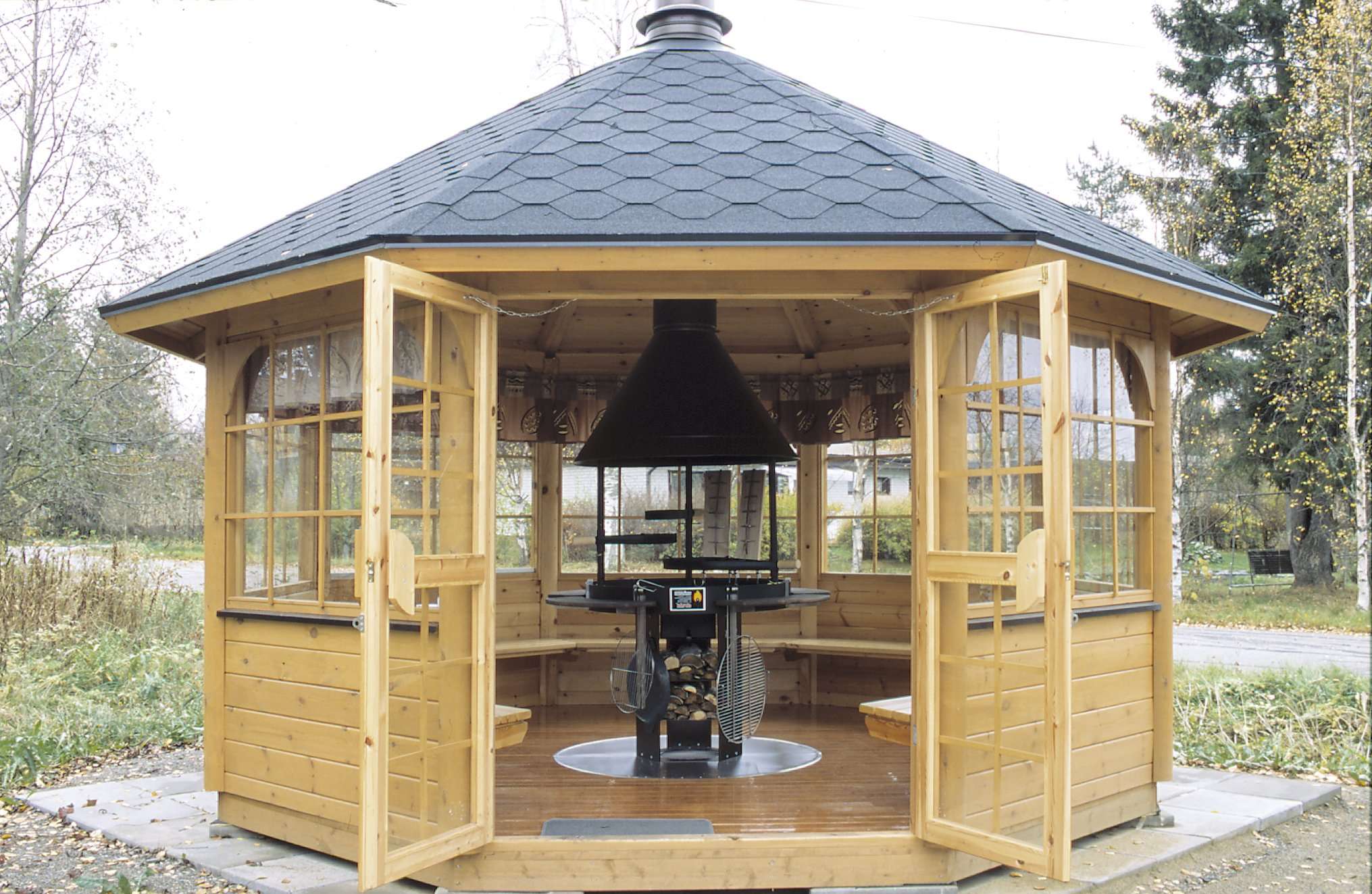 - Sala de jantar. Pode ser decorado lindamente, com bom gosto e sem restrições de materiais.Afinal, dentro de um gazebo fechado, eles não precisam suportar mudanças de temperatura, alta umidade, condições adversas nas ruas.