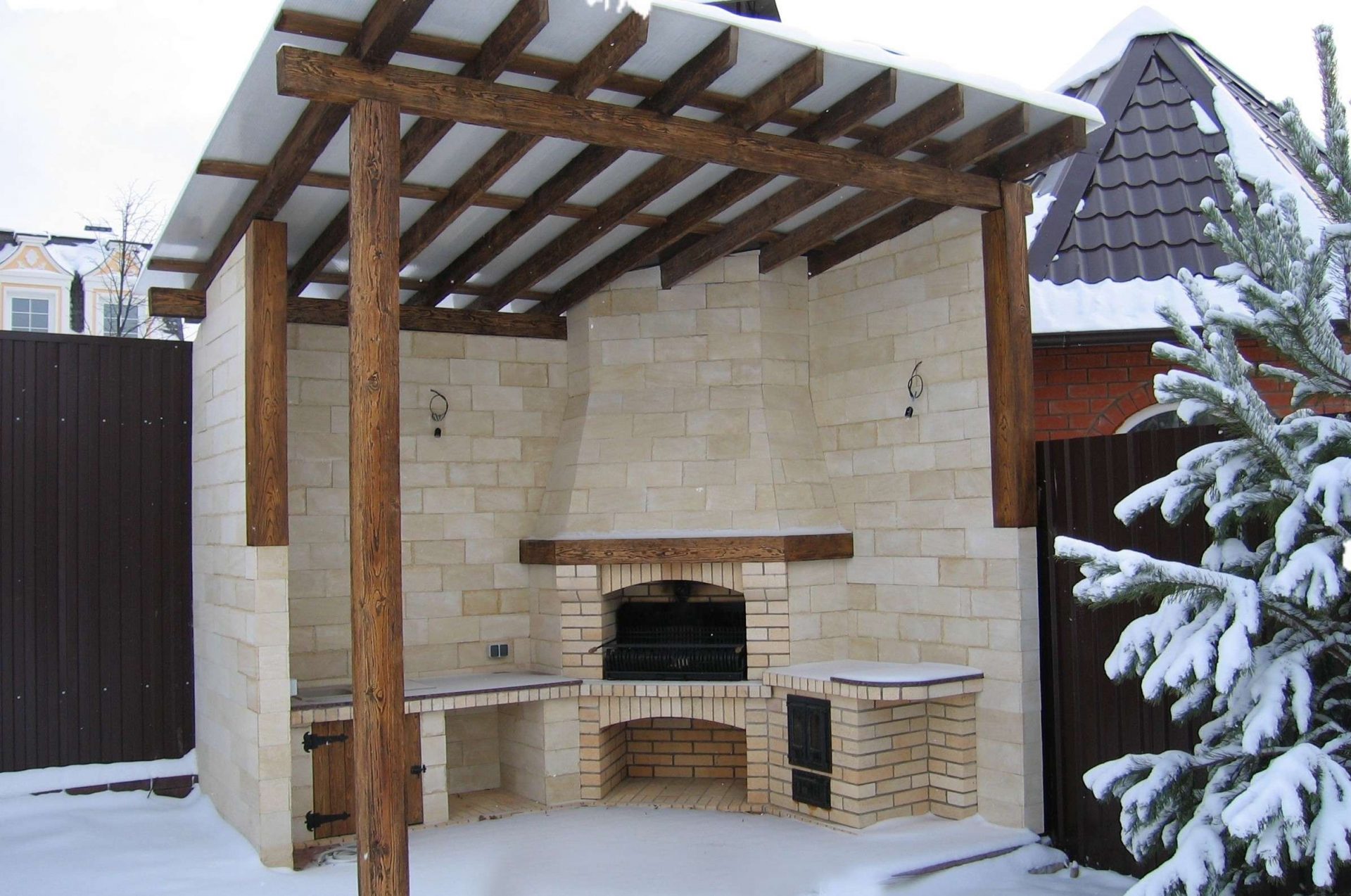 - Arbor. Como regra geral, tem um telhado e pilares que o suportam - e uma das paredes é substituída pelas paredes de uma casa ou de uma das suas dependências. Isso garante maior confiabilidade, além disso, é mais fácil se proteger do vento. Além disso, a presença da parede permite que você experimente o design.