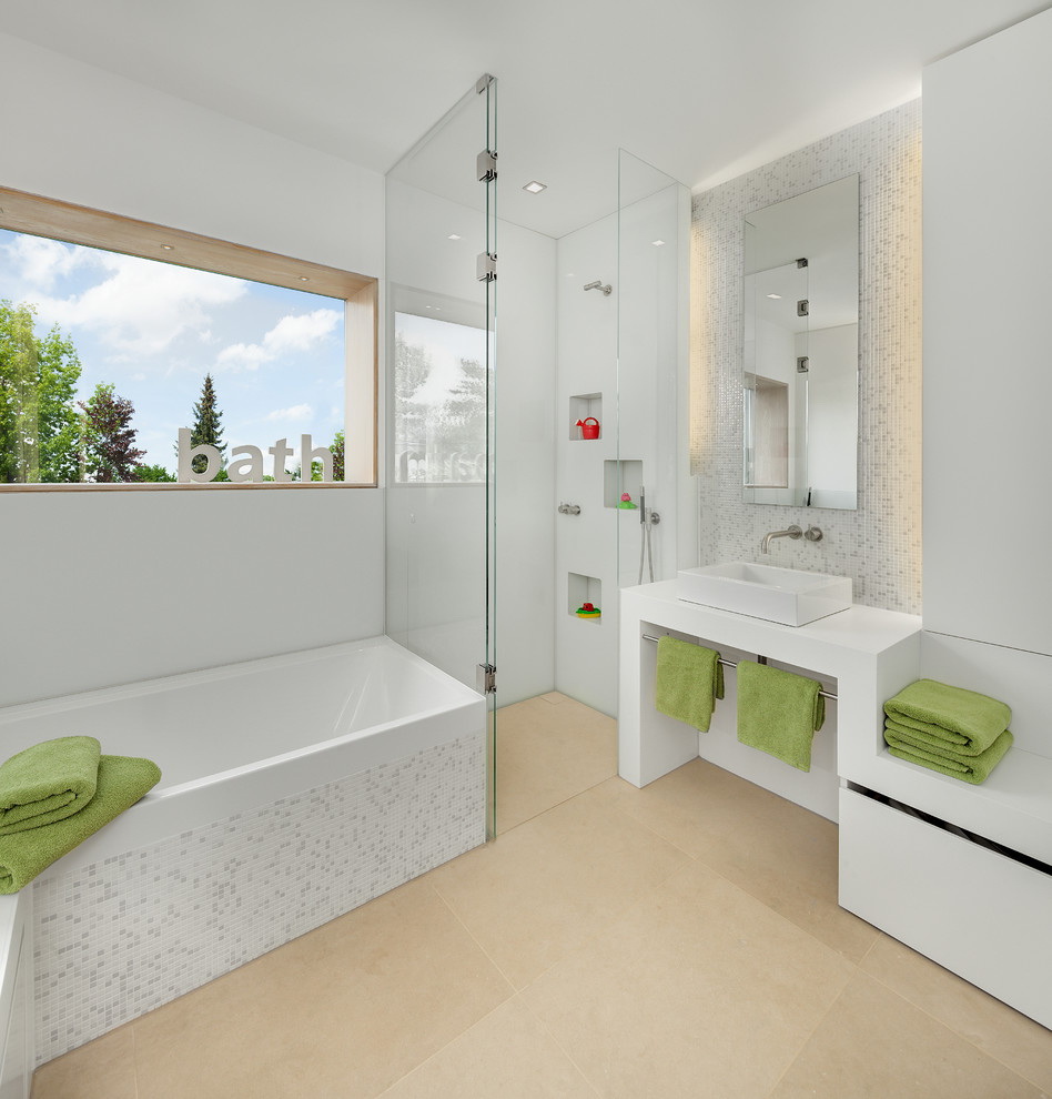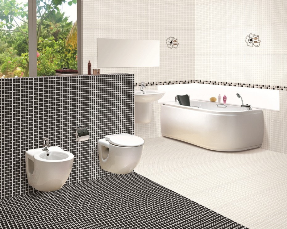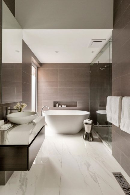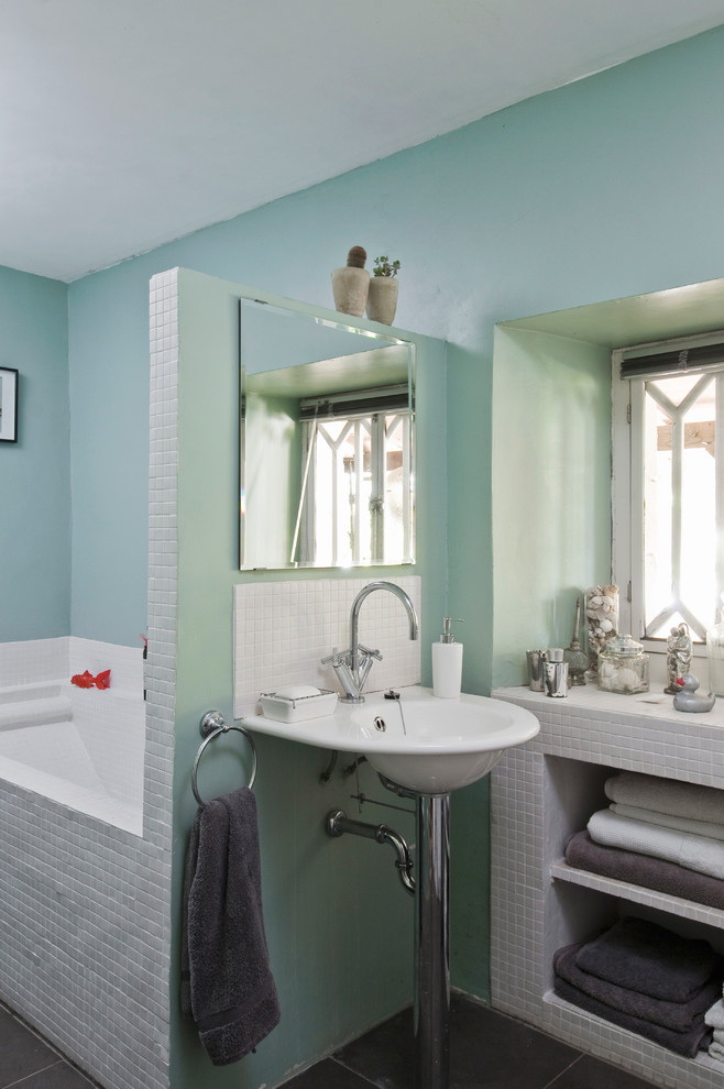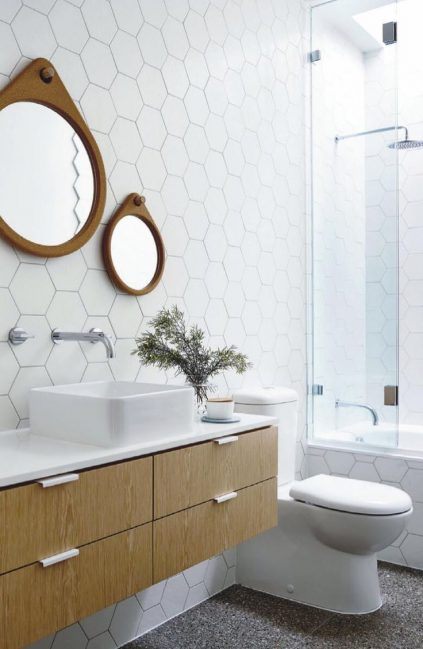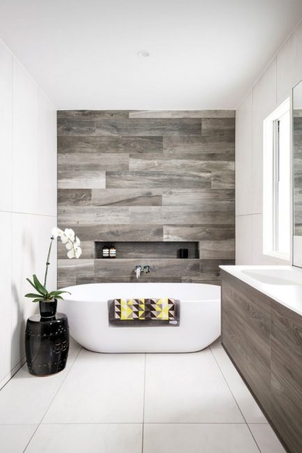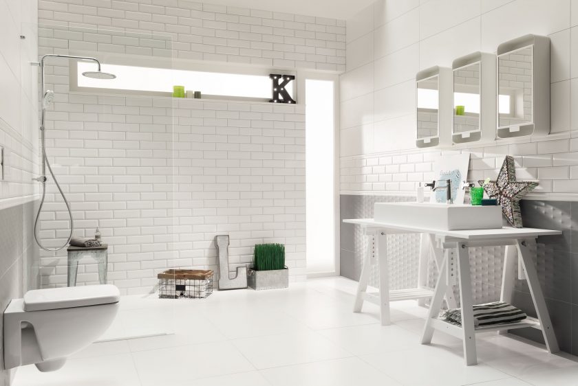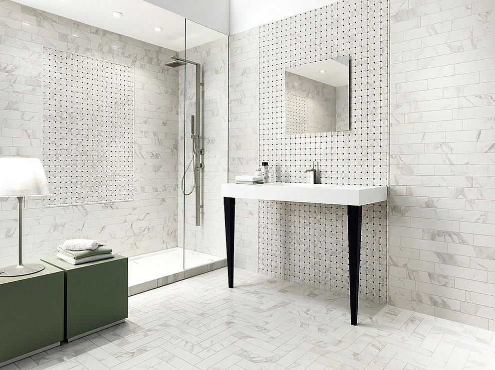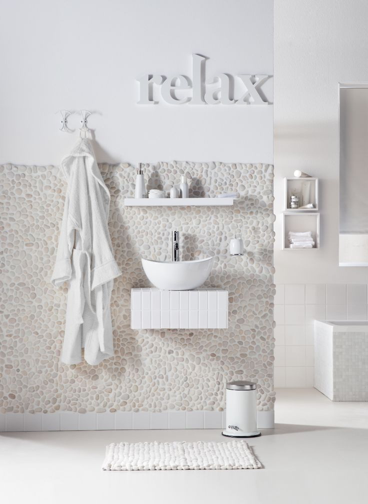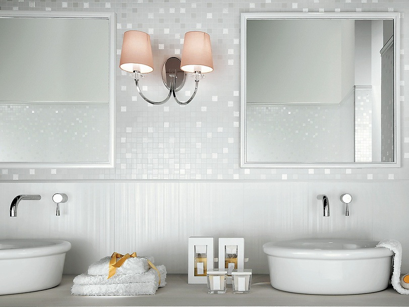 Quando se utiliza apenas branco de neve no desenho de uma casa de banho, pode criar-se uma atmosfera fria. Para evitar isso, é possível folhear telhas com uma ligeira areia ou outro tom.