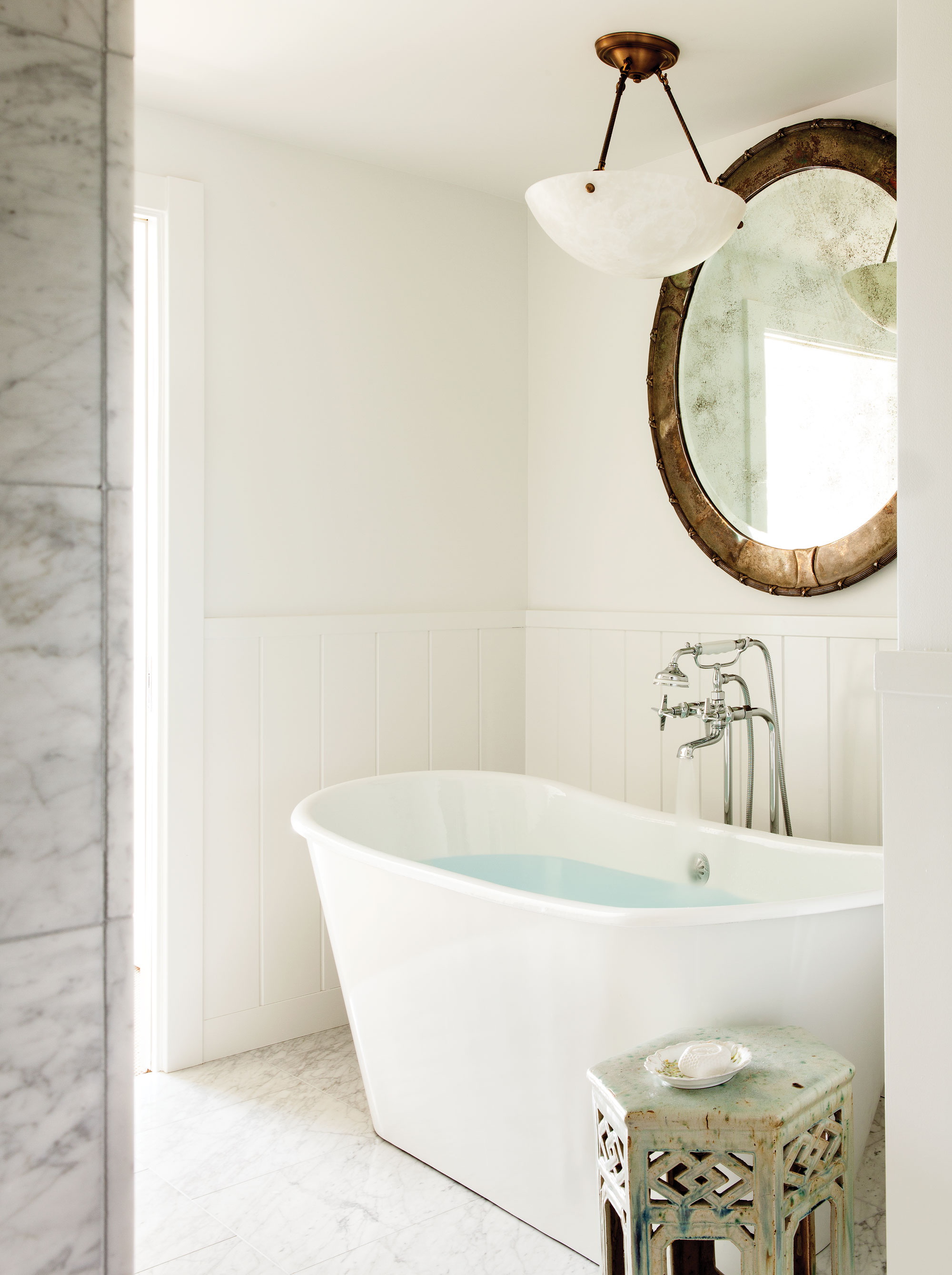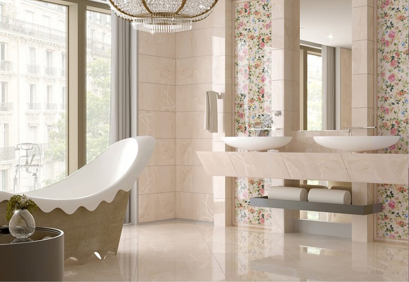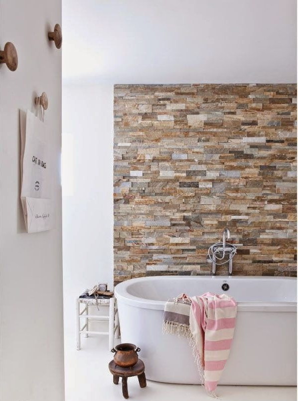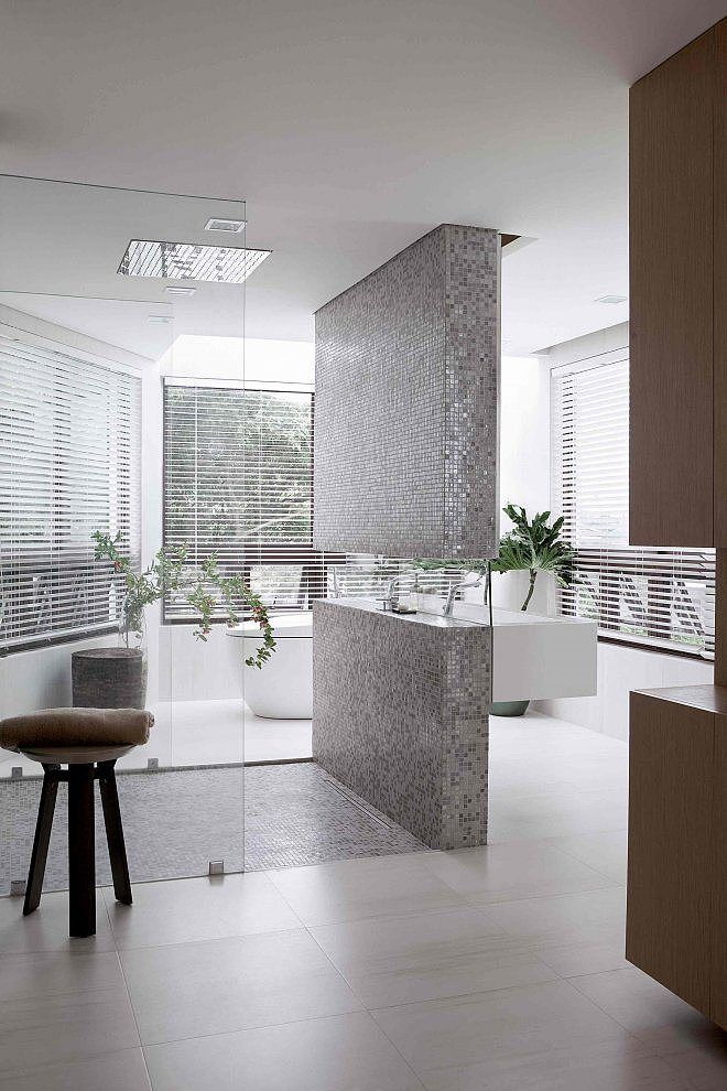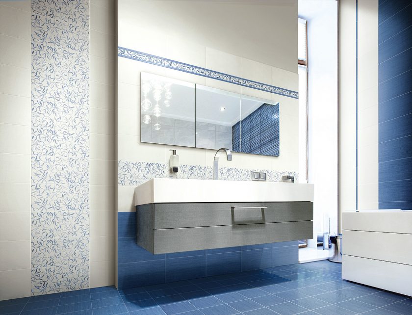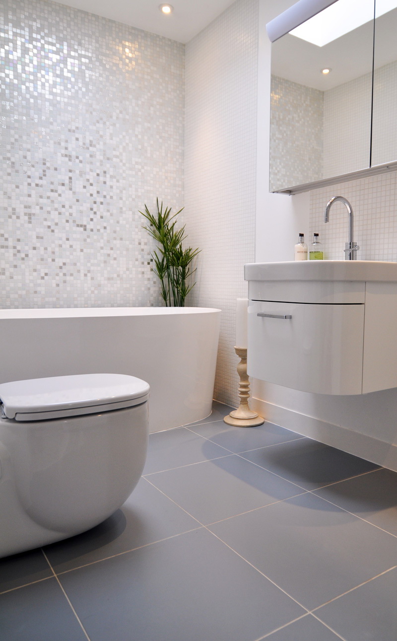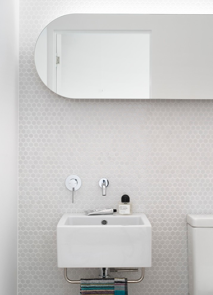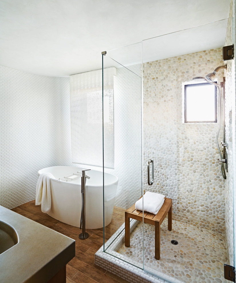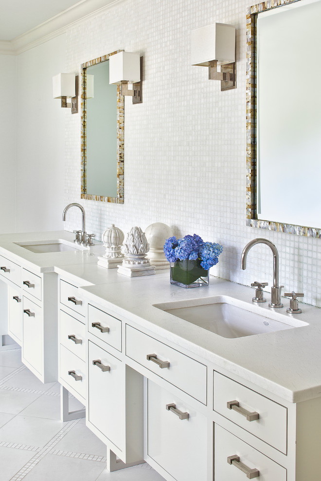 Quando se utiliza apenas branco de neve no desenho de uma casa de banho, pode criar-se uma atmosfera fria. Para evitar isso, é possível folhear telhas com uma ligeira areia ou outro tom.