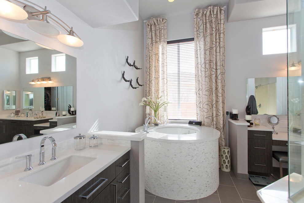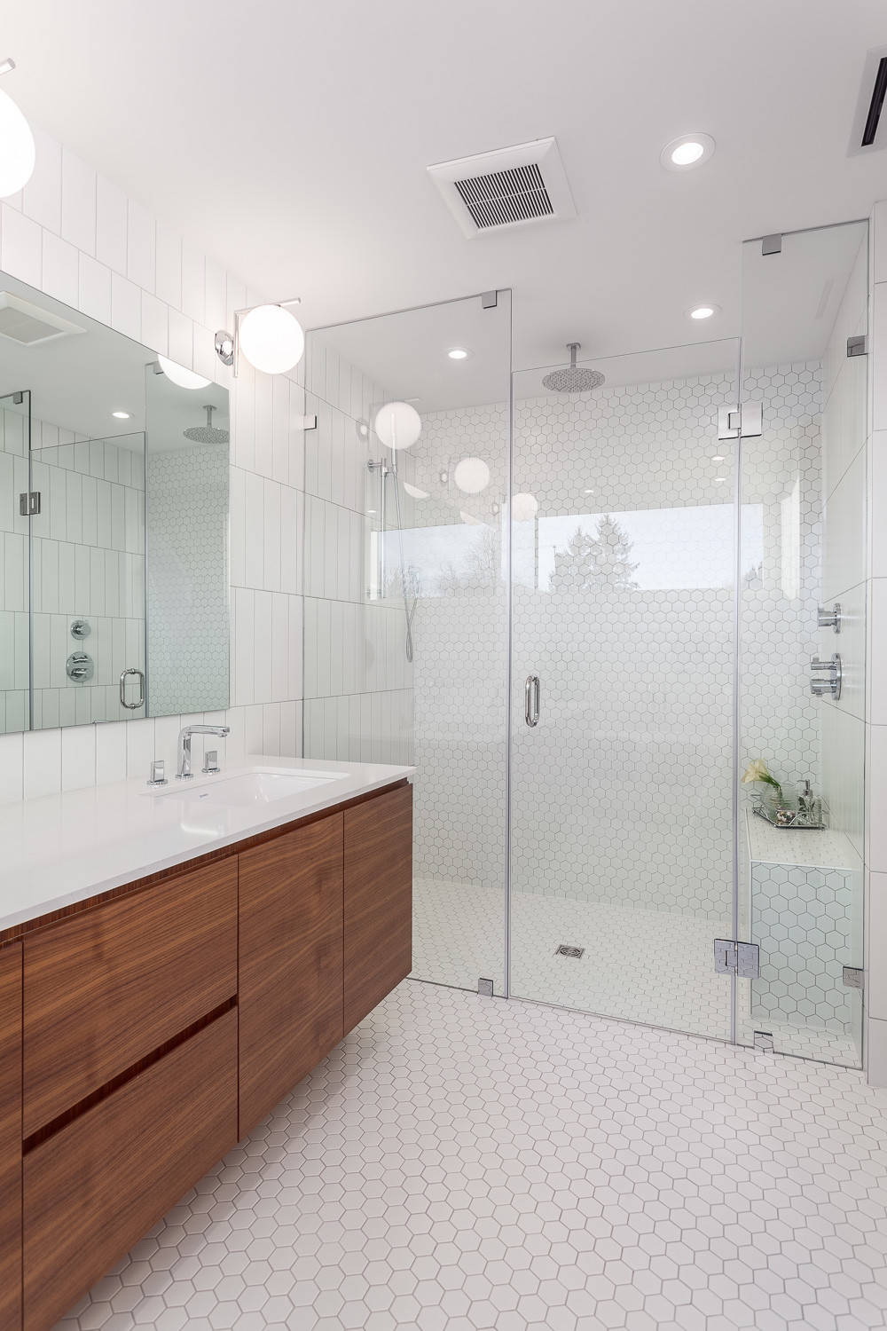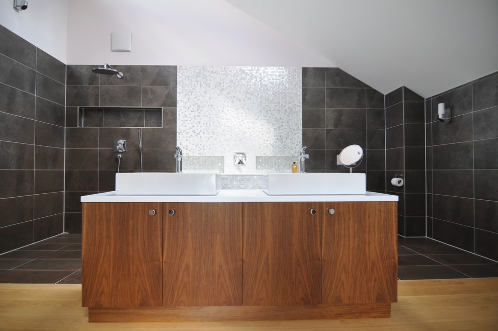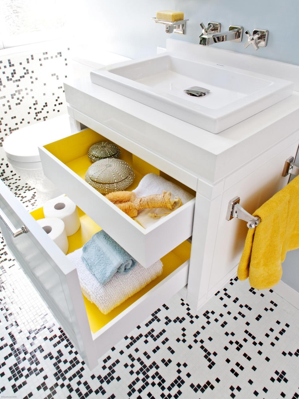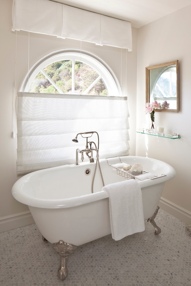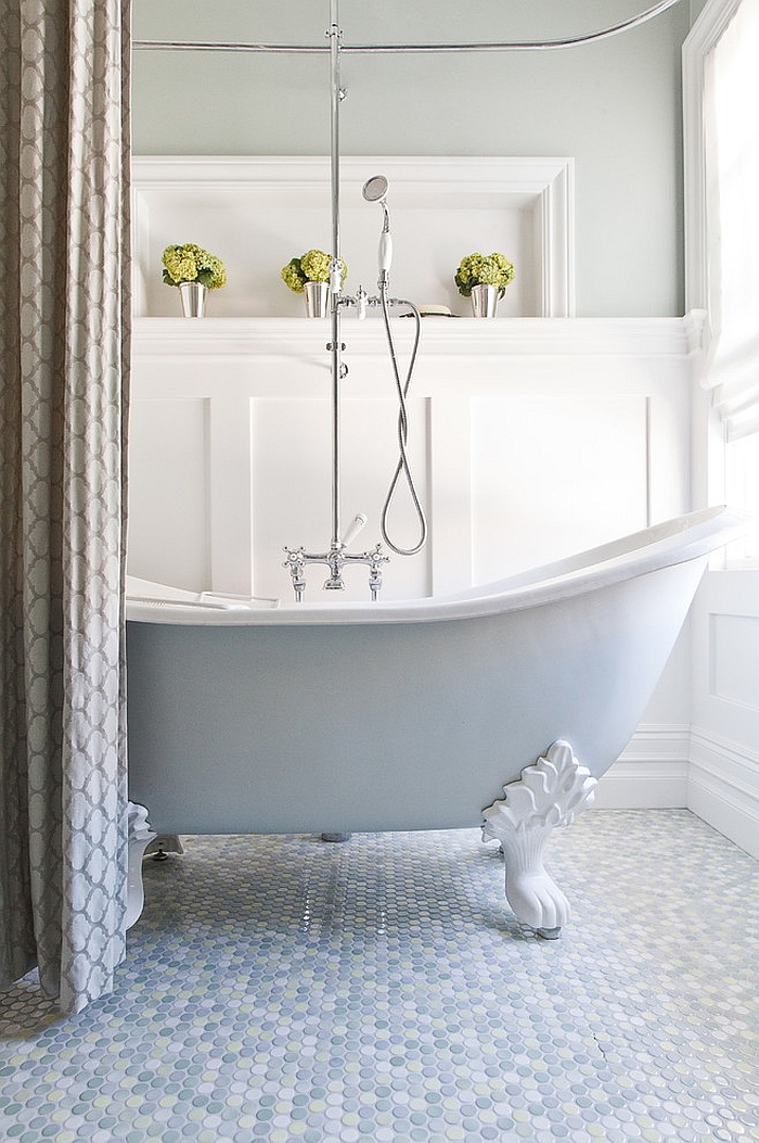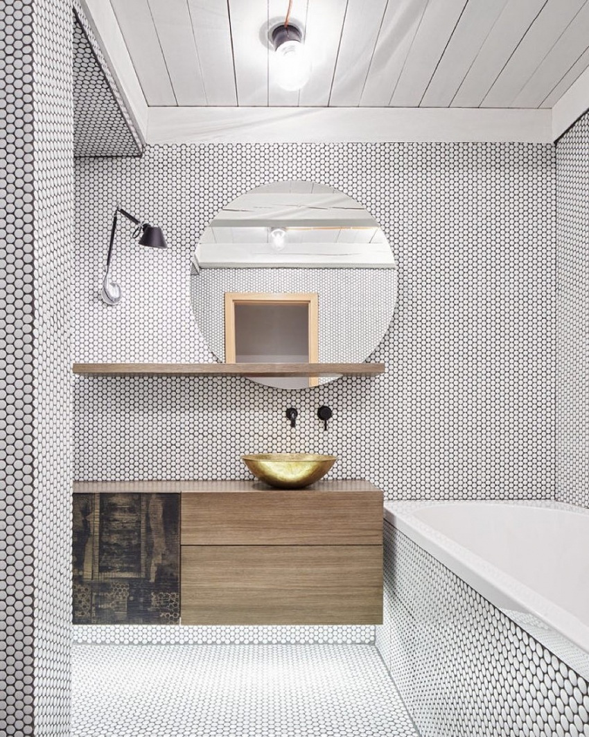 Quando se utiliza apenas branco de neve no desenho de uma casa de banho, pode criar-se uma atmosfera fria. Para evitar isso, é possível folhear telhas com uma ligeira areia ou outro tom.