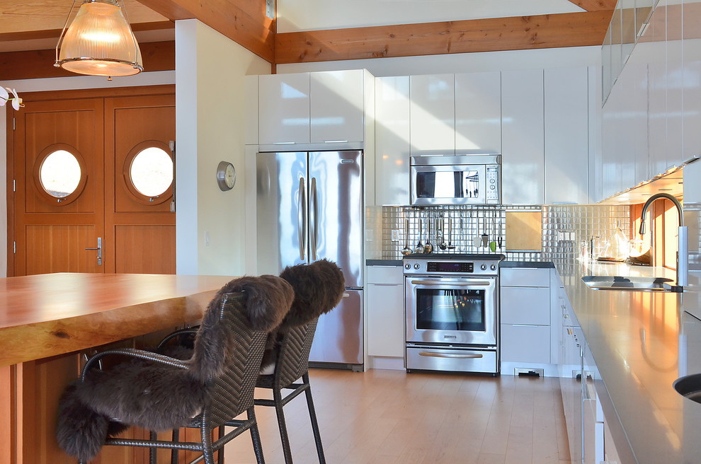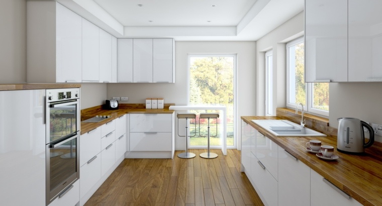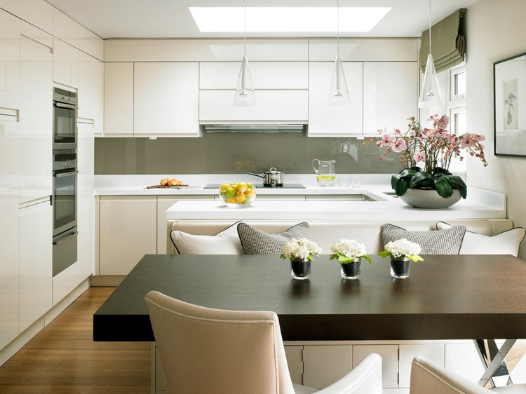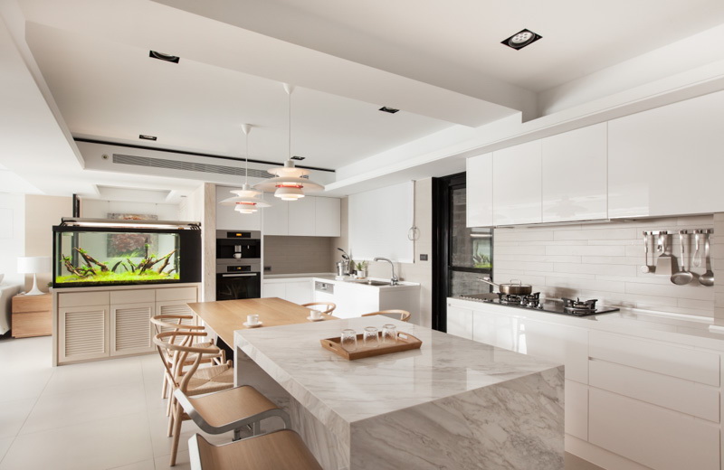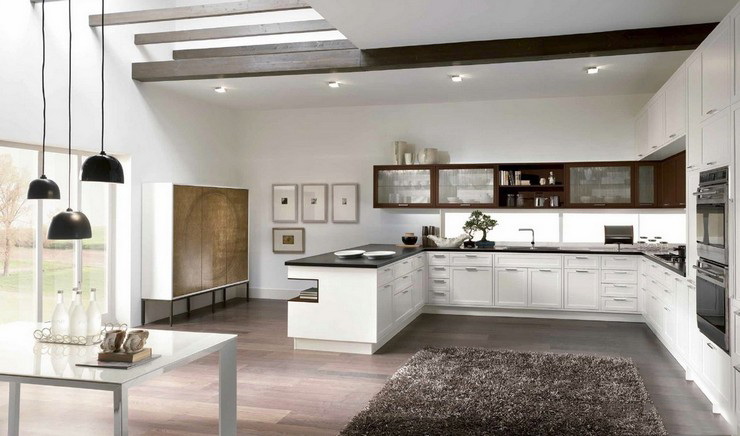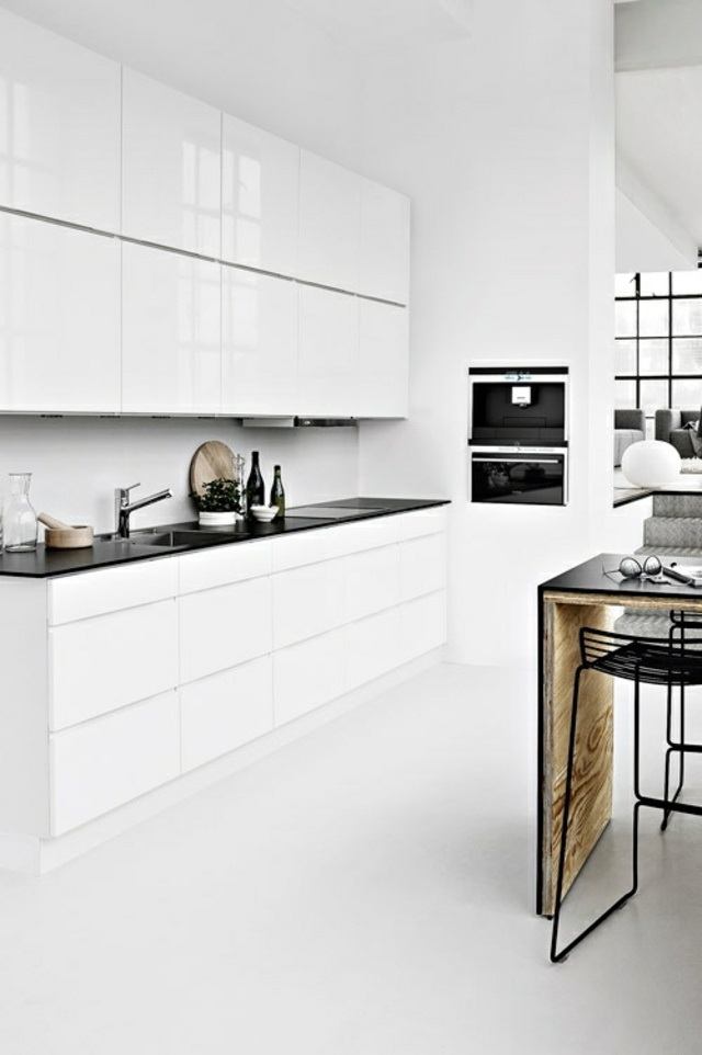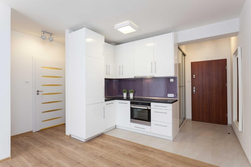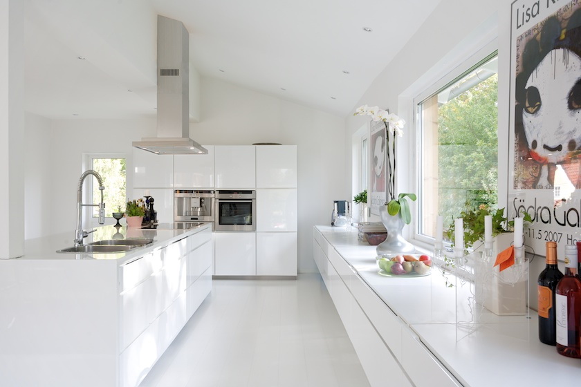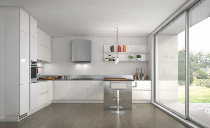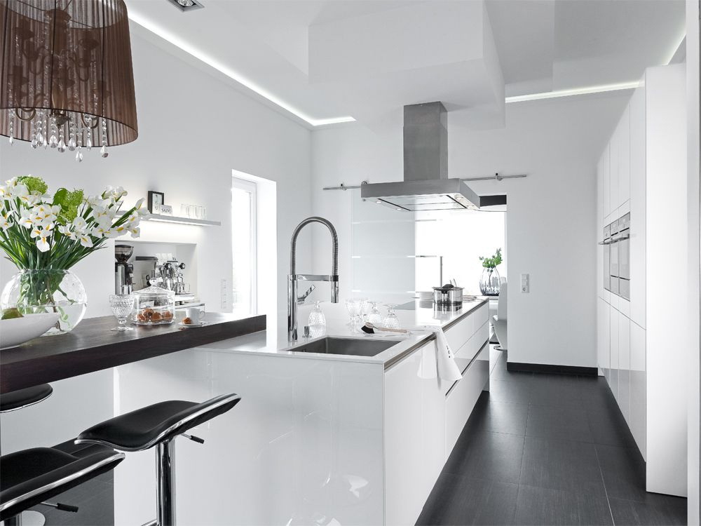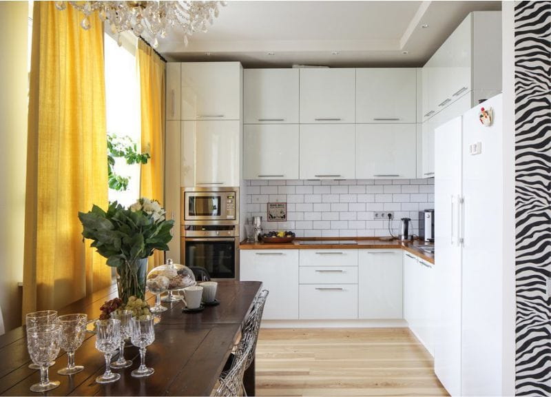 Na cozinha há muitos acessórios, utensílios de cozinha, eletrodomésticos e móveis. A versatilidade do branco como a neve permite que você selecione cores complementares, dependendo do estilo da sala.