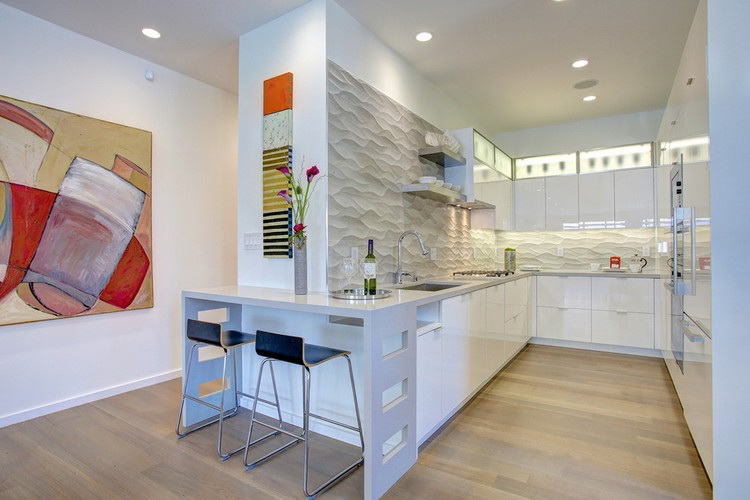 Nos interiores, você pode combinar azulejos brancos e tonais em alto relevo. Esta técnica dá um efeito decorativo alto, permite aplicar uma abordagem extraordinária para o design das instalações. Você pode usá-lo em: