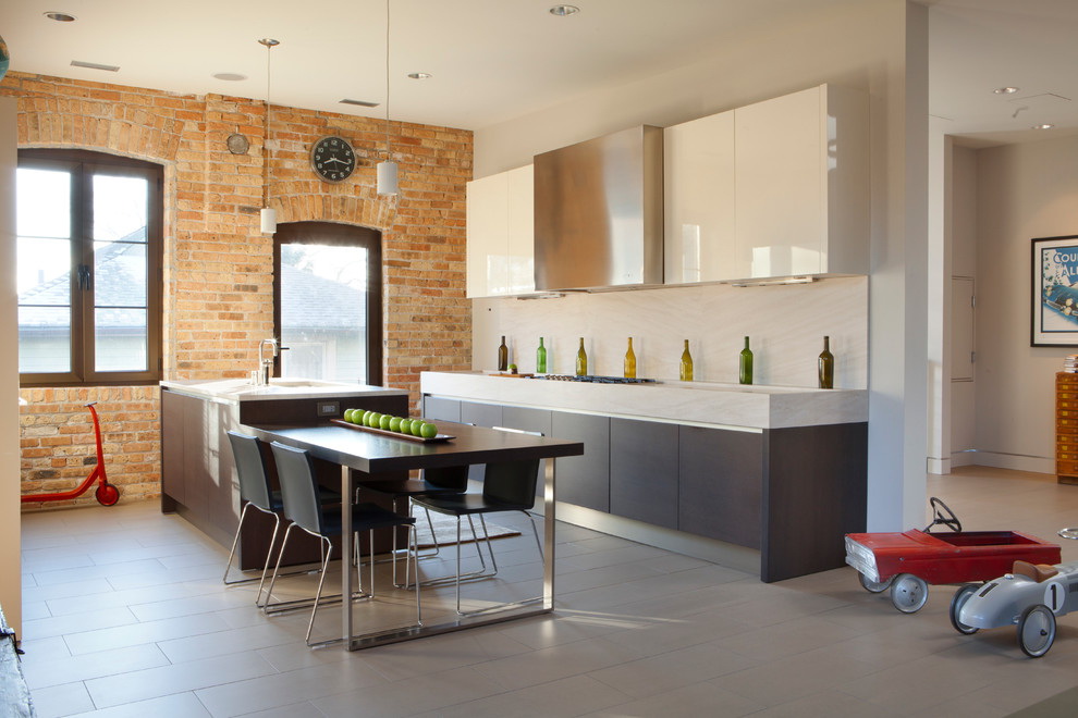 Com a cor branca dominante, a telha vermelha pode ser feita não só para o revestimento do chão, mas também para as paredes. Neste caso, a tonalidade vermelha é dada o papel de ênfase no design.
