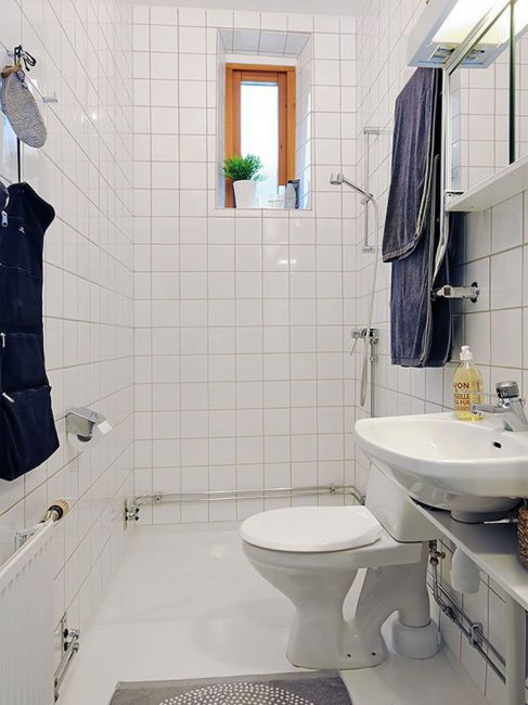 Nos casos em que o banheiro é muito estreito, azulejos brancos virão para o resgate. Para que a sala pareça proporcional, ladrilhos leves podem ser dispostos nas paredes que se expandem. O resto é melhor para emitir um azulejo escuro.