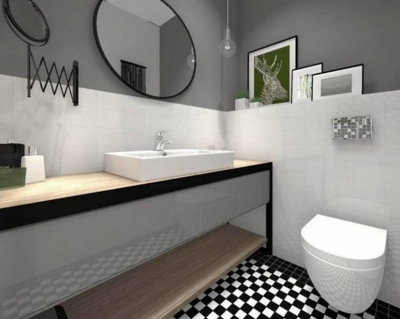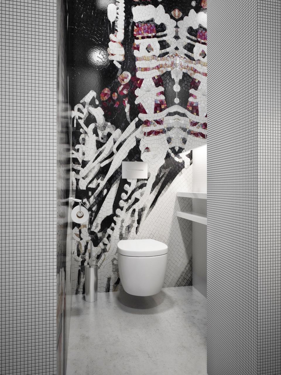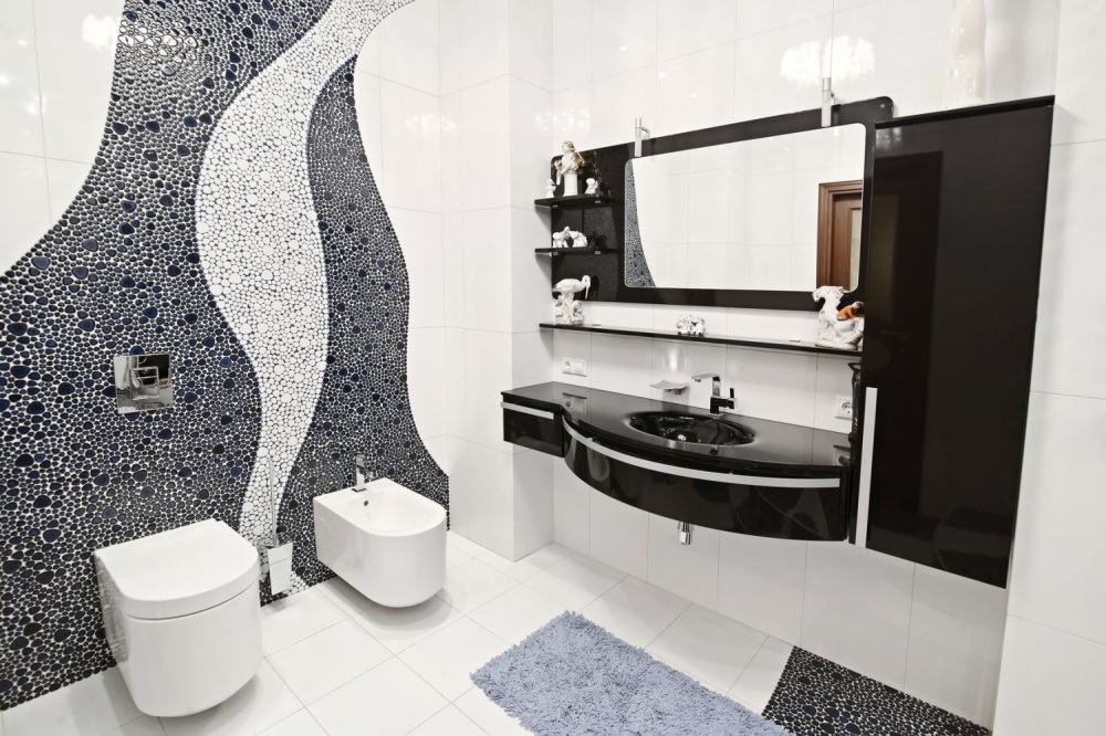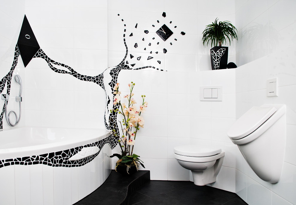 WC também pode ser revetted em preto e branco. Isso pode ser um arranjo de xadrez, listras ou técnicas de design que combinam telhas de mármore, painéis, formas incomuns de encanamento.