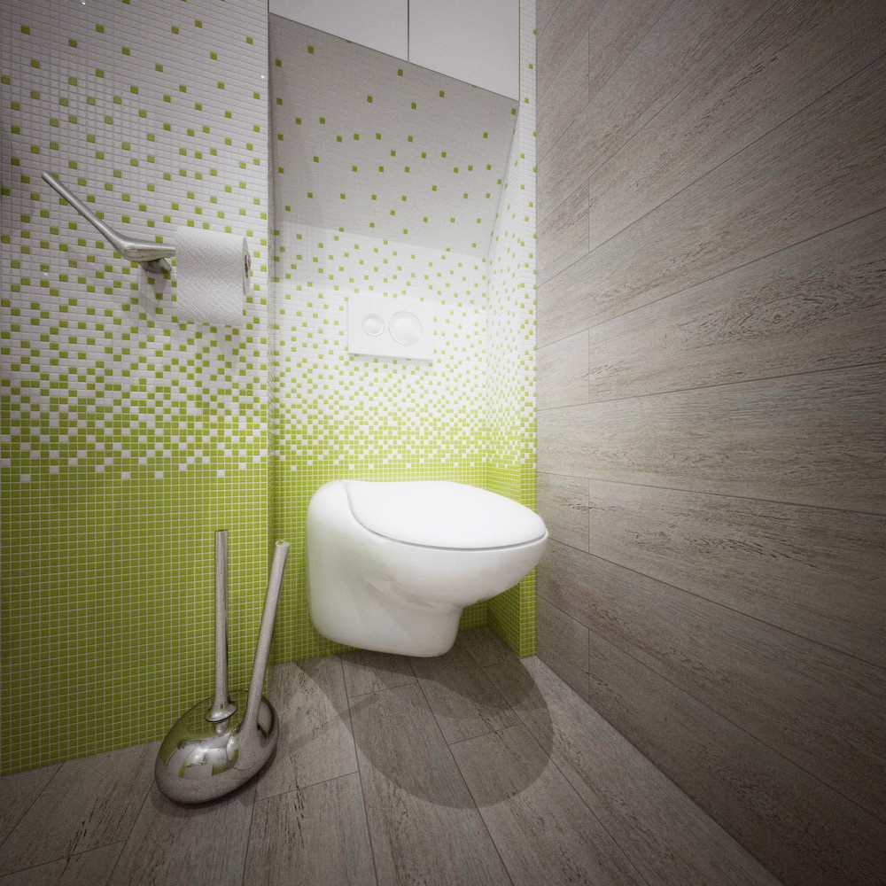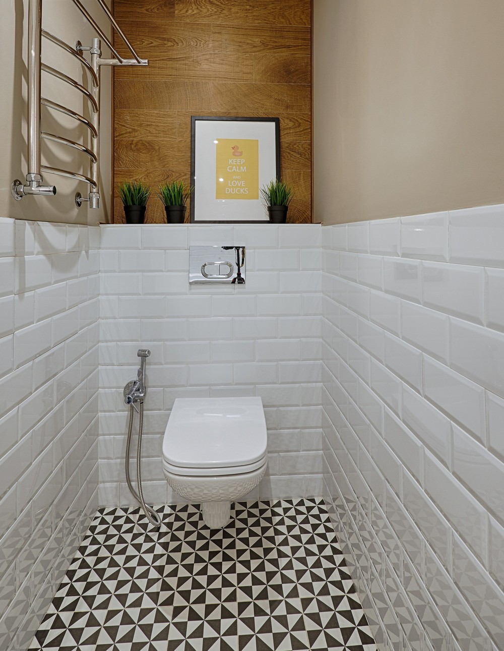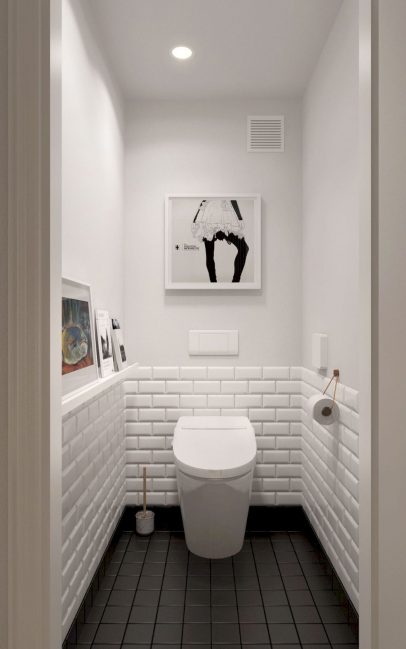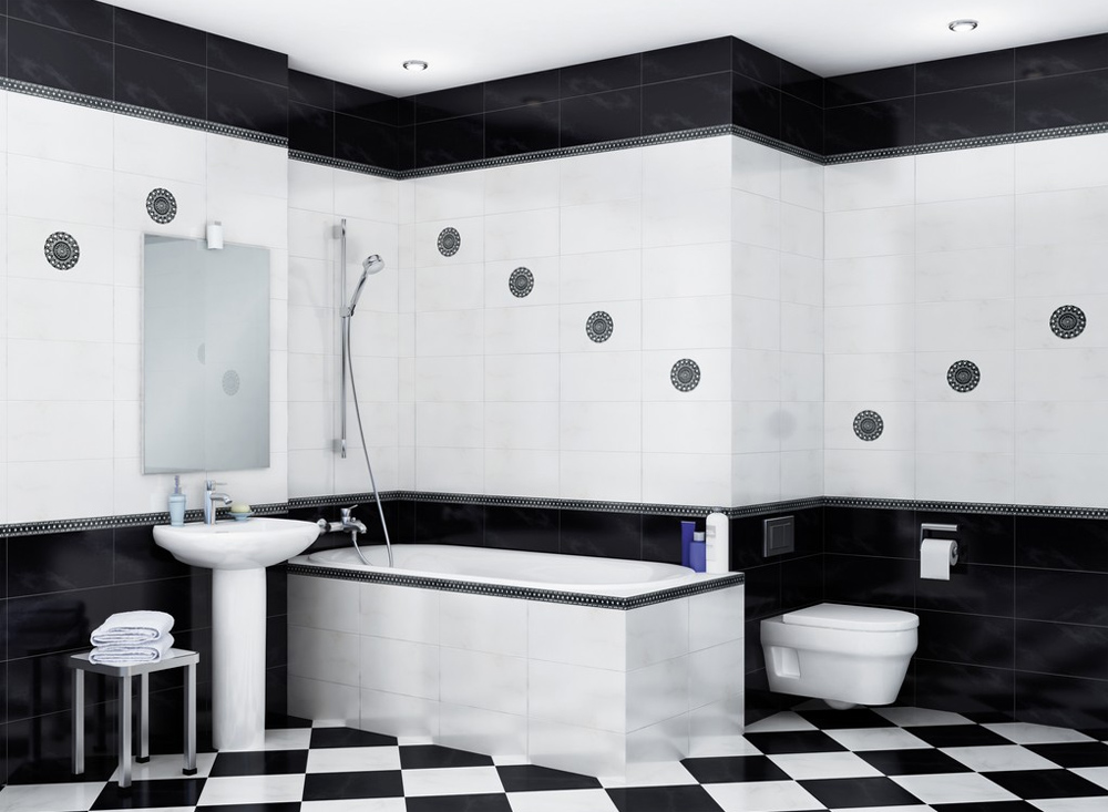 WC também pode ser revetted em preto e branco. Isso pode ser um arranjo de xadrez, listras ou técnicas de design que combinam telhas de mármore, painéis, formas incomuns de encanamento.