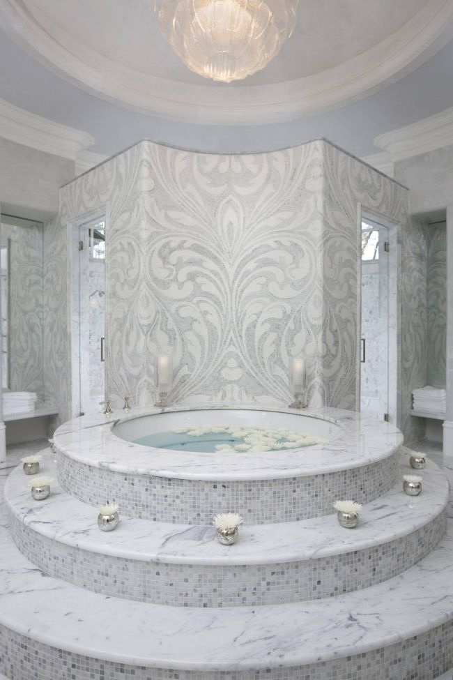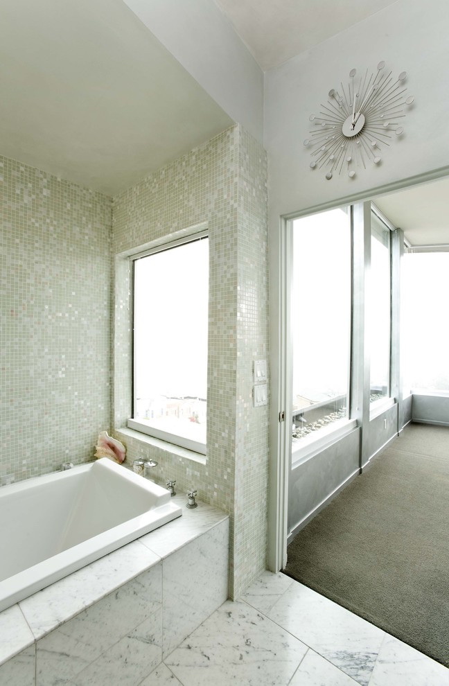 - Destacando uma das paredes com azulejos marmoreados, você pode se concentrar nela em vez de desviar a atenção de outras paredes. Um efeito semelhante é criado usando o lado a lado mural.