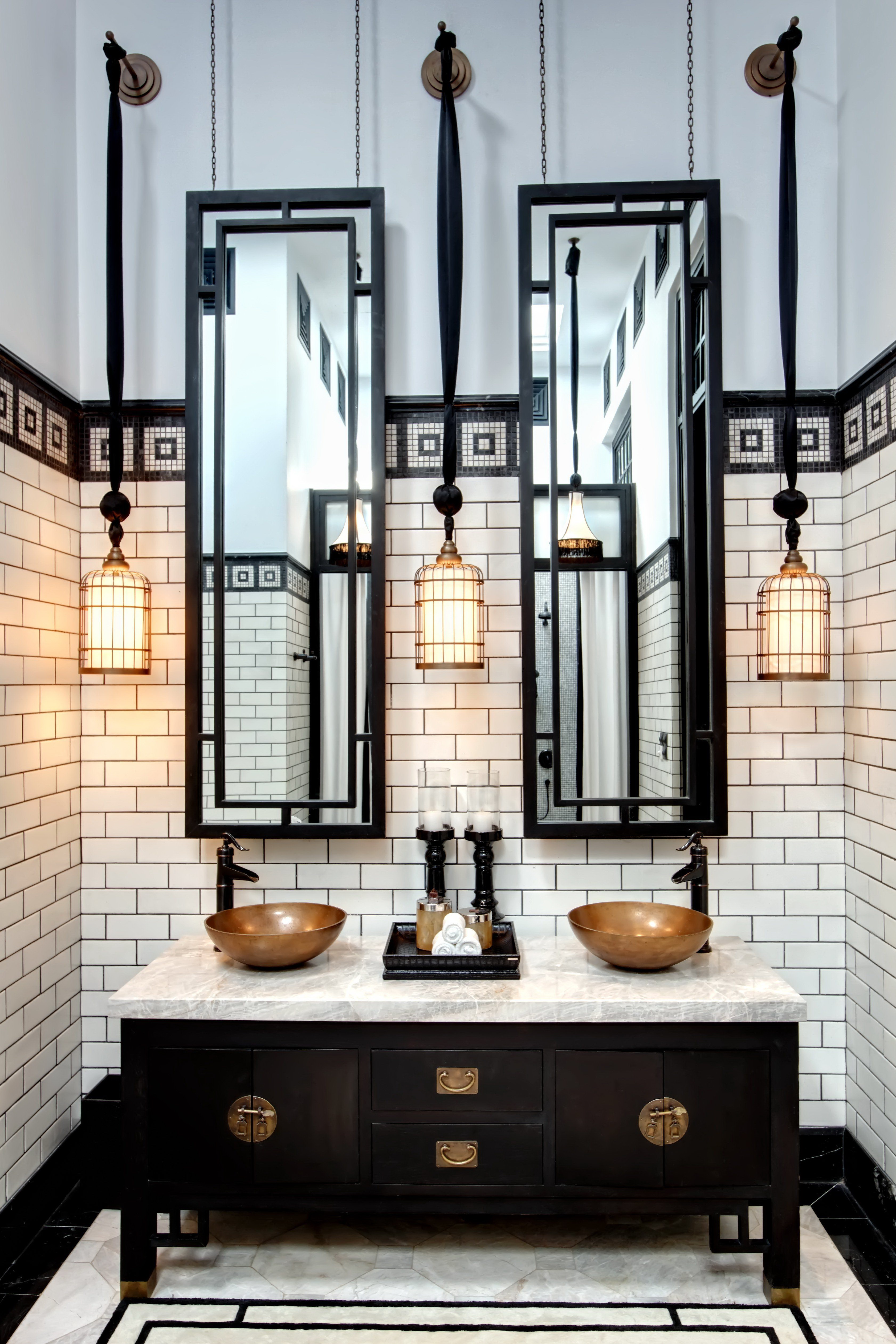Banheiro preto e branco - a personificação da sofisticação e bom gosto. Este interior respeitável enfatizará a presença de bom gosto e não passará despercebido pelos convidados.