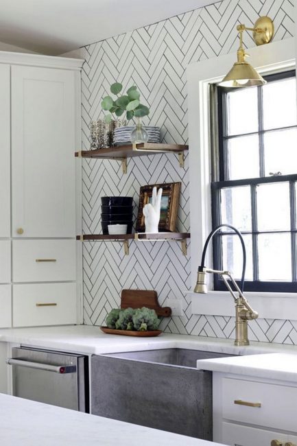 Ladrilhos brancos podem ser adicionados ao interior existente. O azulejo de um tom de luz pura proporcionará um conforto a uma atmosfera de cozinha e boa iluminação às superfícies de trabalho. Você pode usá-lo não como uma cor monocromática, mas também em combinação com outros tons.