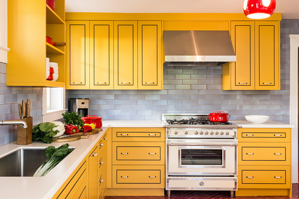 Como uma cor para destacar, você pode tirar tanto preto clássico e brilhante - laranja ou amarelo. Para que todo o interior seja harmonioso, este tom pode ser repetido em outros objetos: a cor dos móveis, portas, toalhas.