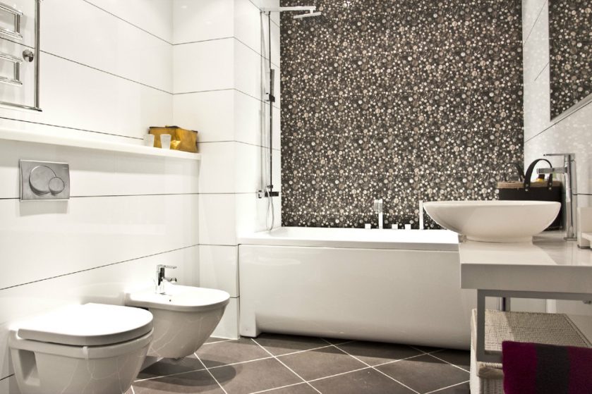 Este esquema de cores é um dos mais complexos e originais. Usando não apenas tons contrastantes, mas também cinza intermediário, você pode tornar o design elegante e diferente dos outros. Para fazer isso, você deve selecionar cuidadosamente não só as telhas e louças sanitárias, mas também acessórios.