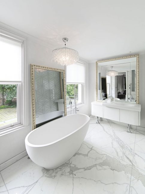 A imitação de mármore nobre parece não só na decoração do chão, mas também nas paredes. Além disso, um padrão similar pode ser combinado com superfícies monocromáticas de cor escura ou clara.