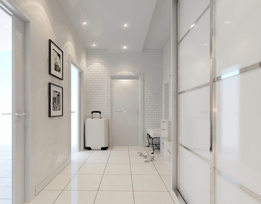 Um tom tão universal, como o branco, tem suas desvantagens. Se for selecionado para enfrentar o chão, pode ser estampado, especialmente no corredor. Com paredes escuras, um piso muito claro atrairá a atenção, o que pode nem sempre ser apropriado.