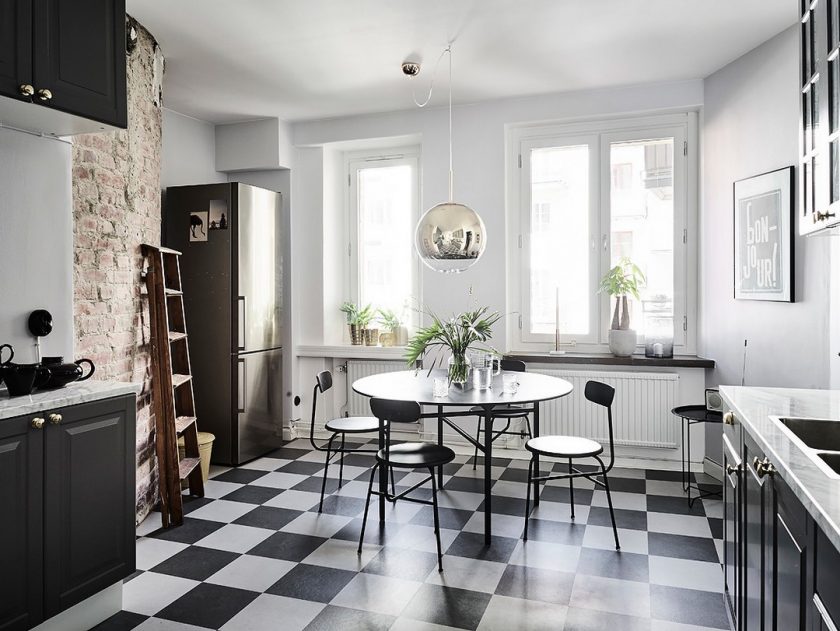 Azulejos pretos e brancos podem ter a mesma variedade de combinações na cozinha como no banheiro. A diluição de um tom claro de escuro pode afetar não apenas o piso ou as paredes, mas também tecto a cozinha. Uma decisão tão ousada exigirá um interior apropriado.