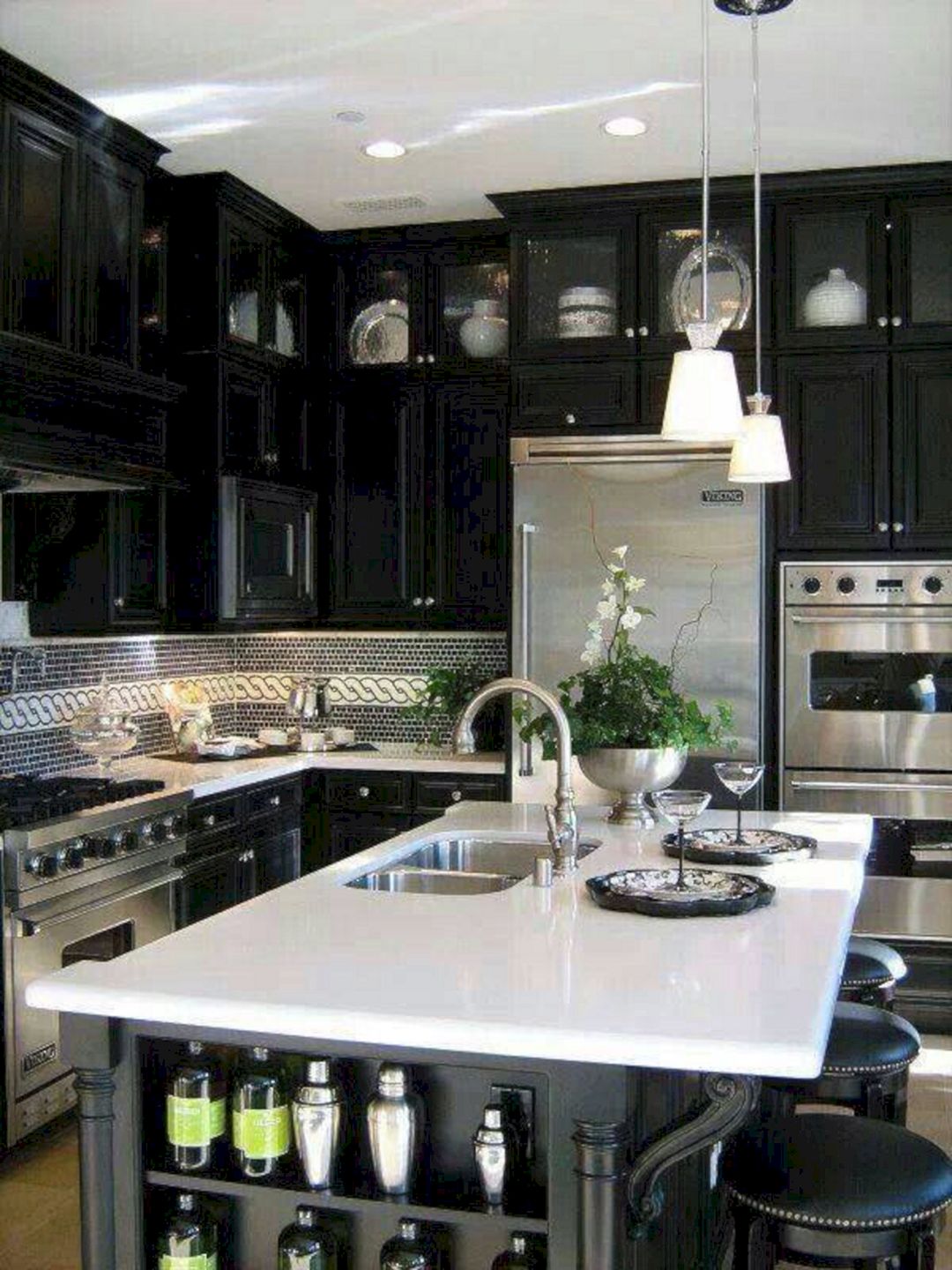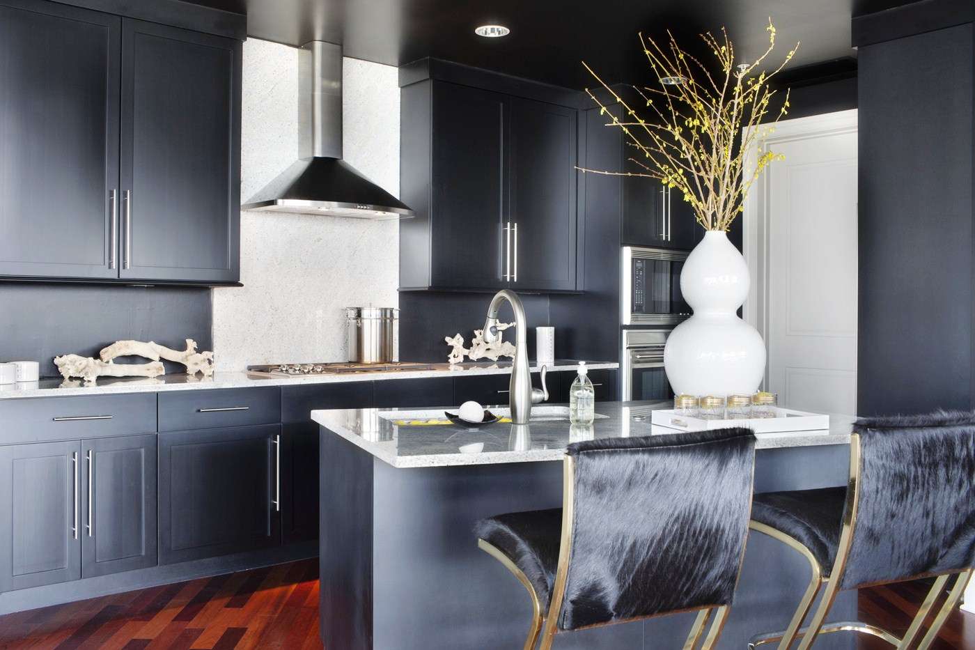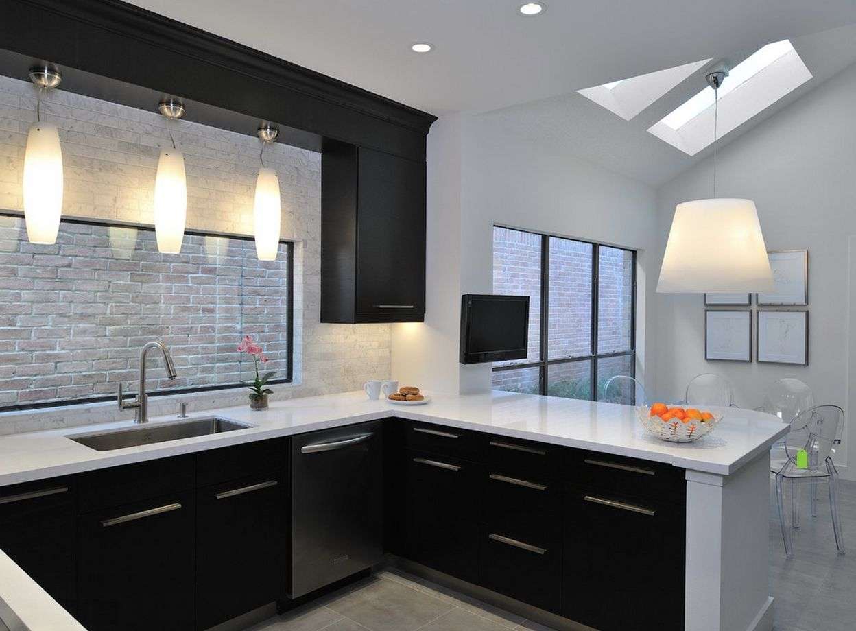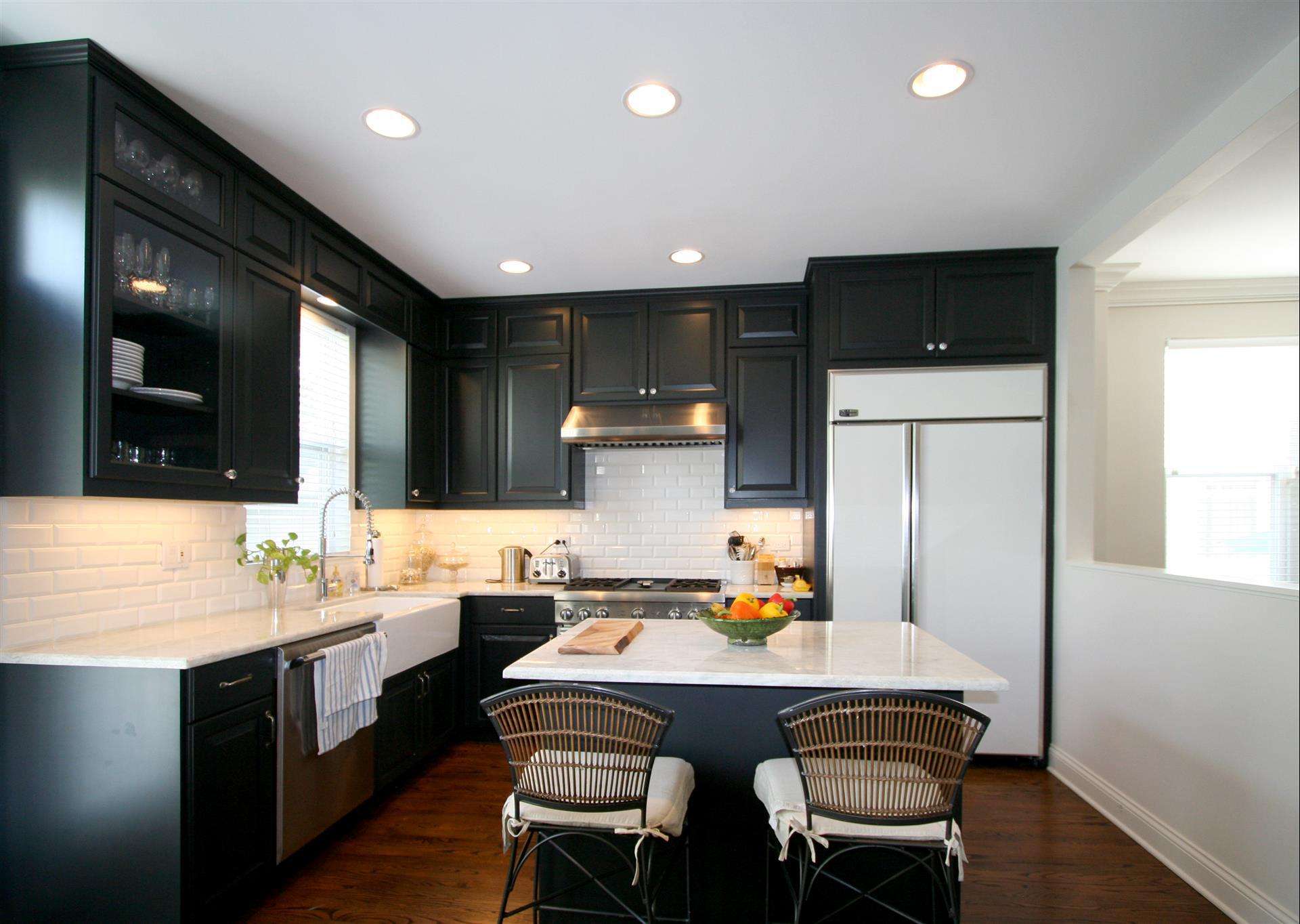 Use móveis pretos apenas na ilha central ou para o fone de ouvido inteiro para tornar a cozinha inteira um design brilhante.