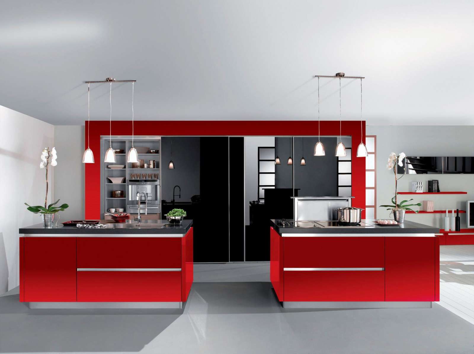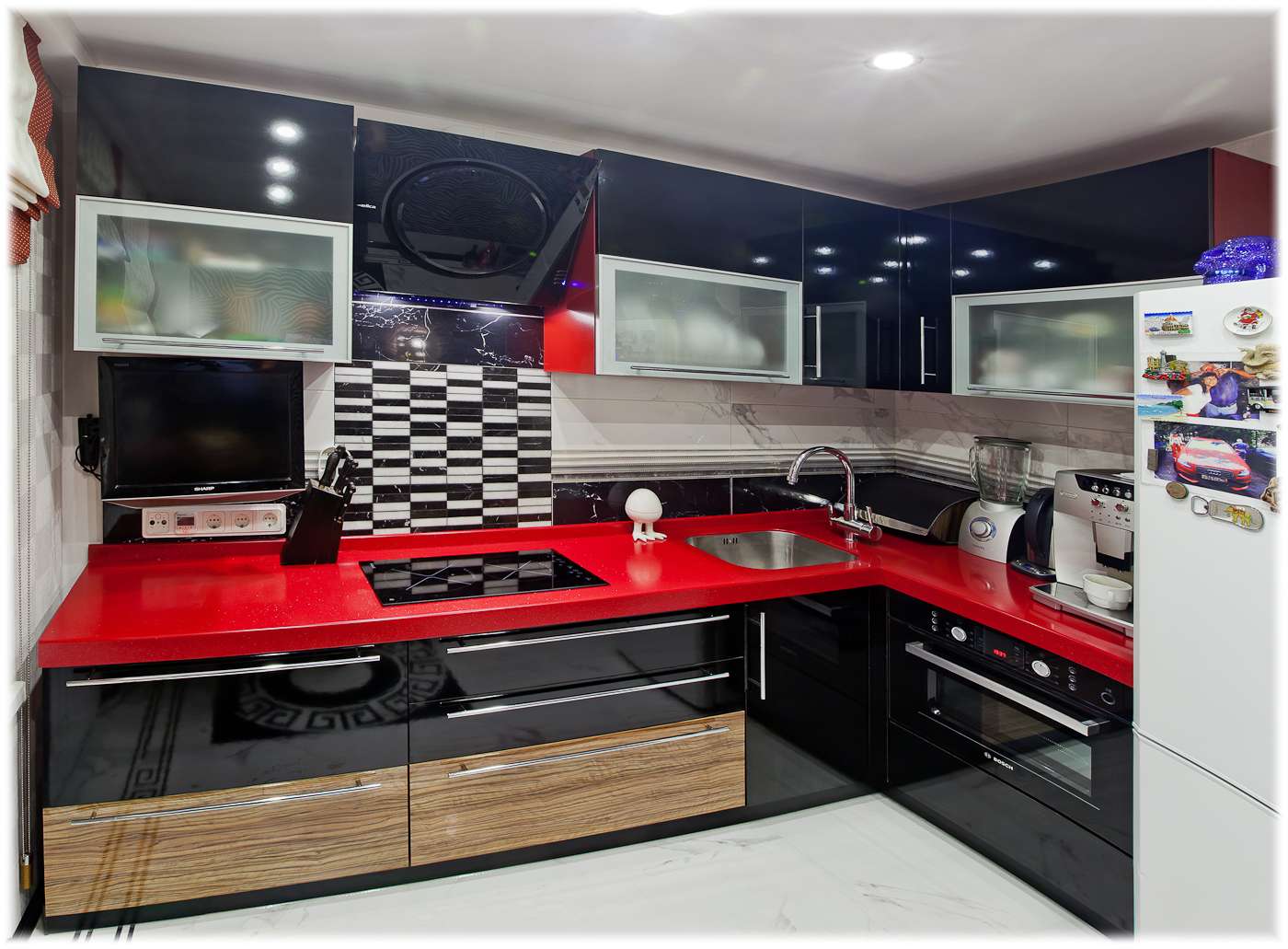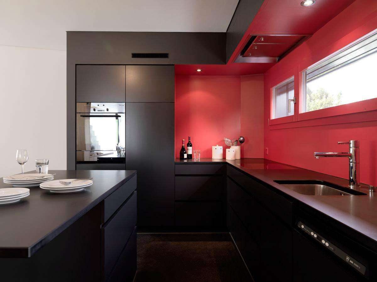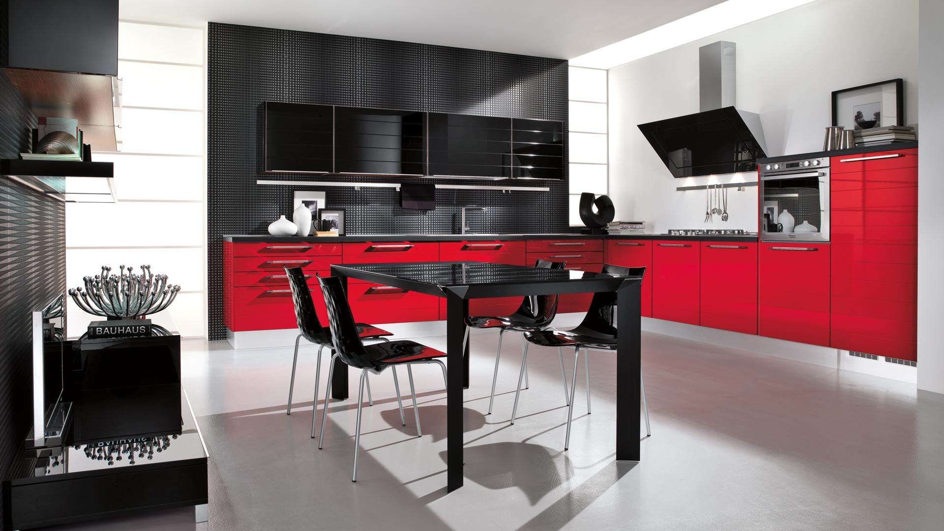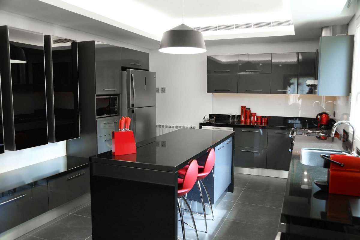 Uma das combinações de cores incomuns que as pessoas escolhem quando projetam uma casa. A combinação vermelha e preta é considerada a combinação mais expressiva no mundo do design de interiores.Esta cozinha será uma excelente escolha para as mulheres que amam estas duas cores.