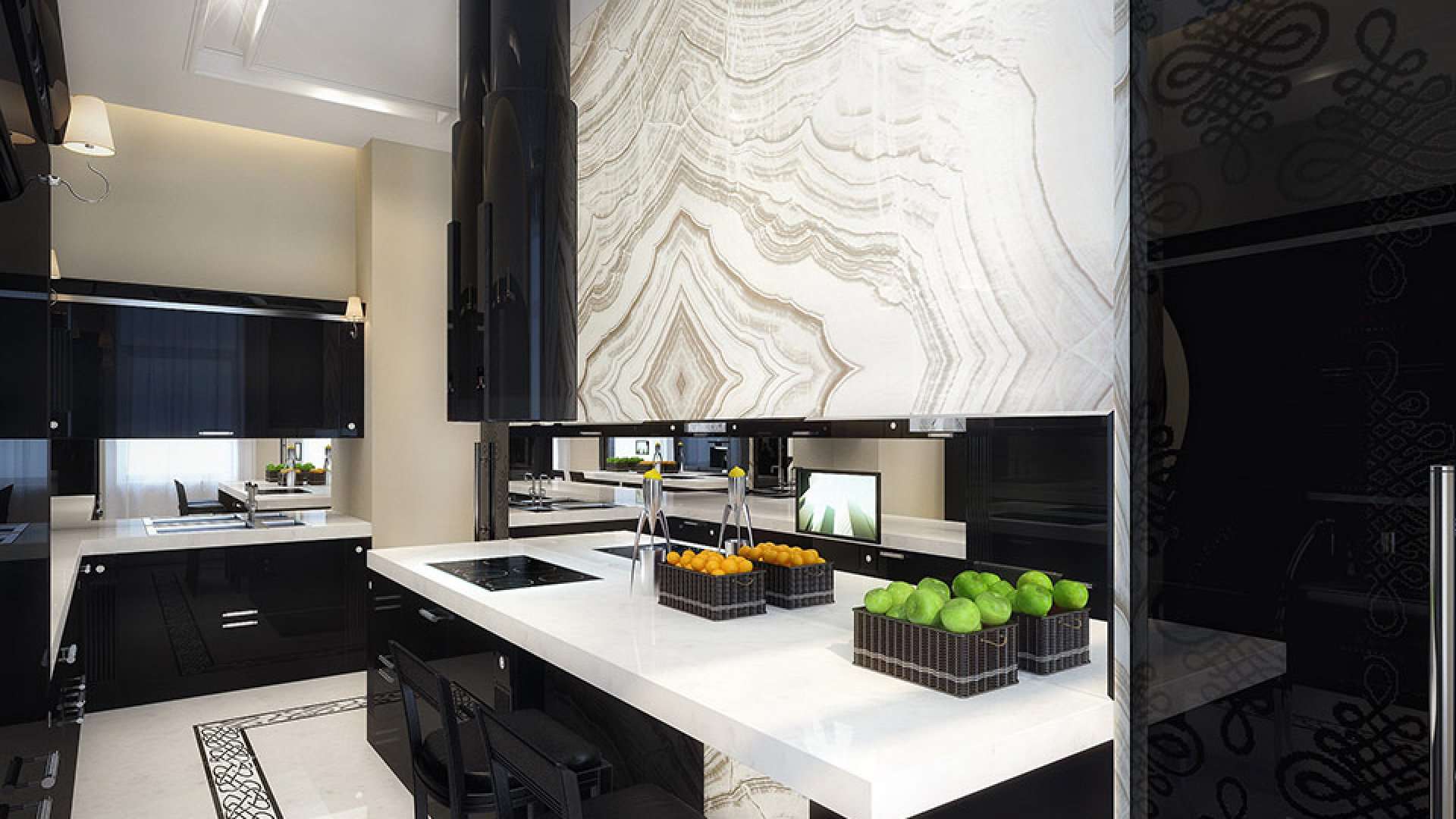 Eles também ajudam a enfatizar claramente o design, como o dourado e o equipamento, e também contrastam bem com as bancadas de mármore.