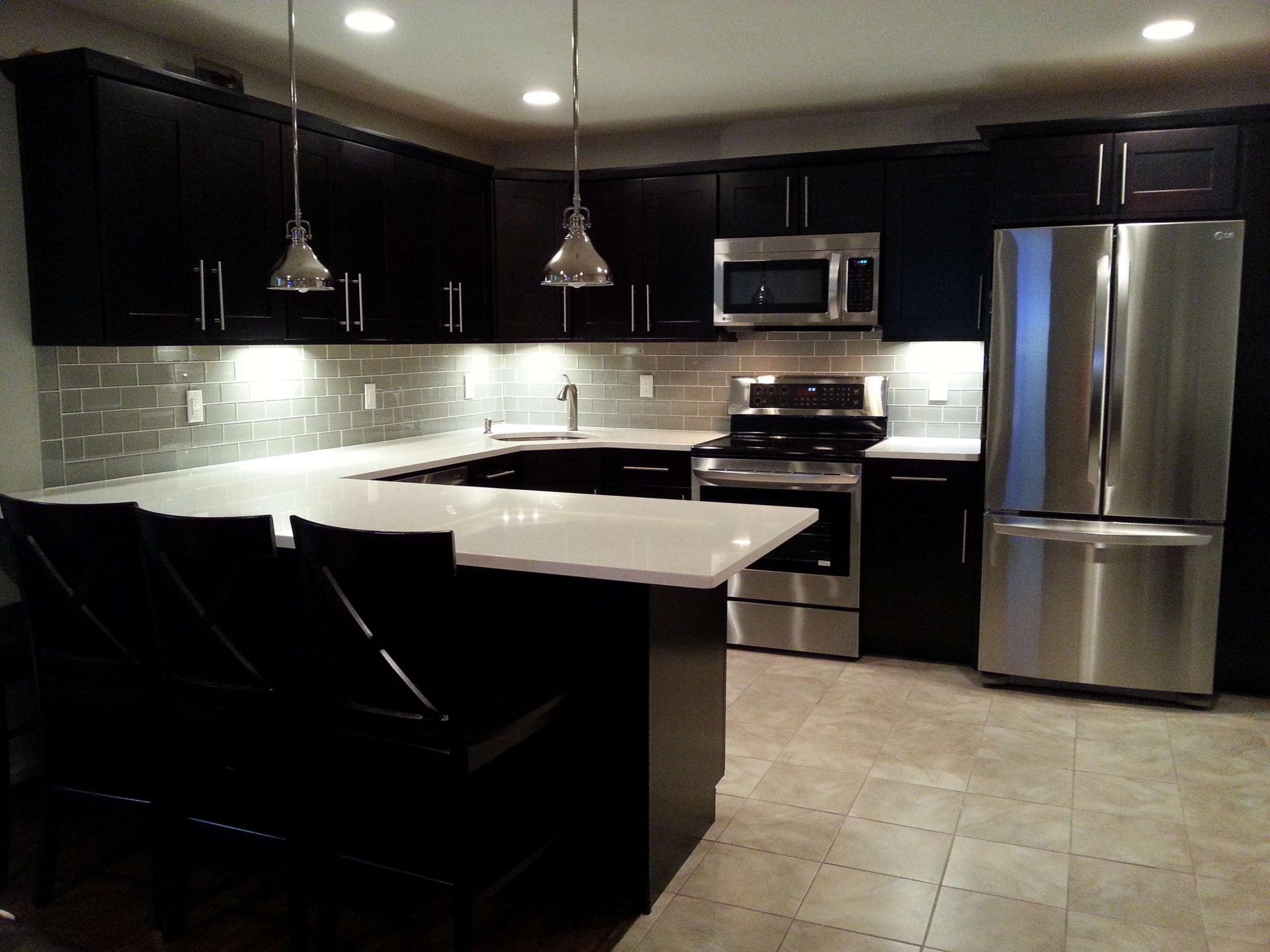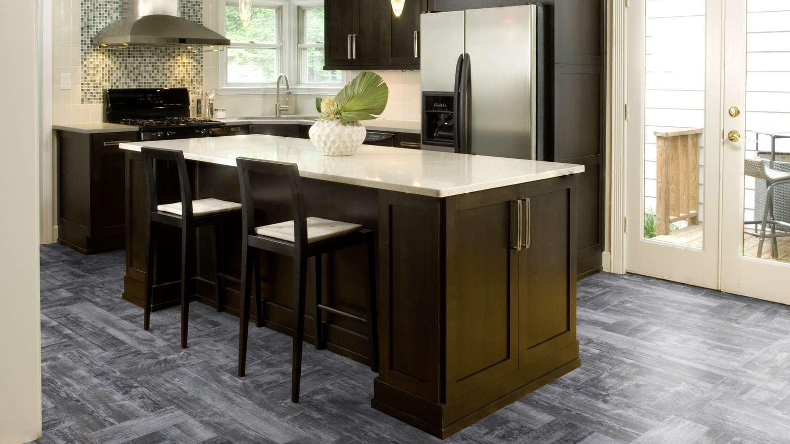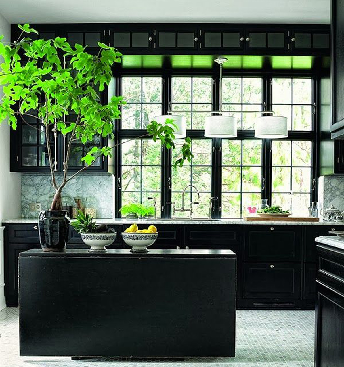 Uma afirmação ousada, gabinetes pretos ficam ótimos quando se encaixam em um piso mais claro.