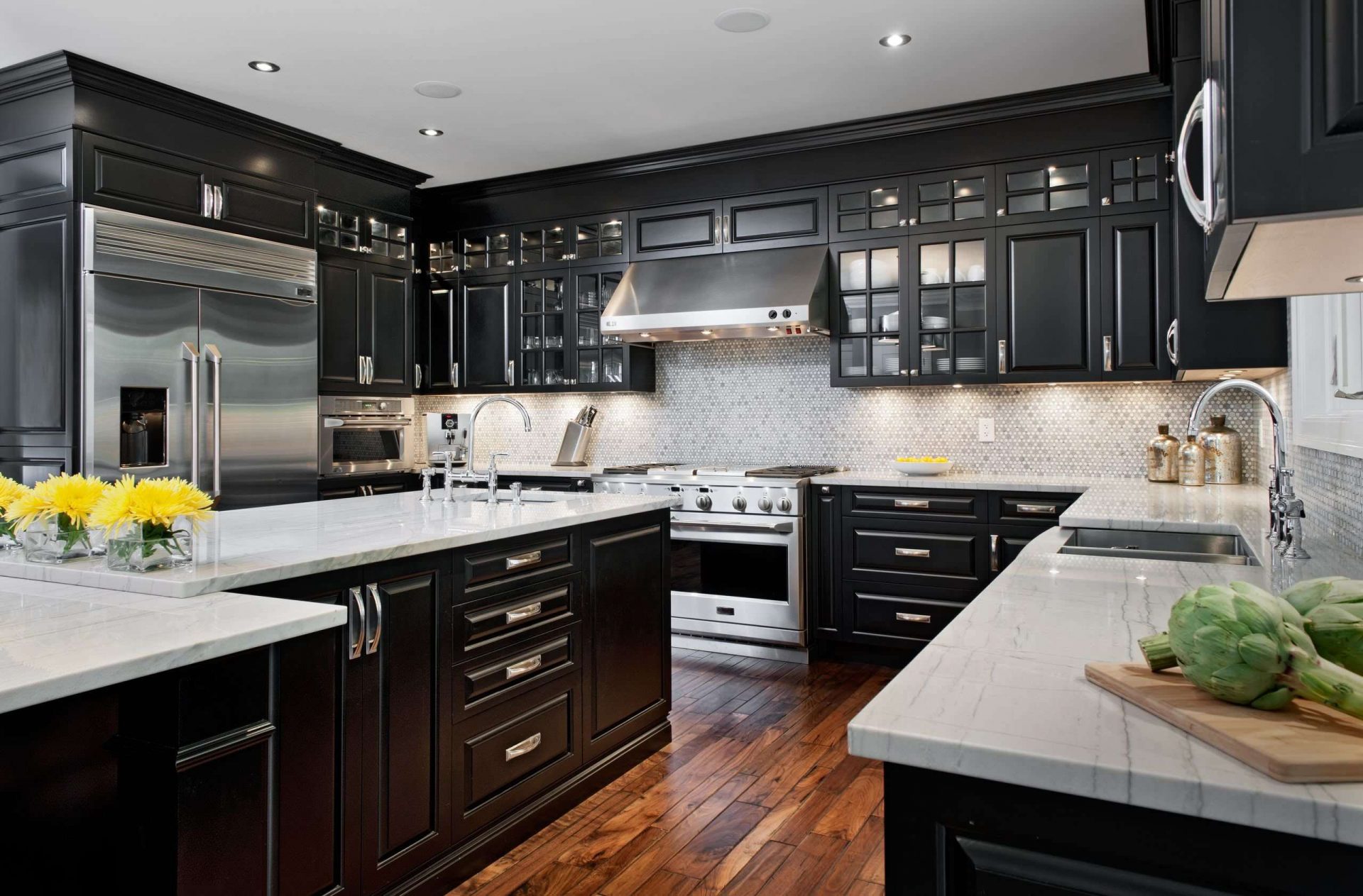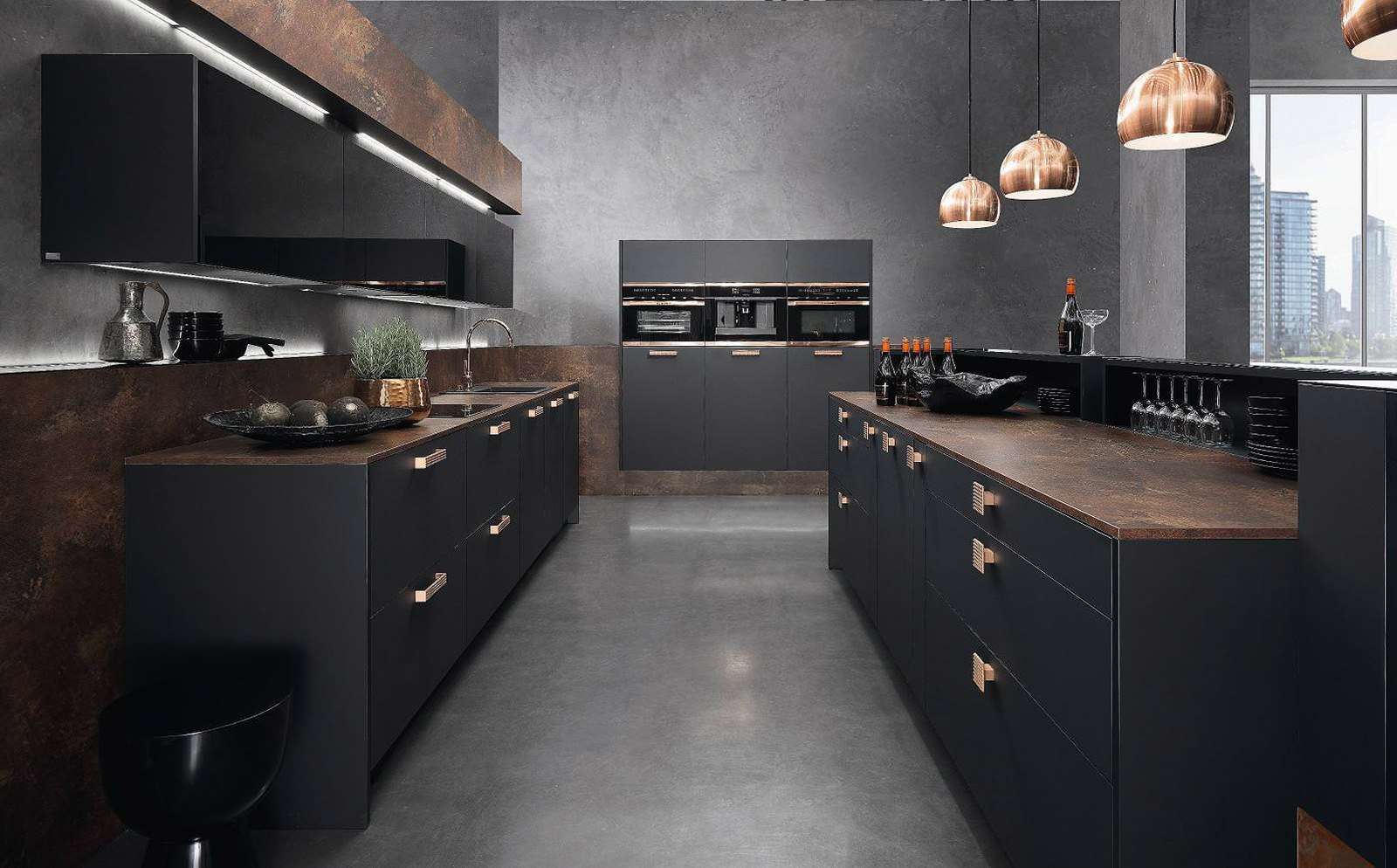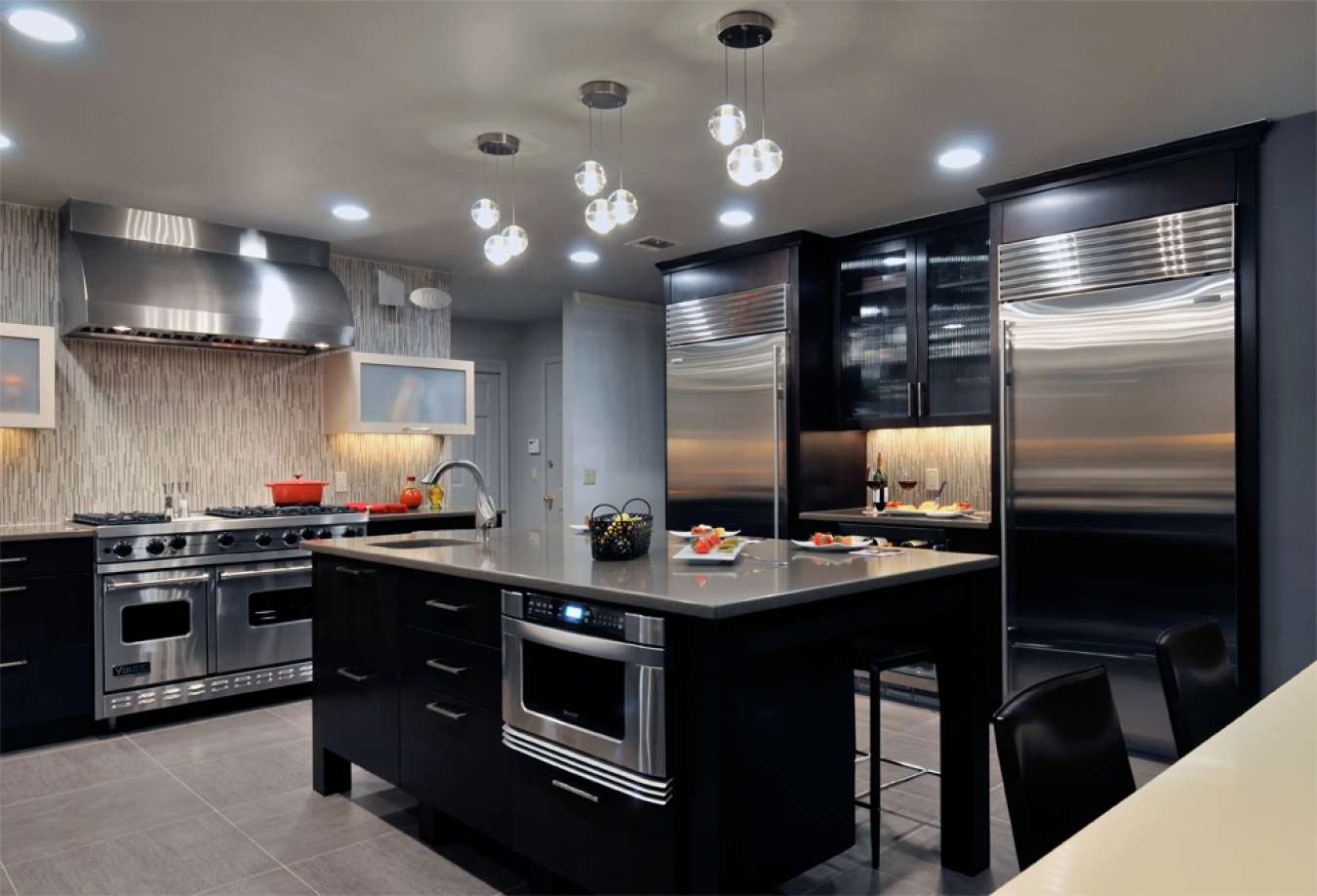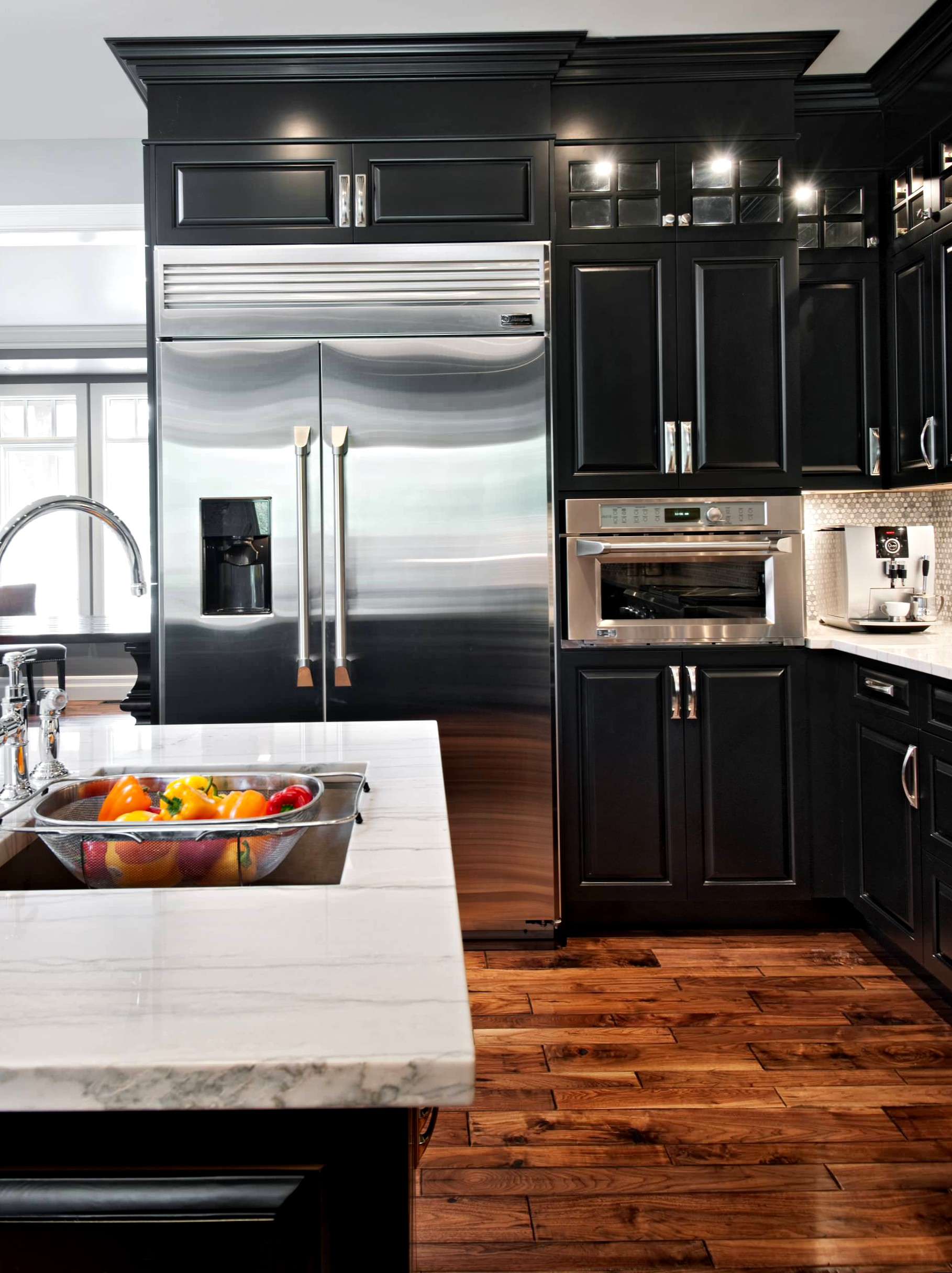 Quanto aos aparelhos, o aço escuro e o aço inoxidável são feitos sob medida. Se você usá-lo como uma ilha ou uma parede do gabinete, os aparelhos pretos serão o complemento perfeito.