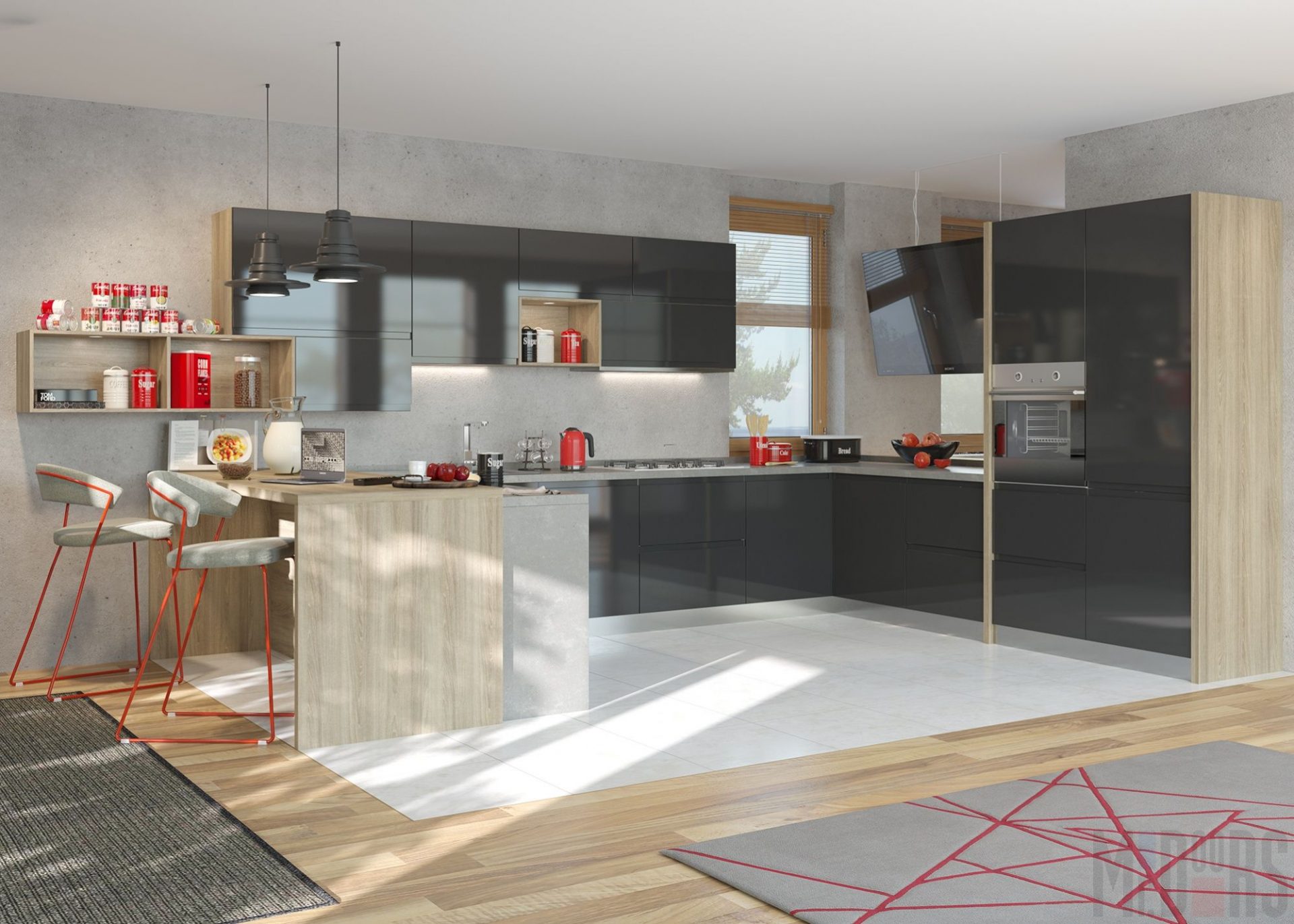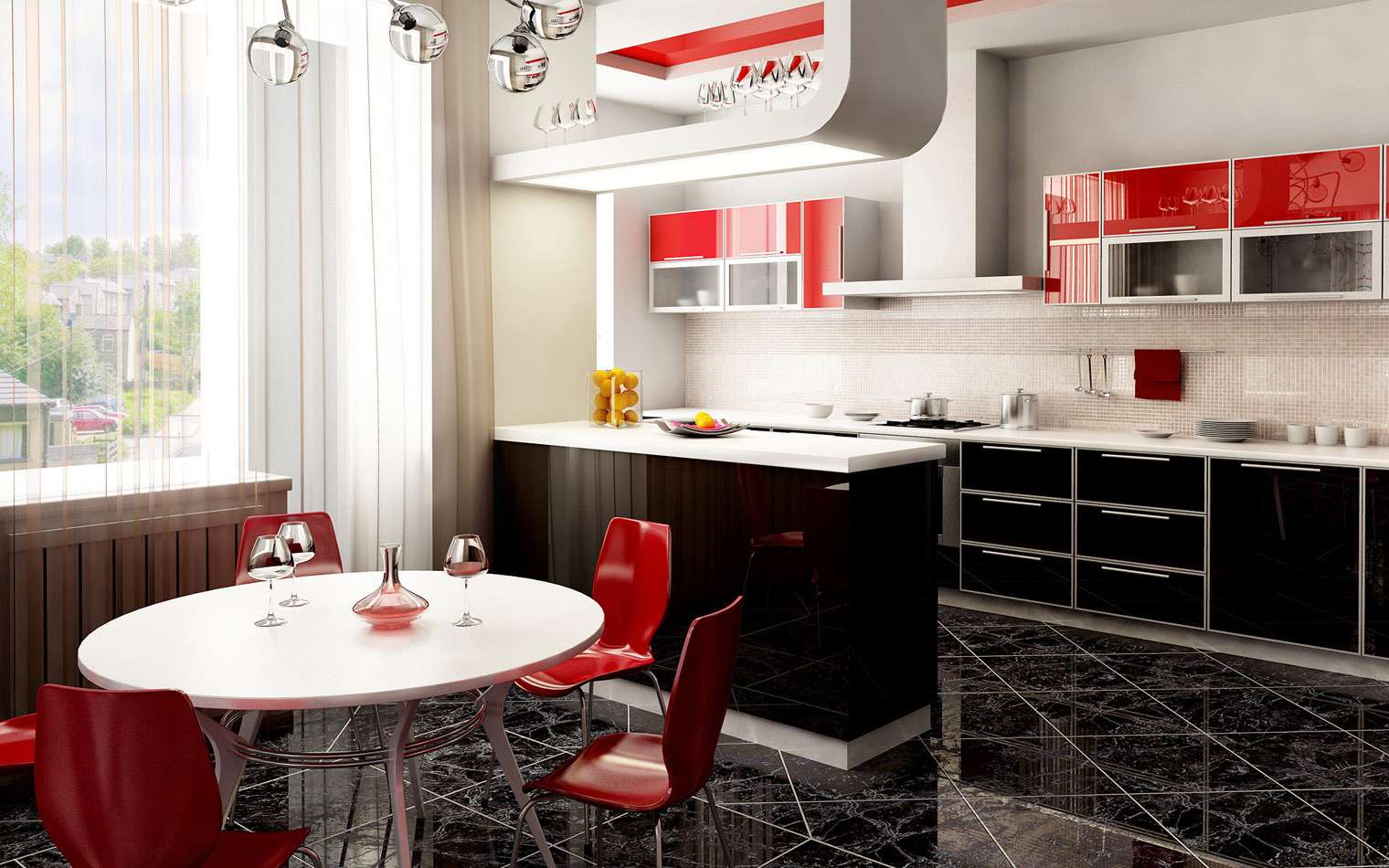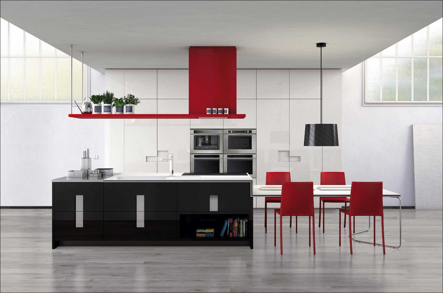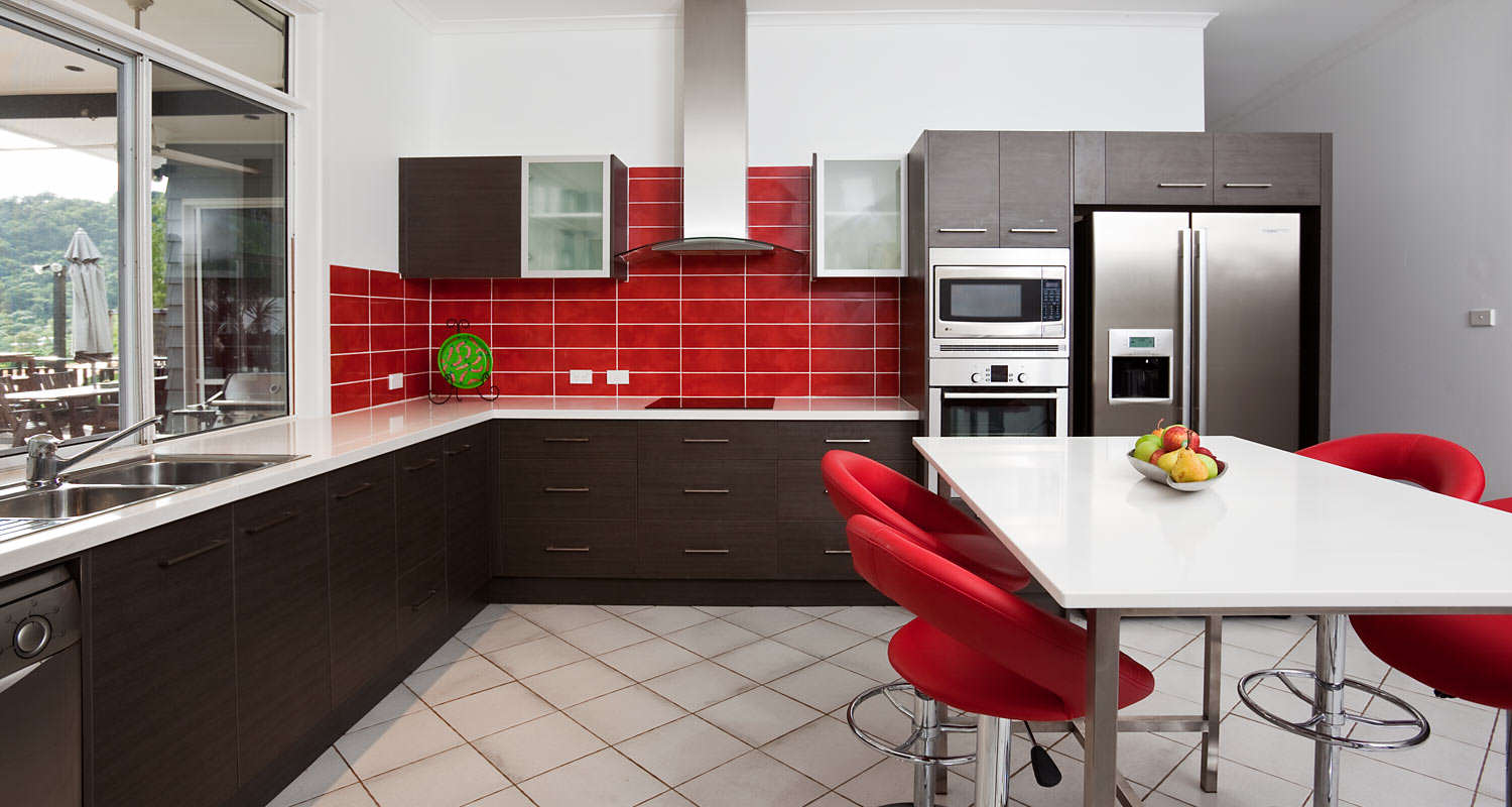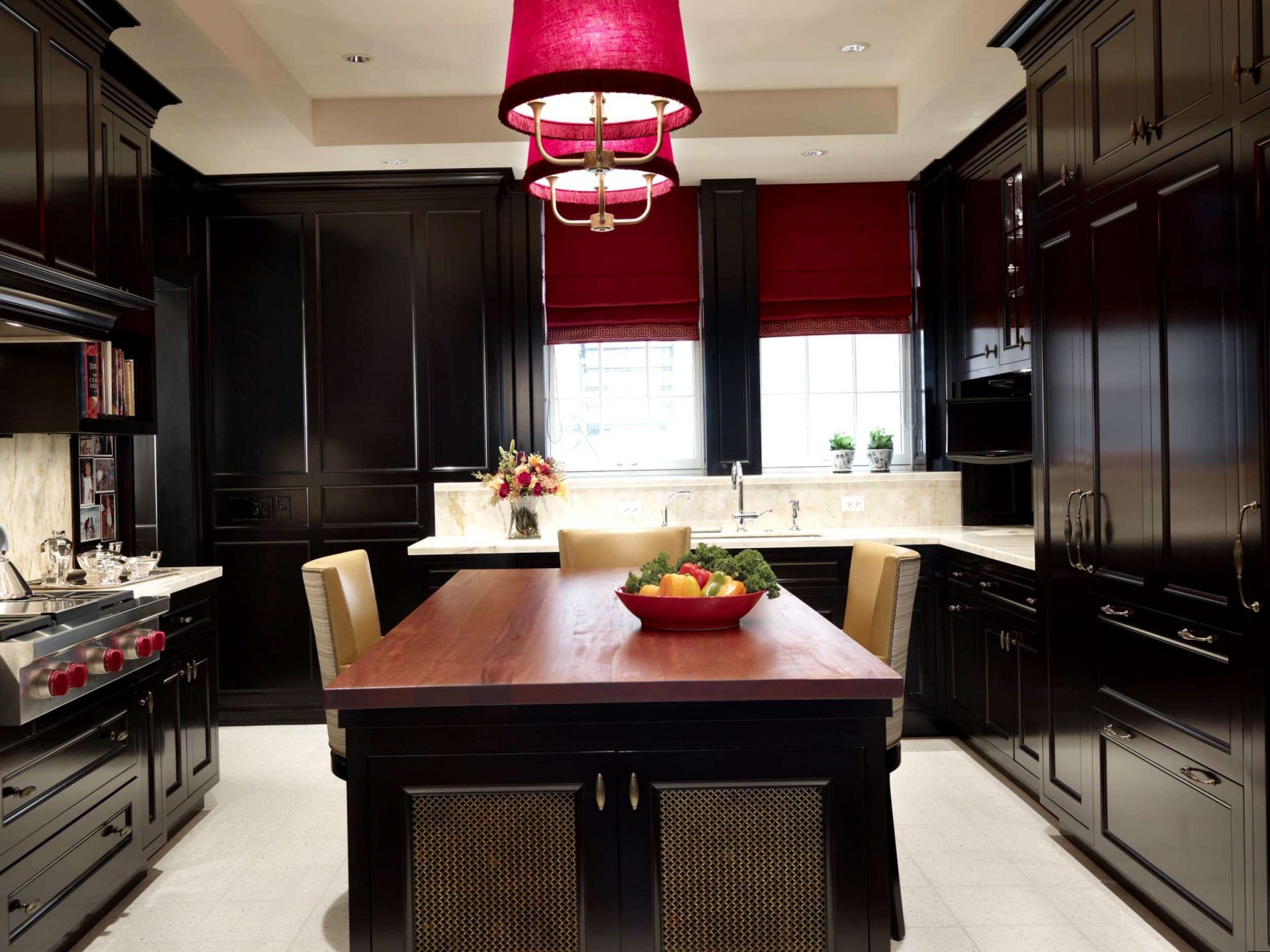 Você pode adicionar detalhes como um vaso de plantas com folhas grandes ou uma cortina branca transparente amarrada com borlas vermelhas e pretas para dar um toque suave a um design de cozinha forte.