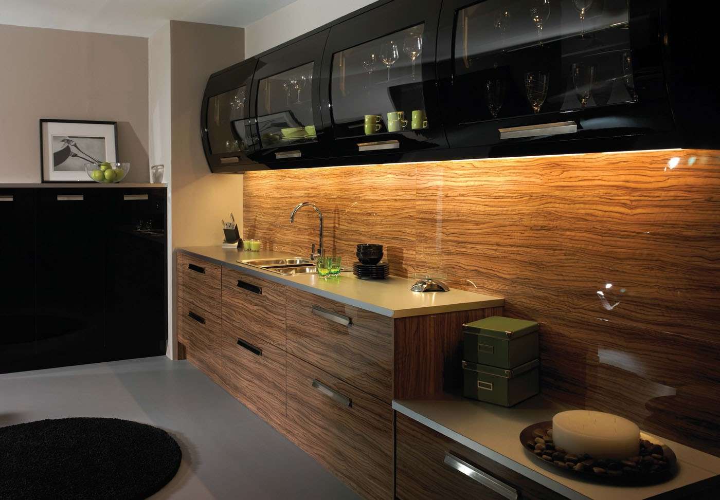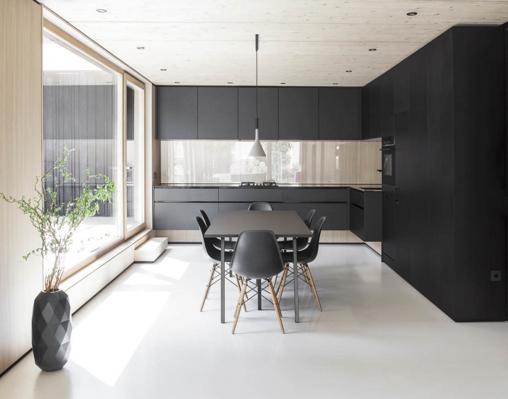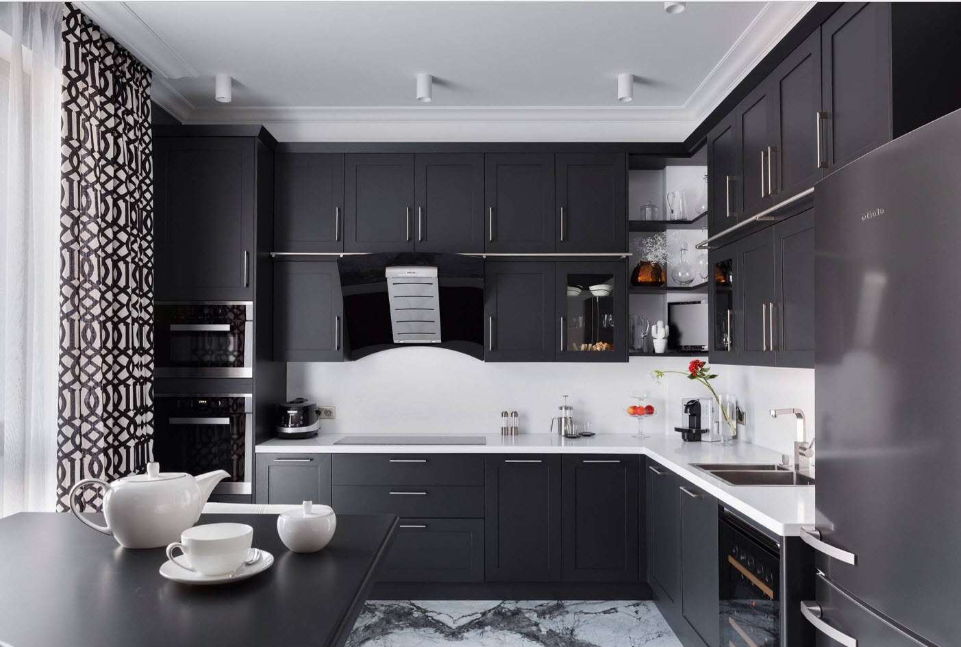 Outra coisa, se você tem armários de cozinha pretos, como o material do case. Não pode ser considerado como uma cor exclusivamente moderna, mas funciona bem em gabinetes de materiais laminados.