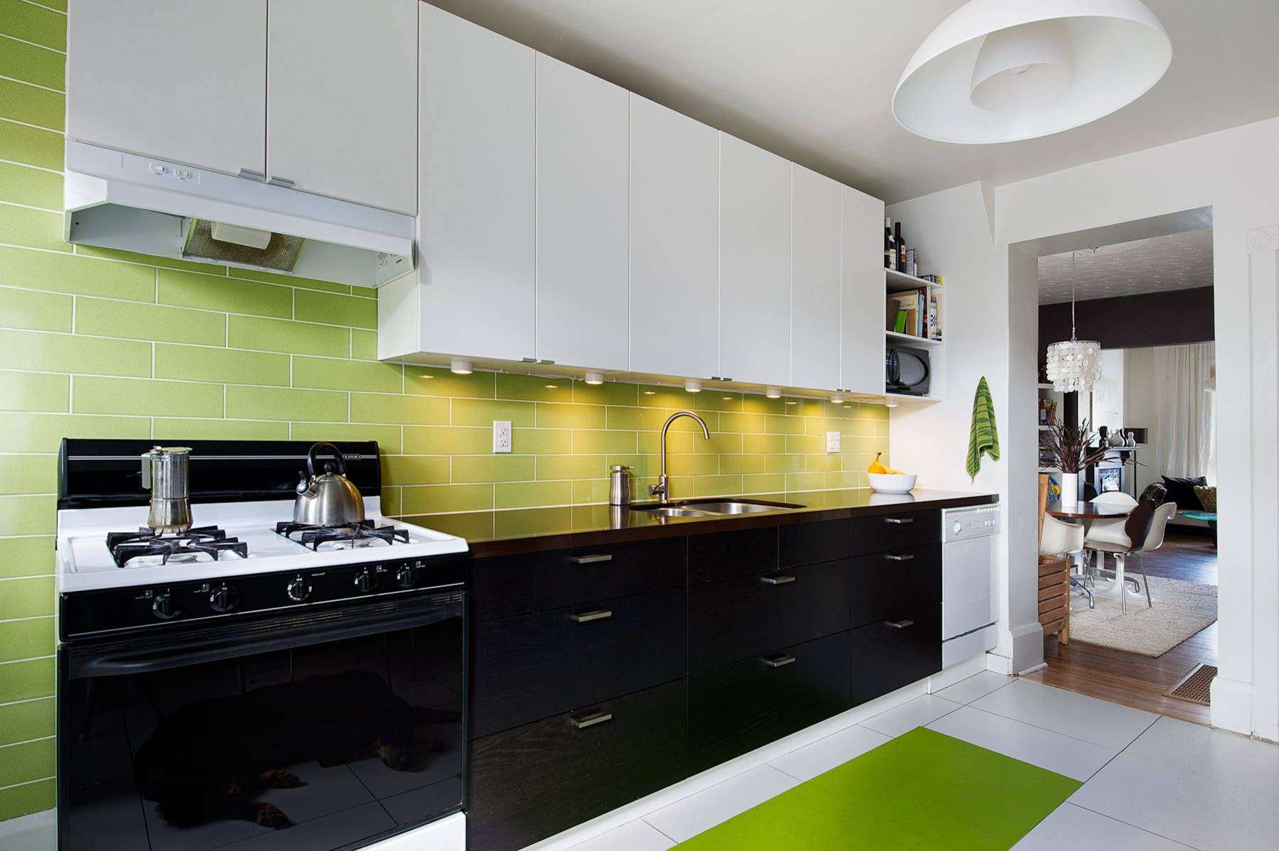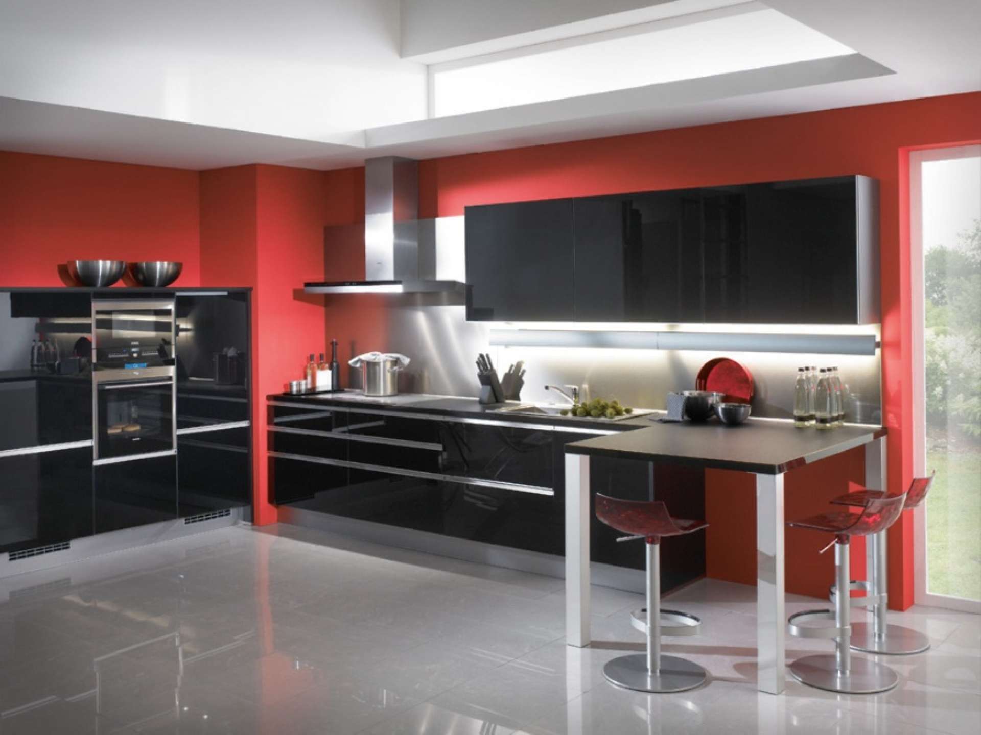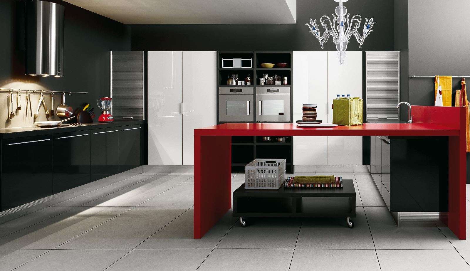 Vá para as paredes com azulejos brancos e pretos e contraste com os armários vermelhos brilhantes.