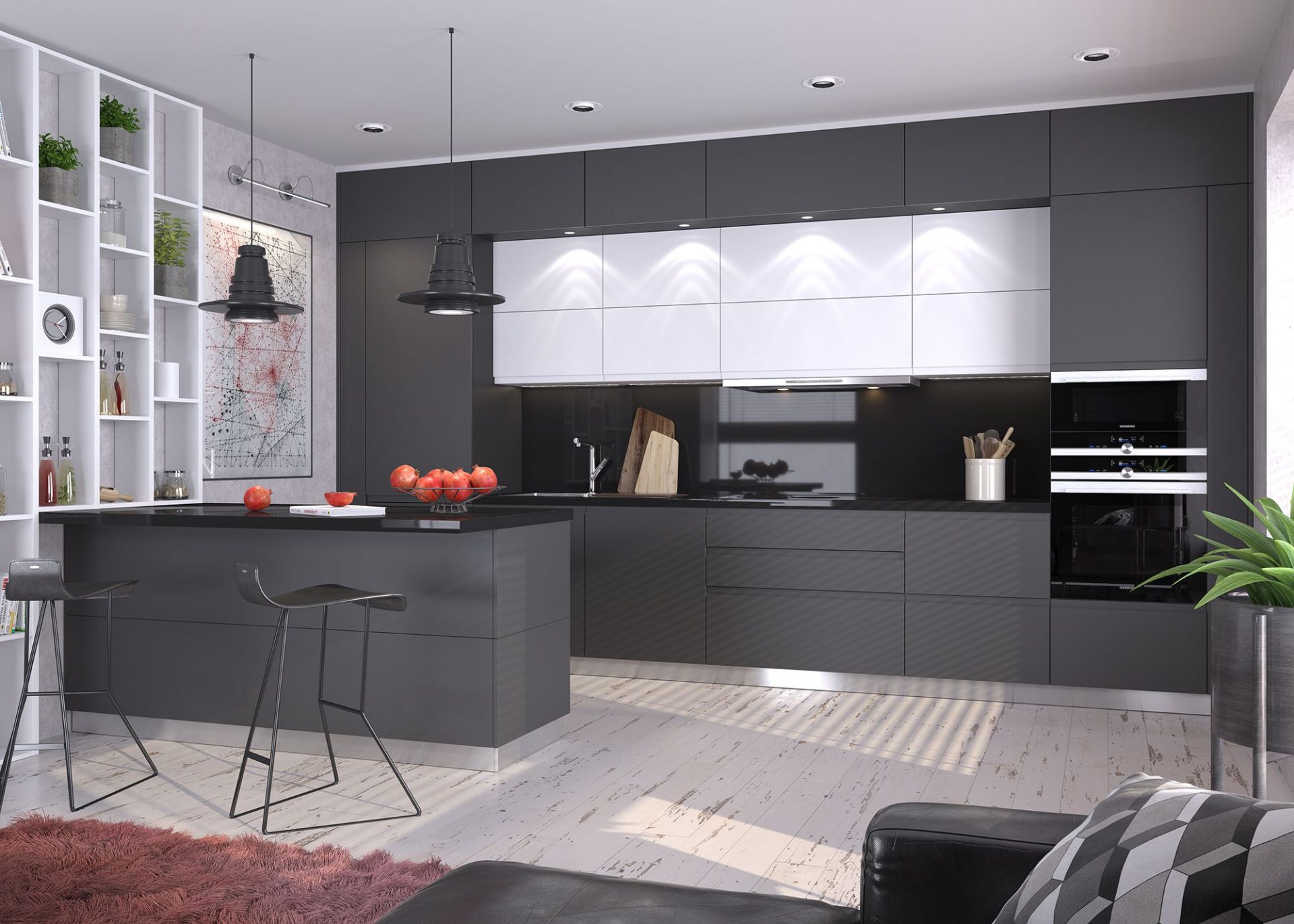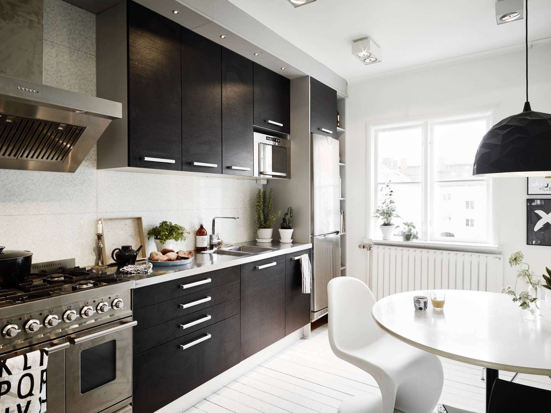 Eles ajudam a dar à cozinha uma aparência limpa e moderna, enquanto o cinza suavizado lhe dá algo mais elegante e suave para suavizar a expressividade dos tons escuros. Muito preto, como muito de uma cor diferente, pode ser esmagador. Sua proporção depende da declaração que você quer fazer e o que você quer transmitir na sala.