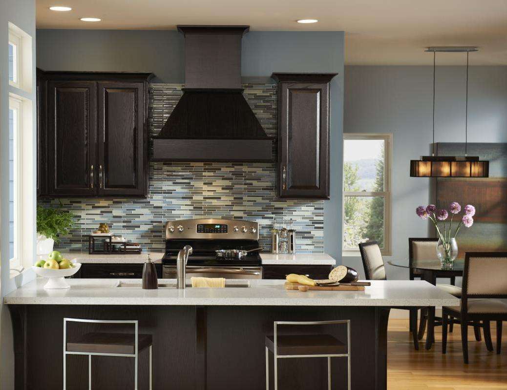 Quanto às bancadas, se você estiver configurado para granito ou sabão pedra, então não escolha um gabinete da mesma cor. Bancadas de cores claras, como granito de cor clara com manchas escuras ou mármore - se você está pronto para gastar dinheiro - contrastam bem com um conjunto escuro.