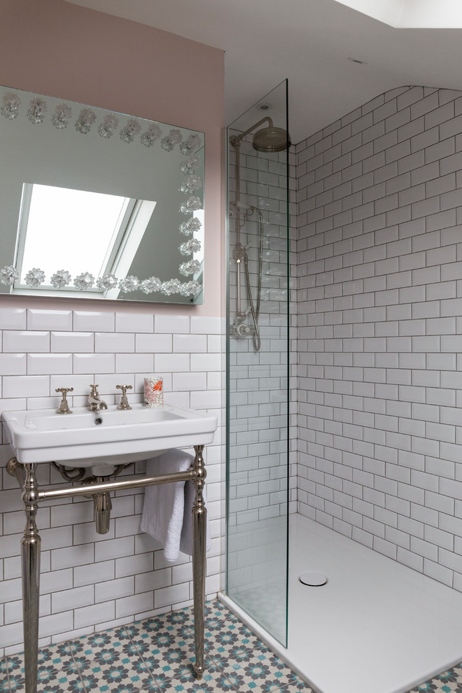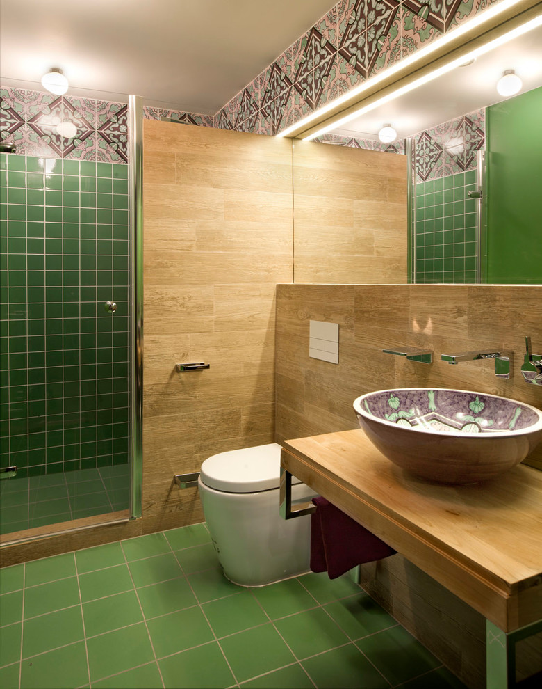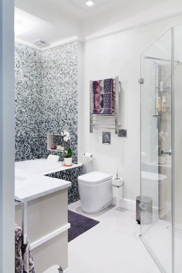 Mosaico com azulejos oblongos em um design vertical ajudará a ampliar o espaço visualmente para cima.
