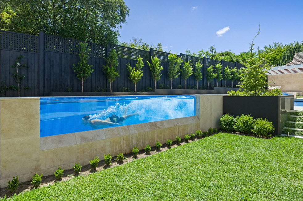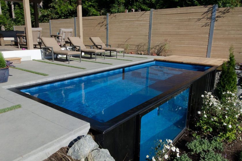 Há piscinas feitas de contêineres metálicos ferroviários, com a parte superior cortada na altura desejada. Essas piscinas podem ser totalmente ou parcialmente enterradas no solo ou simplesmente instaladas em uma área de solo planejada.