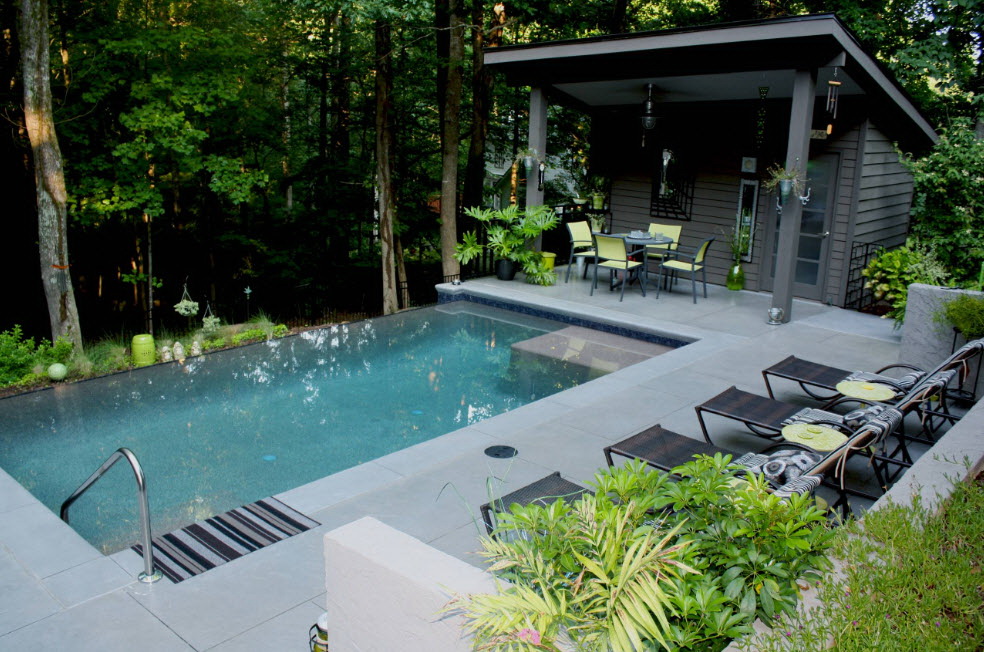 Durante a construção da piscina na dacha, forneça escadas, corredores e escadas. Eles irão fornecer entrada segura e sair de um reservatório artificial do lado de fora e dentro.