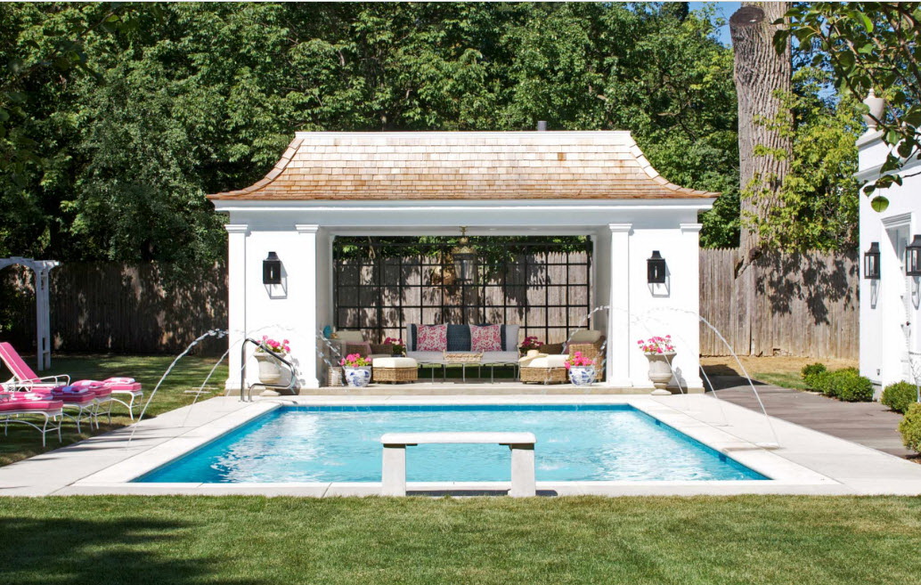 Estruturalmente, a construção leve acima da piscina pode ter uma configuração de empena com um frontão, quadril, redondo - na forma de um sistema de tenda ou yurt, arqueado ou semi-arqueado. Trilhos laterais podem ser: