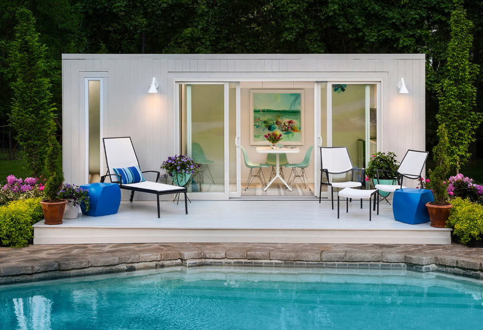 Estruturalmente, a cobertura da piscina é executada de várias maneiras. Este pode ser um edifício separado ou extensão para a casa principal. Sua fabricação é semelhante à construção de um prédio de um andar com um porão, baseado em fundações de tiras.