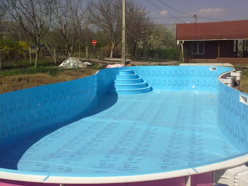 No caso mais simples, a cuba interna é revestida com filme de polipropileno ou policloreto de vinila (PVC). Há filmes produzidos especificamente para piscinas que possuem uma rica cor azul. Em uma versão mais cara, para operação estacionária de longo prazo, é usado propileno laminado, cujas costuras são soldadas com um secador de construção convencional. Acabamentos exteriores também podem ser feitos com folhas de plástico ou revestimento de plástico, que, para fins decorativos, foi pintado com um padrão ou cor.