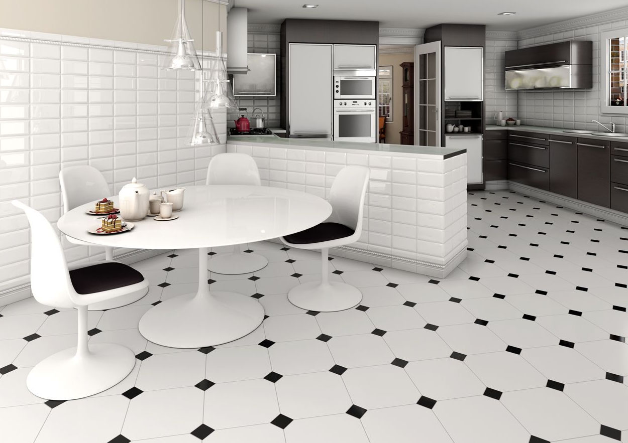 - Azulejo. Claro, a primeira coisa que vem à mente quando se tenta imaginar o chão da cozinha é azulejo. Se de uma pedra real, artificial, parecerá bem de qualquer maneira e servirá por muito tempo. É muito fácil lavar algo de cima que é muito fácil e você pode usar qualquer química. Além disso, é longo e desgastado. O único ponto negativo é que, se você deixar cair algo pesado no ladrilho, ele rachará.