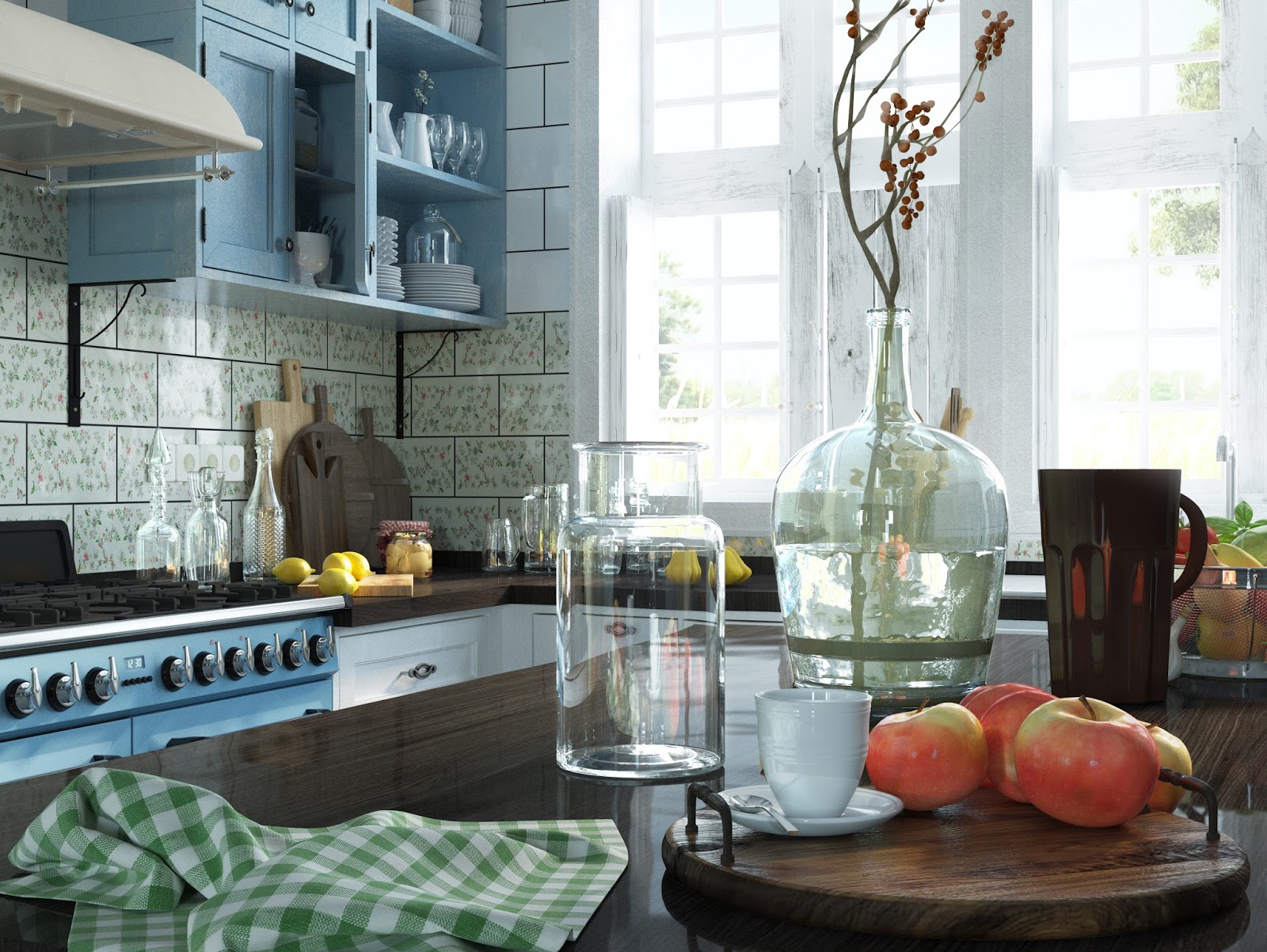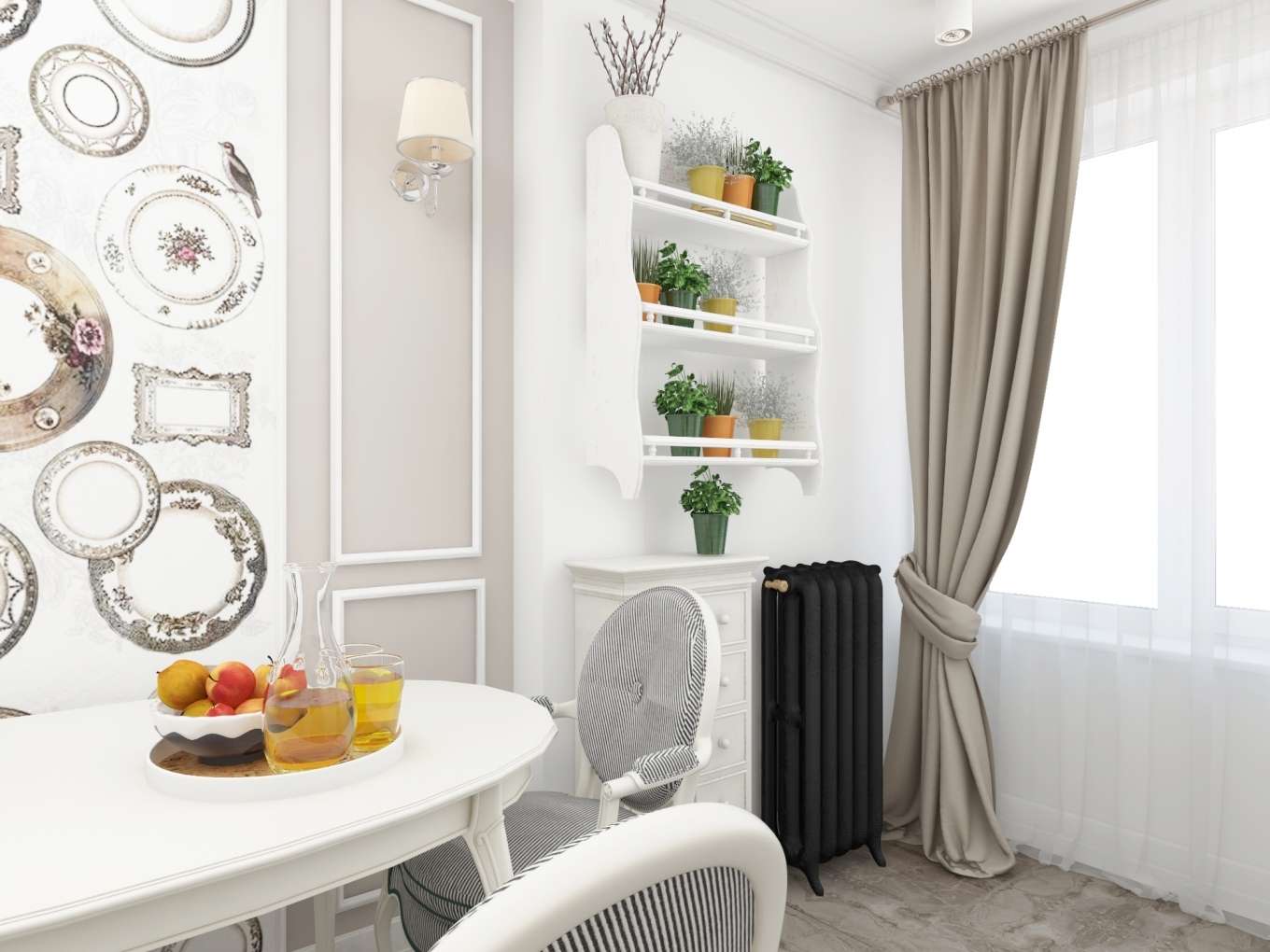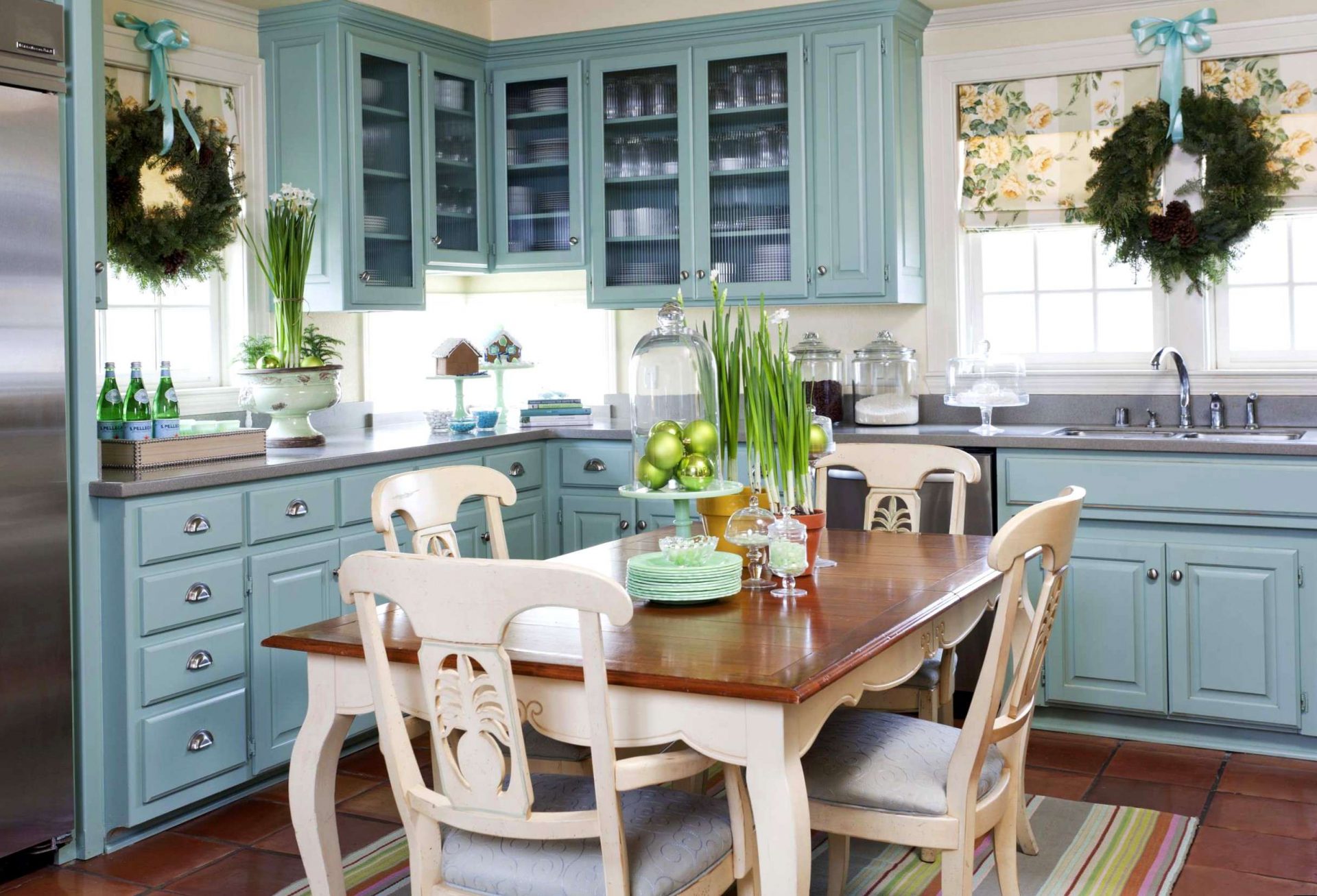 - Provença. Cores - branco, creme, azul, rosa. No chão é piso laminado, papel de parede nas paredes em flores frívolas, teto rebocado. O mobiliário é leve, de materiais naturais. Cortinas no estilo de um café, fechando apenas metade da janela. Na mesa, certifique-se de ter um vaso de flores.
