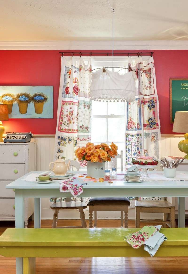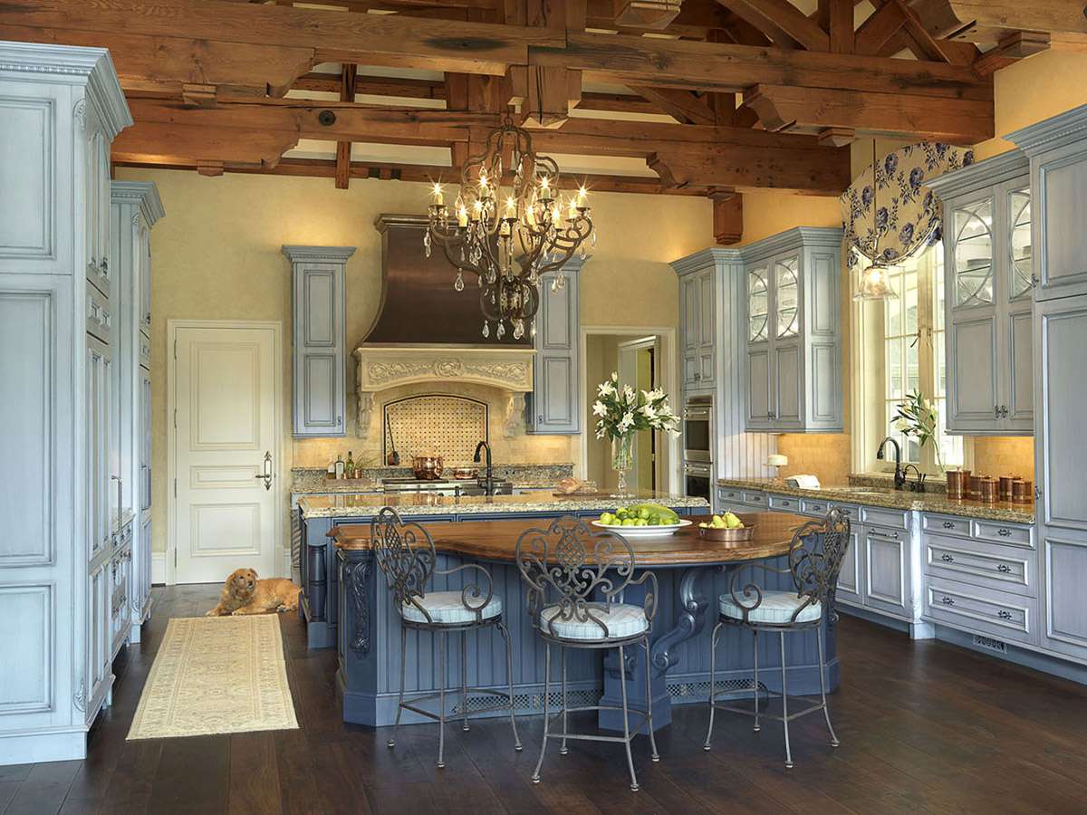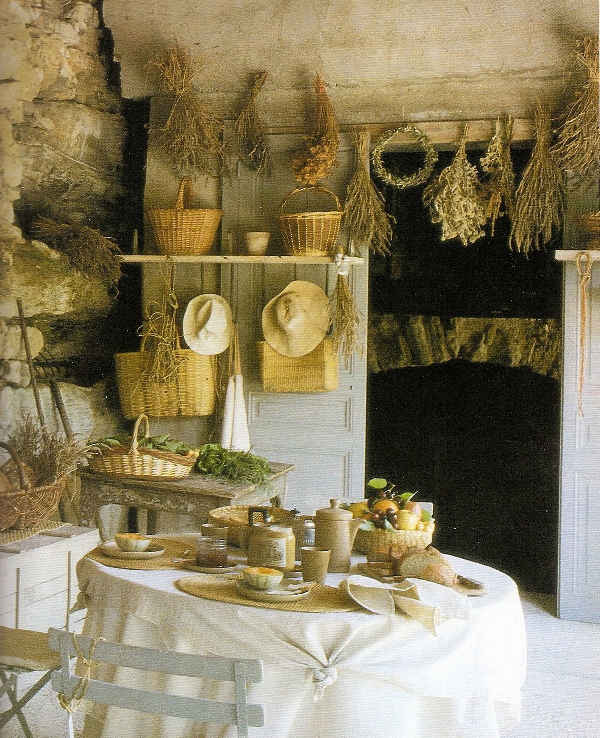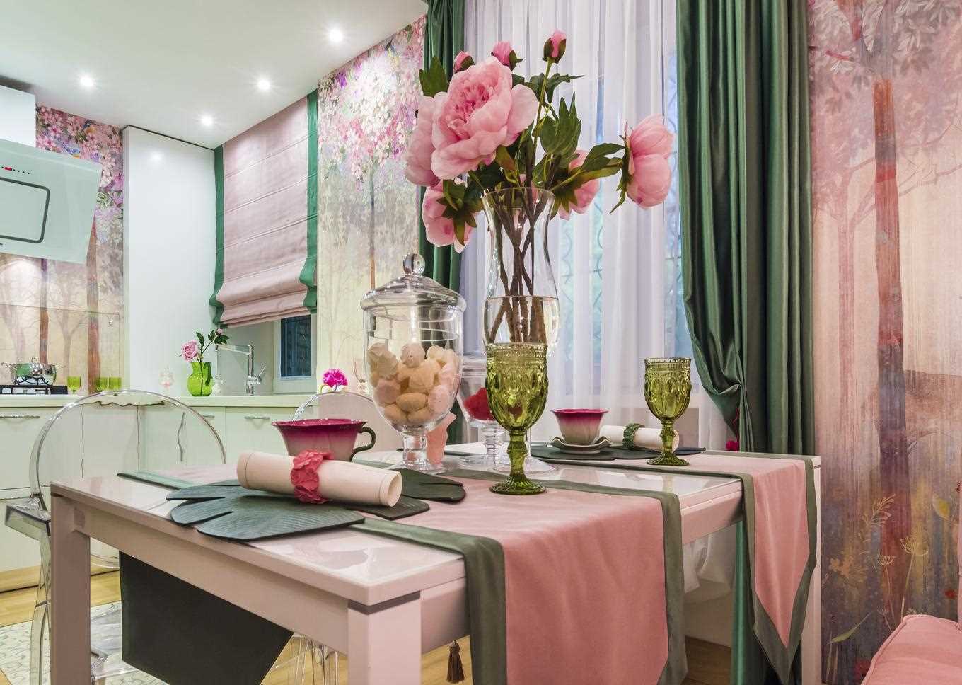 - Provença. Cores - branco, creme, azul, rosa. No chão é piso laminado, papel de parede nas paredes em flores frívolas, teto rebocado. O mobiliário é leve, de materiais naturais. Cortinas no estilo de um café, fechando apenas metade da janela. Na mesa, certifique-se de ter um vaso de flores.
