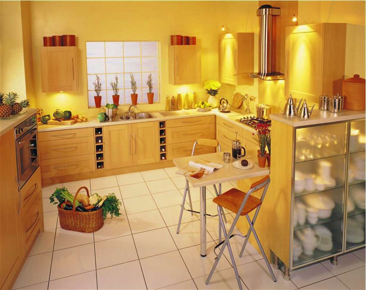 - Arranjo de móveis e acessórios. Quando a cozinha está pronta, você precisa mobiliar e decorar.