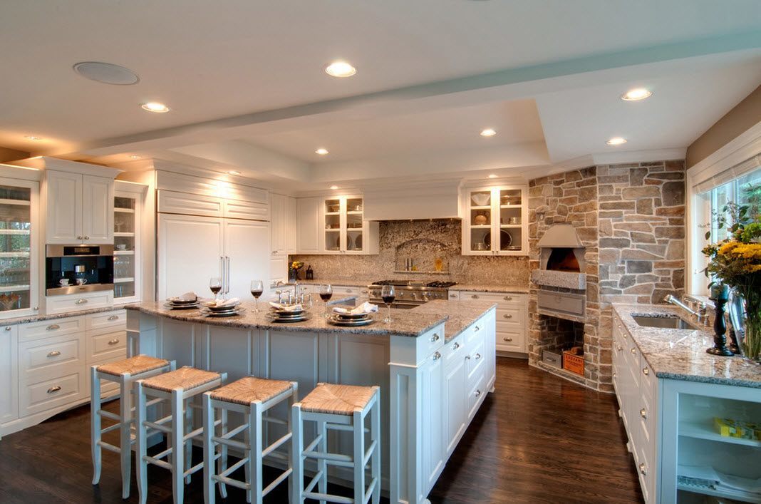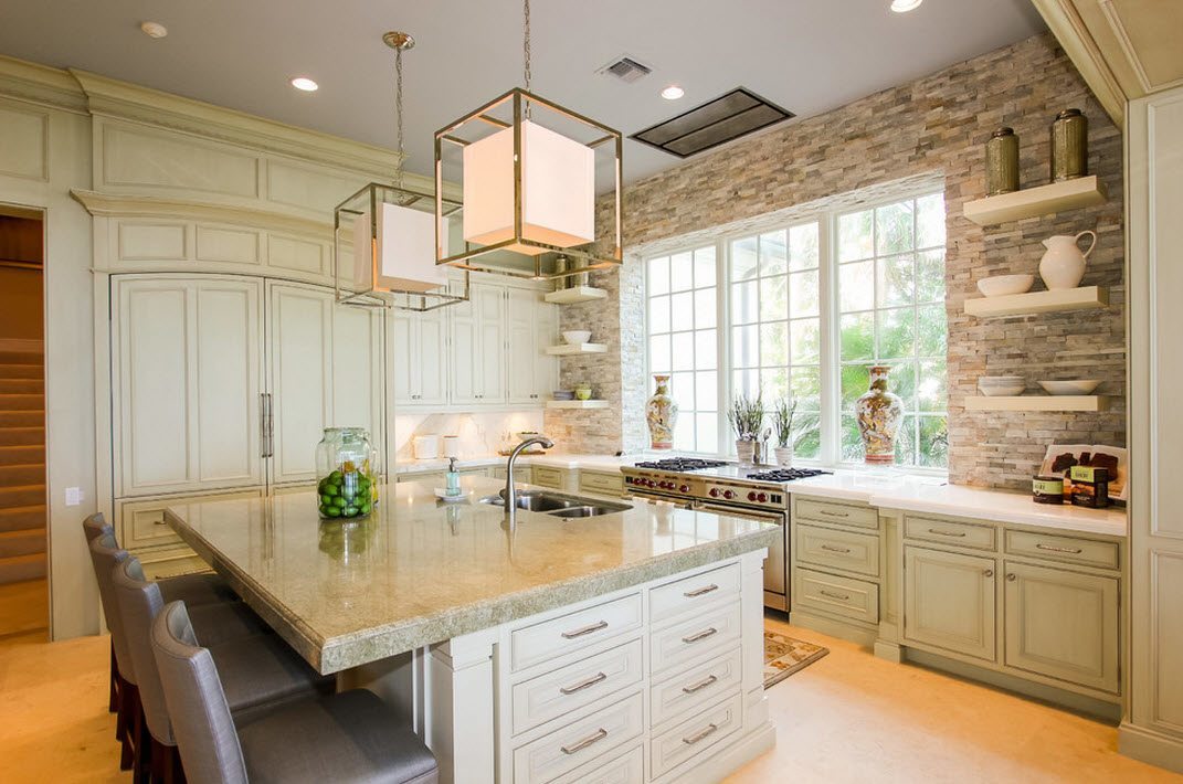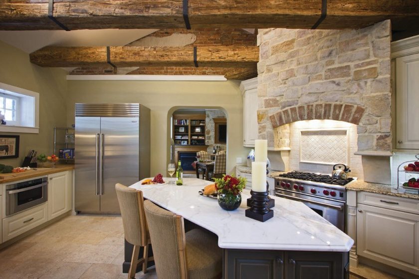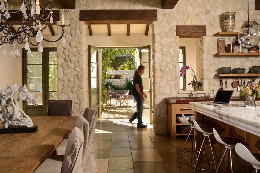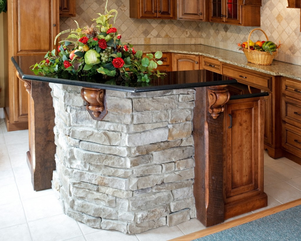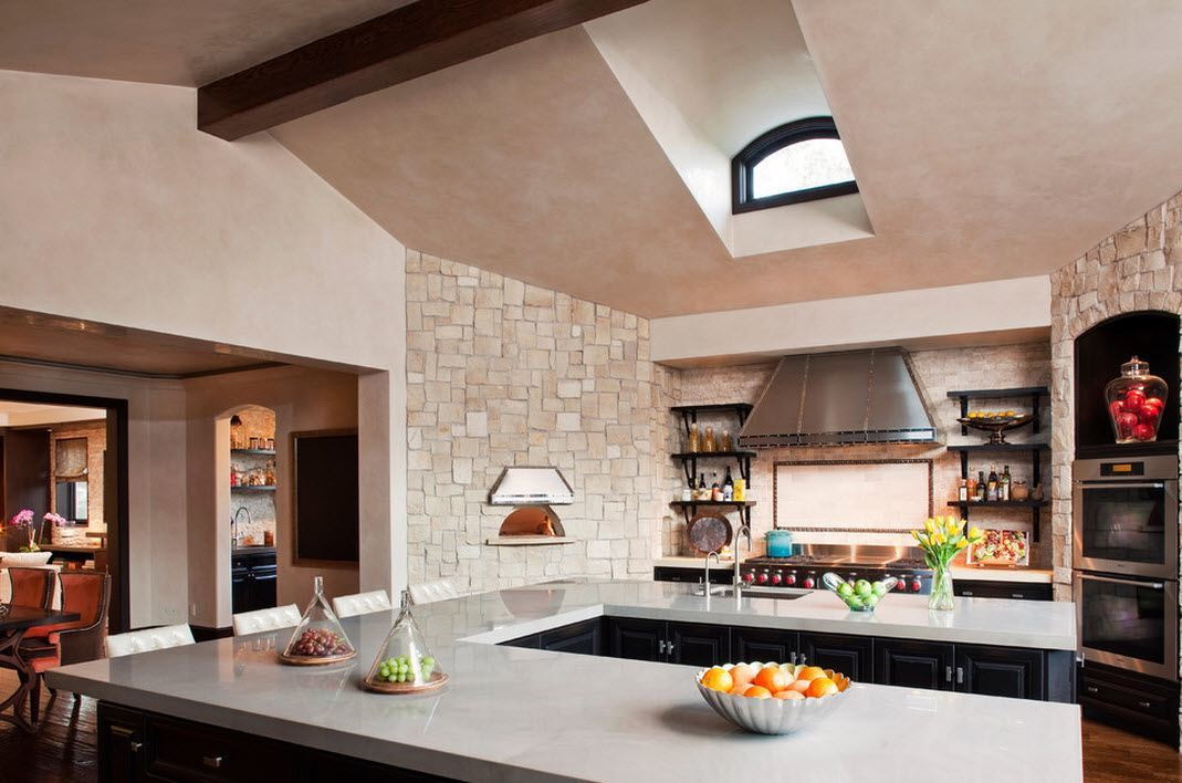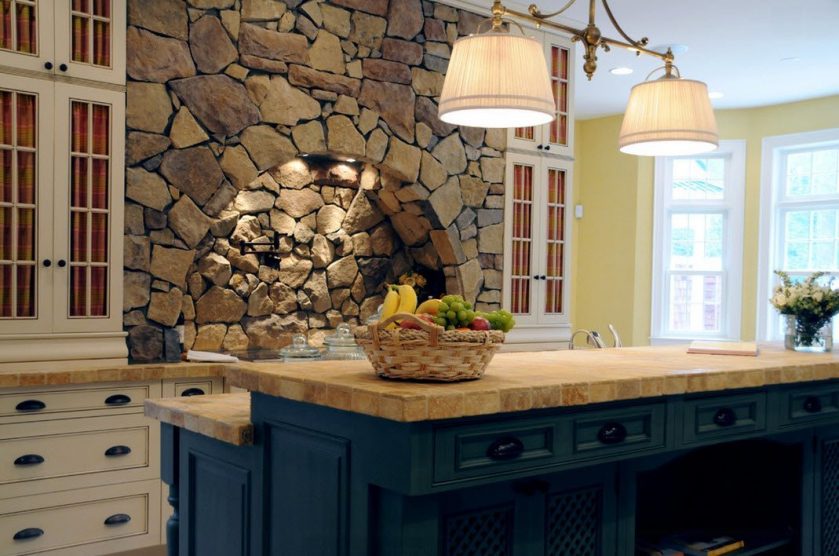 Para a decoração da cozinha usada granito, carregando faíscas e jogar. Mármore traz austeridade e nobreza para o interior. Travertino enche a cozinha com luz, contribui para um bom humor. Pedras do rio trazem frescor e distraem dos problemas. A ardósia cria o efeito do conforto da casa e se assemelha a uma lareira, e o arenito e o calcário dão calor.