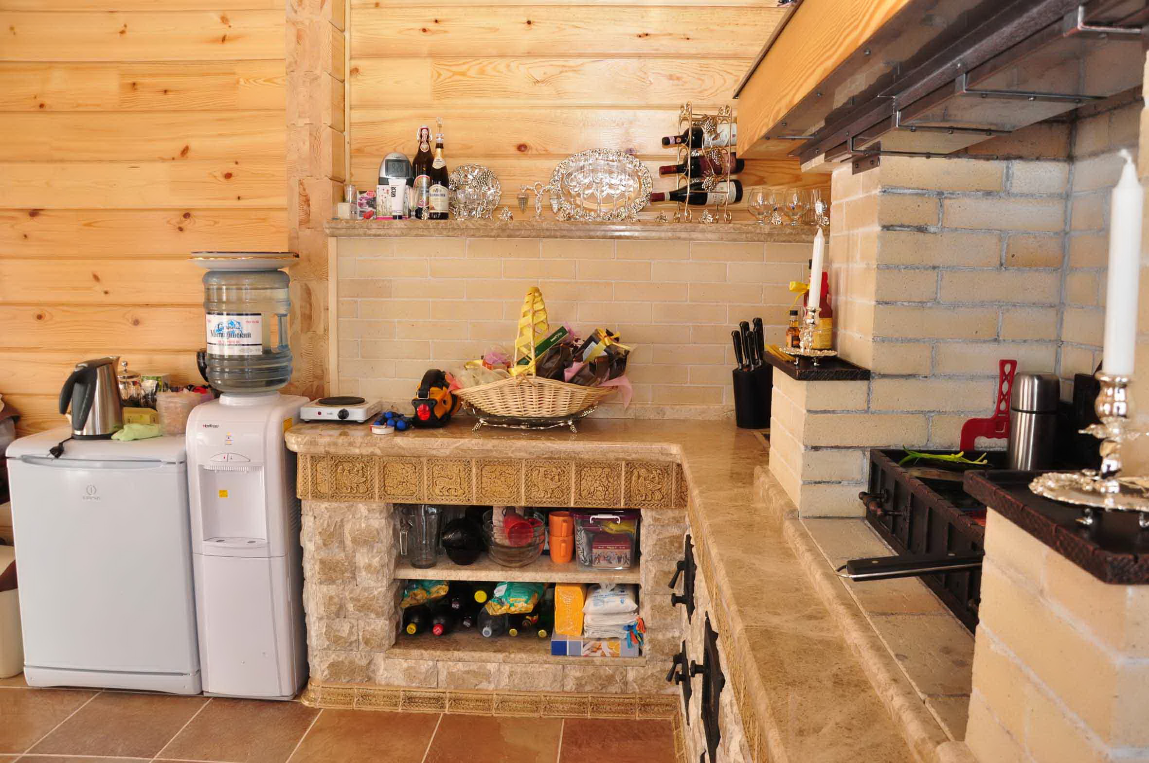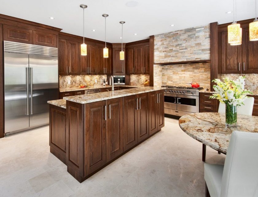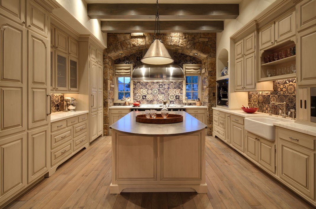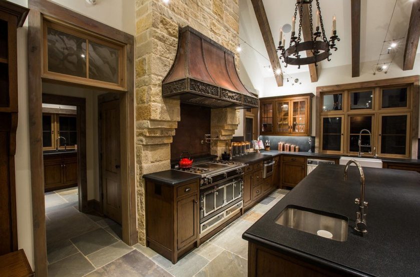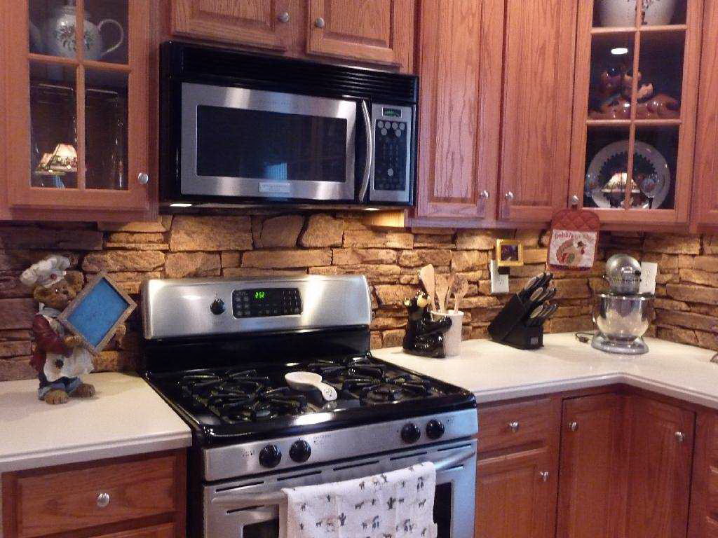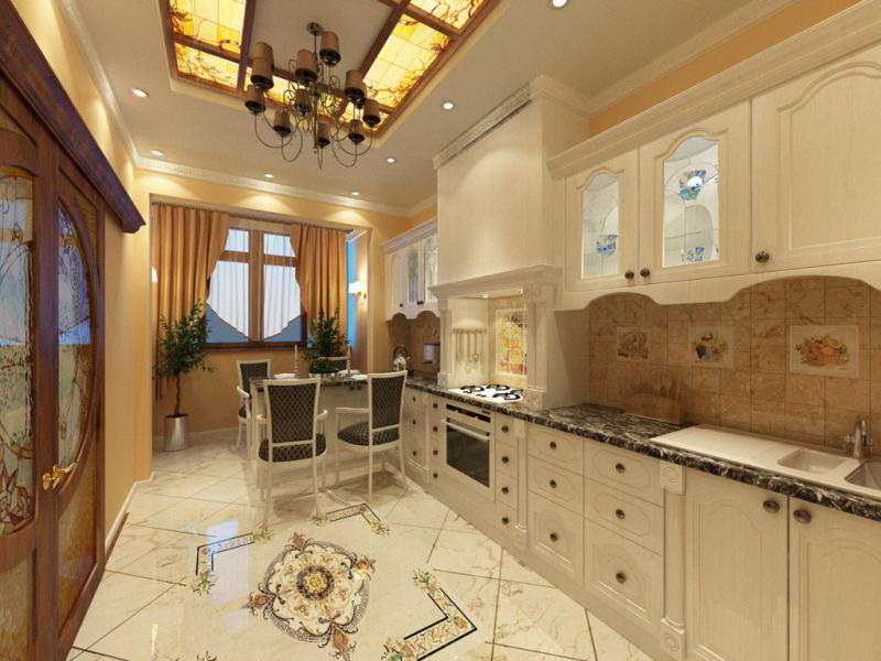 Para a decoração da cozinha usada granito, carregando faíscas e jogar. Mármore traz austeridade e nobreza para o interior. Travertino enche a cozinha com luz, contribui para um bom humor. Pedras do rio trazem frescor e distraem dos problemas. A ardósia cria o efeito do conforto da casa e se assemelha a uma lareira, e o arenito e o calcário dão calor.