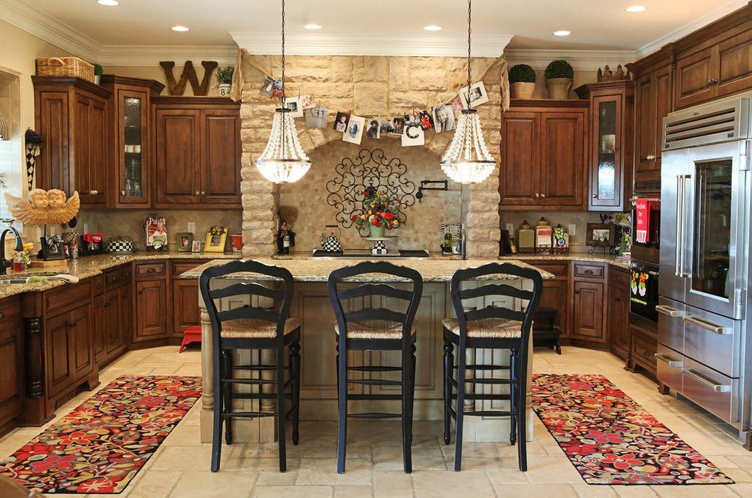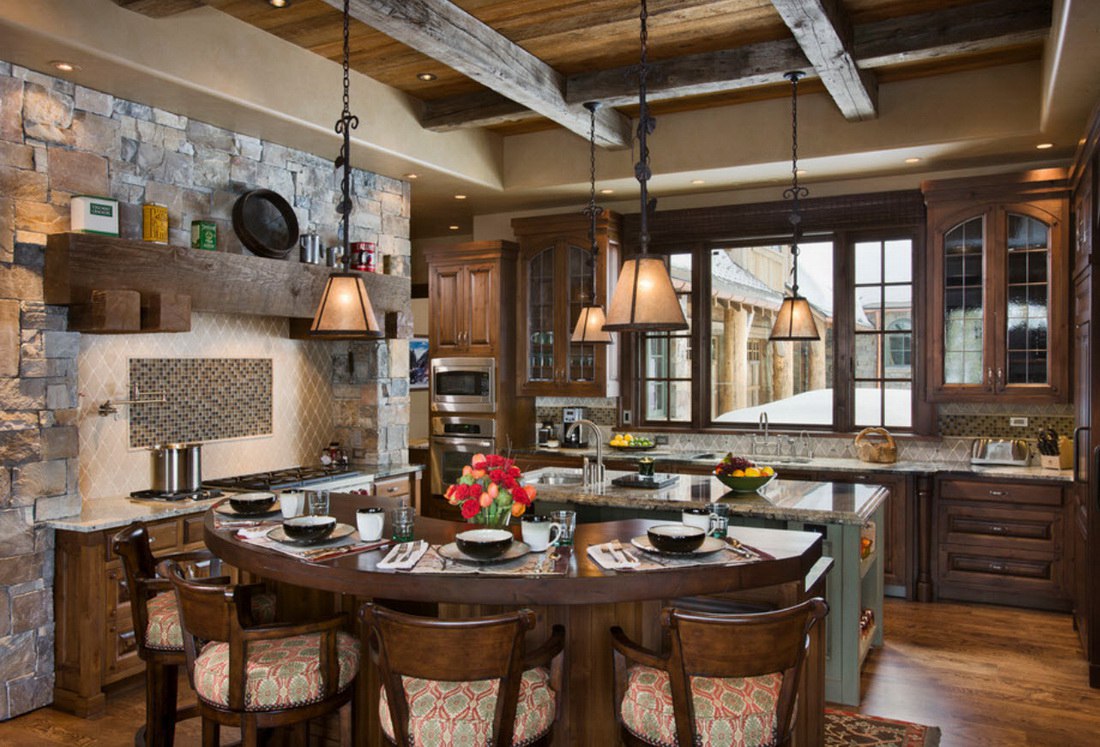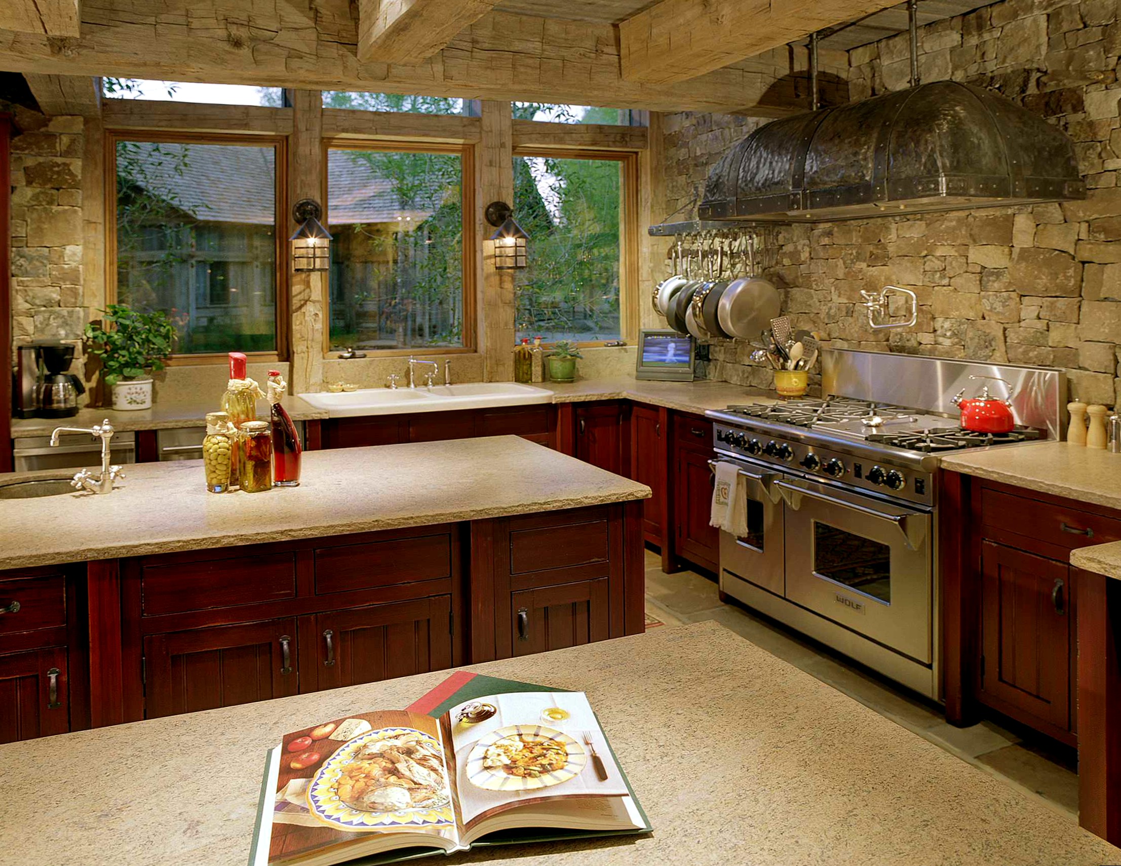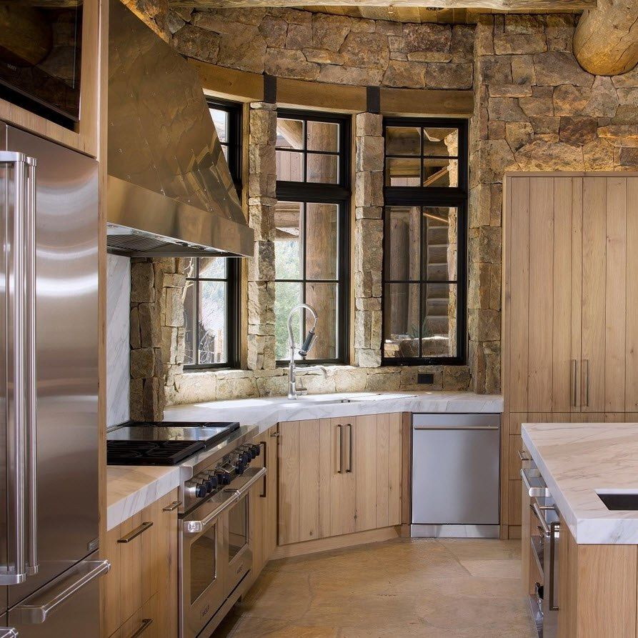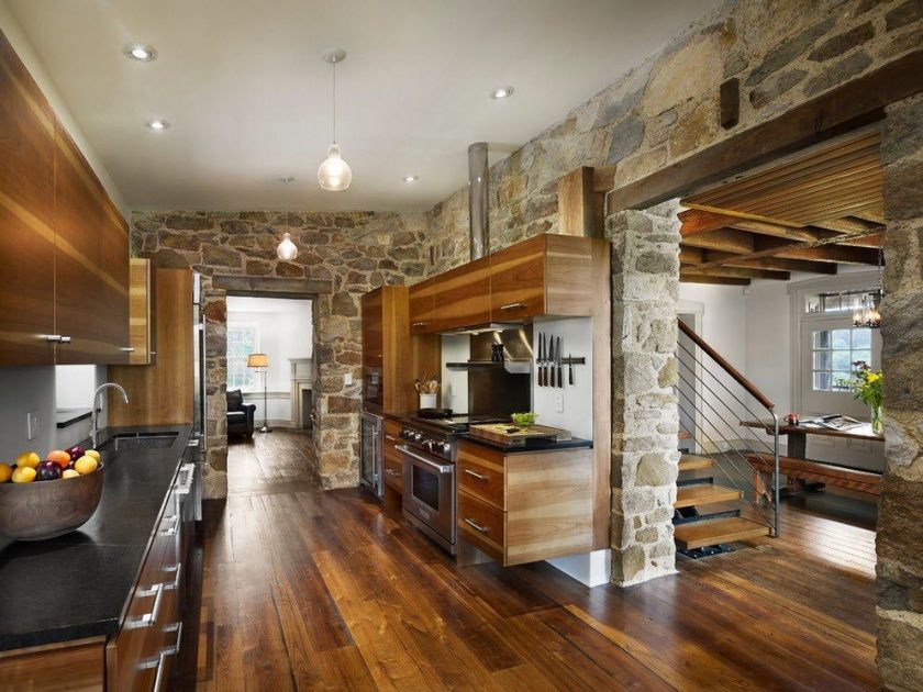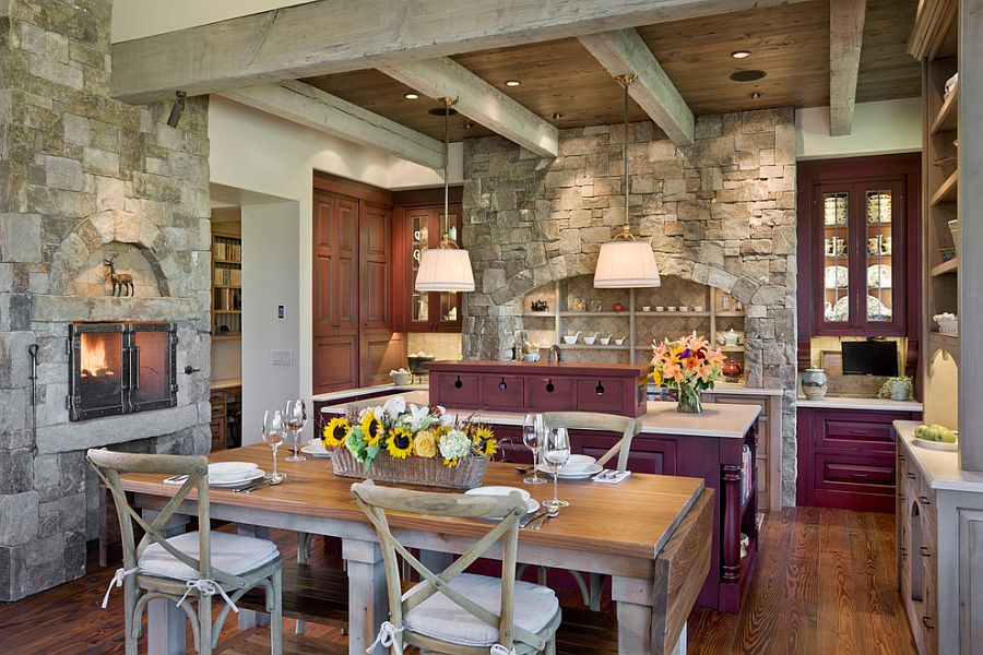 Quando se trata de decorar as paredes da cozinha com uma pedra, surge imediatamente um estilo rústico e áspero. Em "música countryA combinação de pedra e madeira é bem refletida. Revestimentos de paredes e móveis de madeira formam um conjunto harmonioso, cujo efeito é reforçado pela adição de vegetação ao interior.