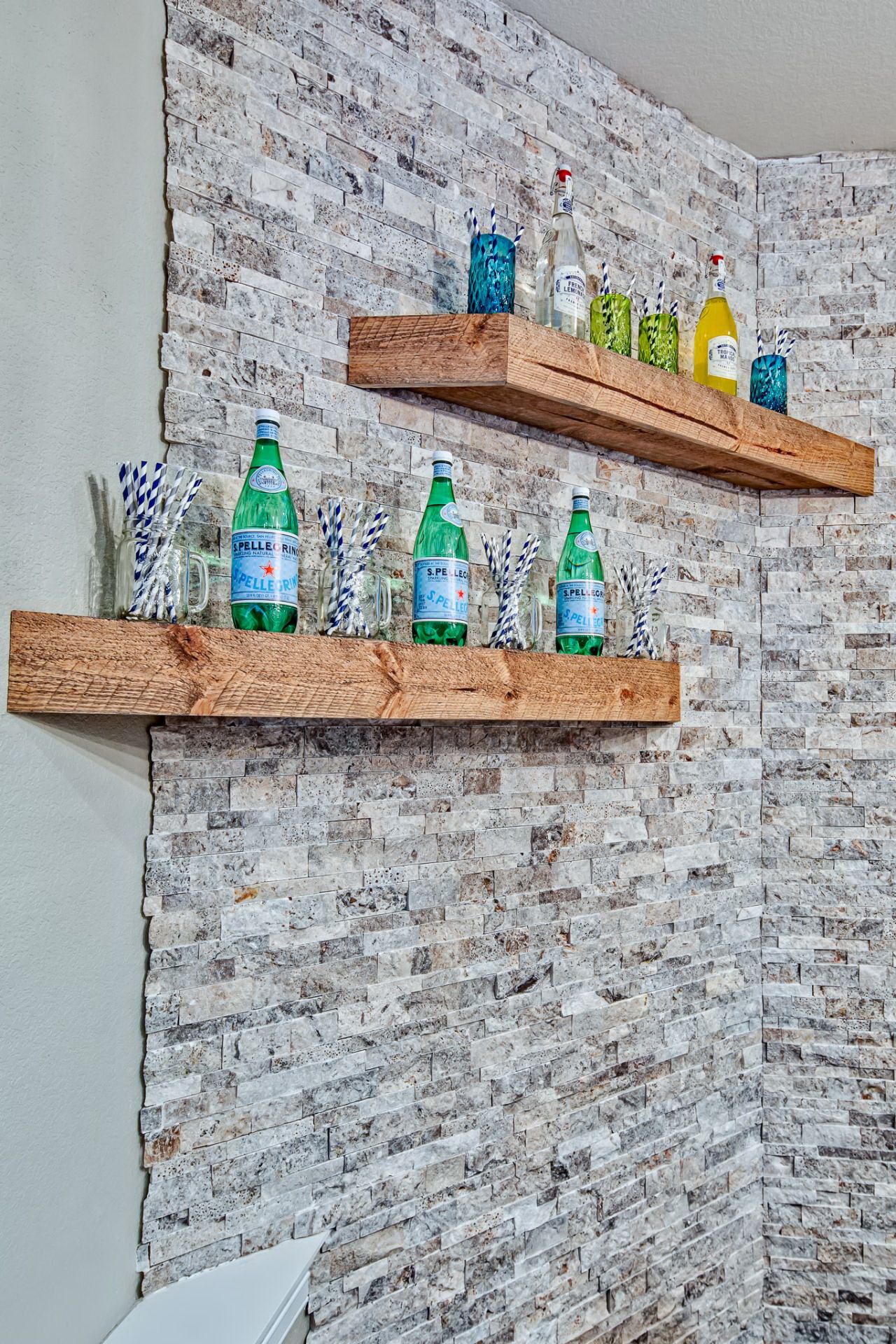 Uma solução original para o uso de pedra decorativa na cozinha é terminar uma das paredes. Não menos interessante é a opção de intercalar este material em um acabamento existente.