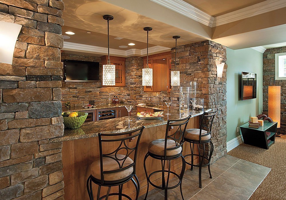 Dado que a telha usual e monótona neste papel está se tornando cada vez mais uma coisa do passado, então um avental na cozinha de pedra será uma opção interessante. Por via de regra, tal material encontra todas as condições necessárias para proteger a parede de dano.