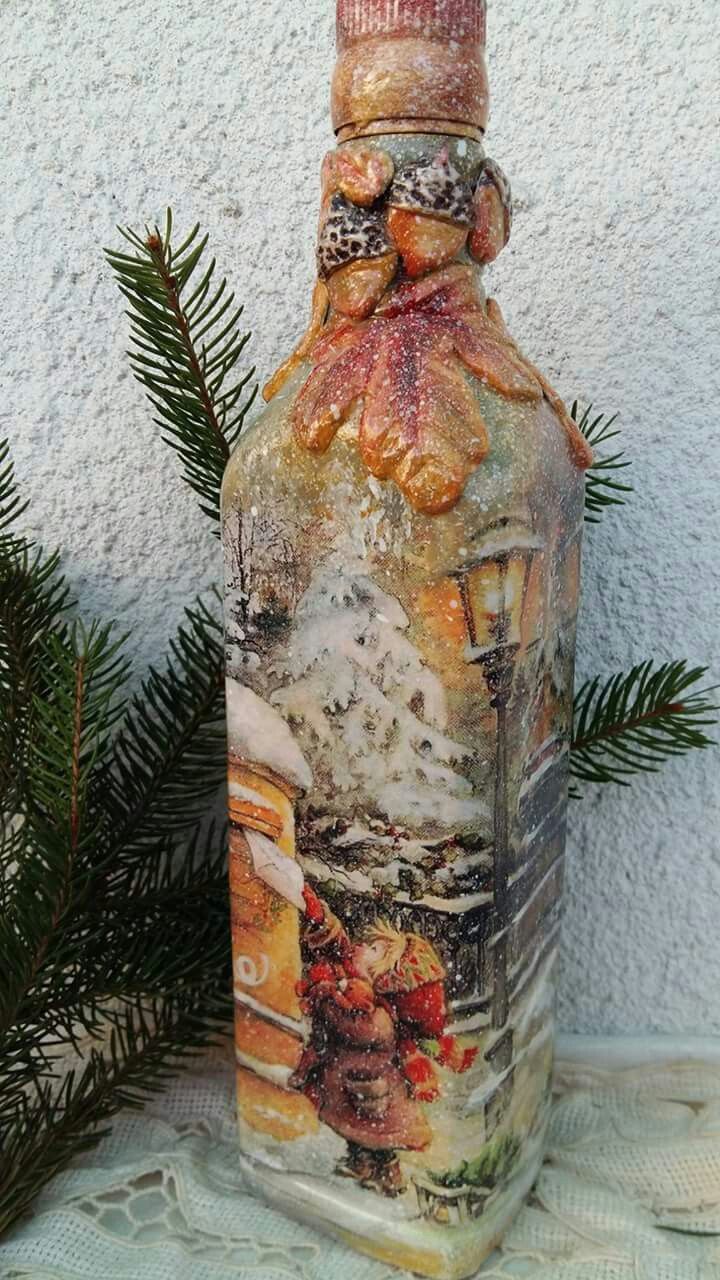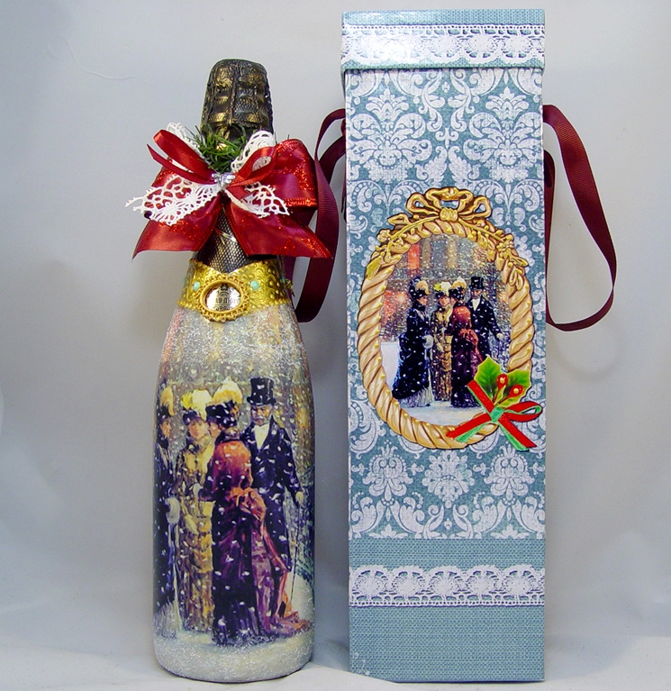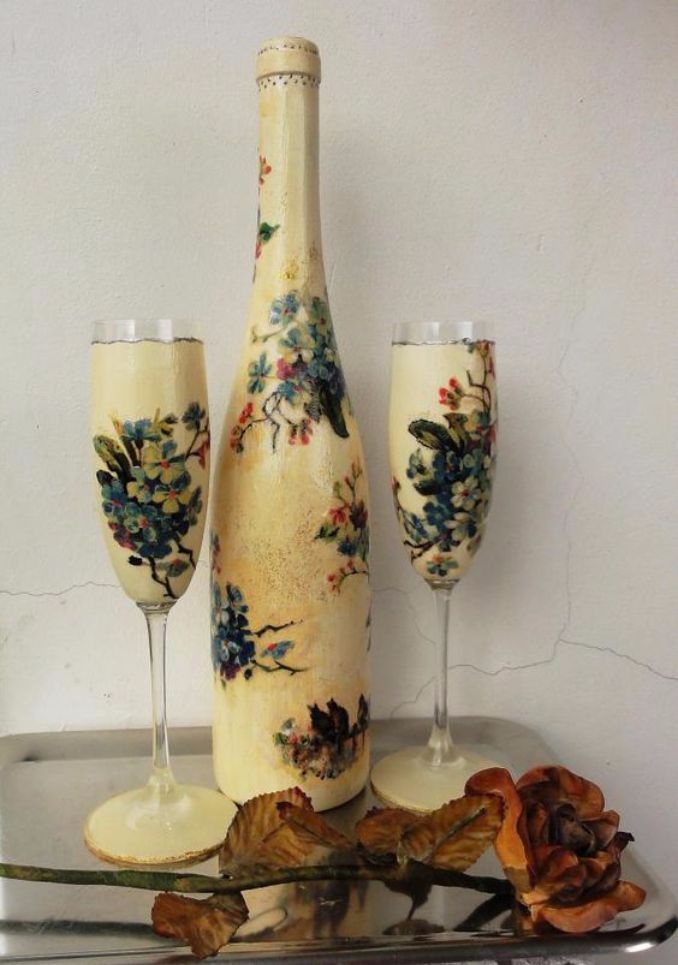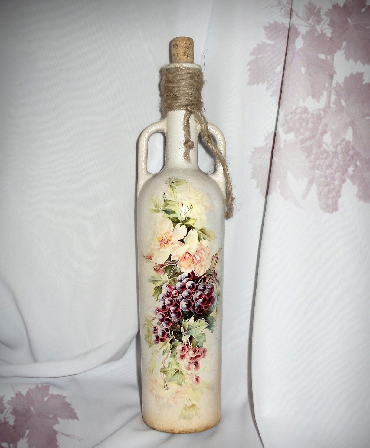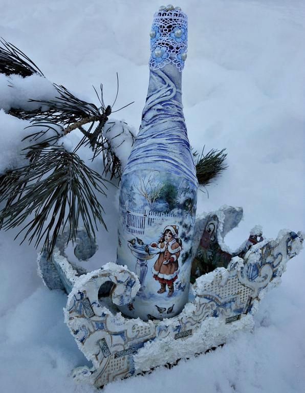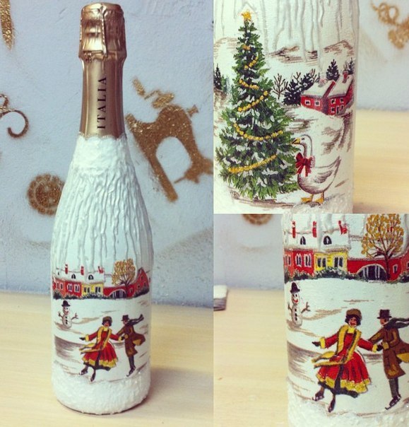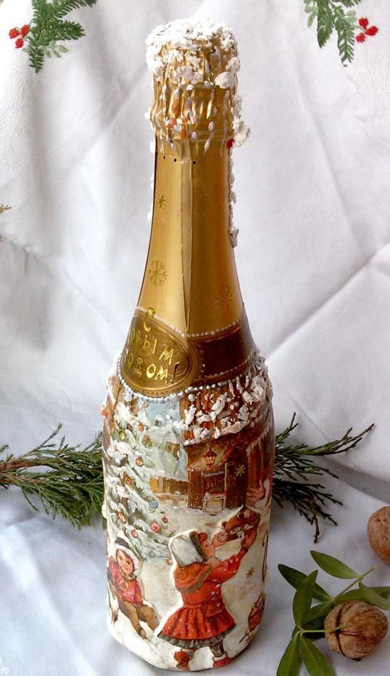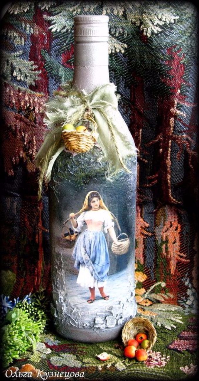 Para as artesãs que já dominaram o básico do artesanato em papel de guardanapo, quero oferecer algo novo e original. Uma idéia na moda é colocar uma garrafa festiva com um pano, criar contornos volumétricos ou fazer a imagem antiga com a ajuda de um craquelure.
