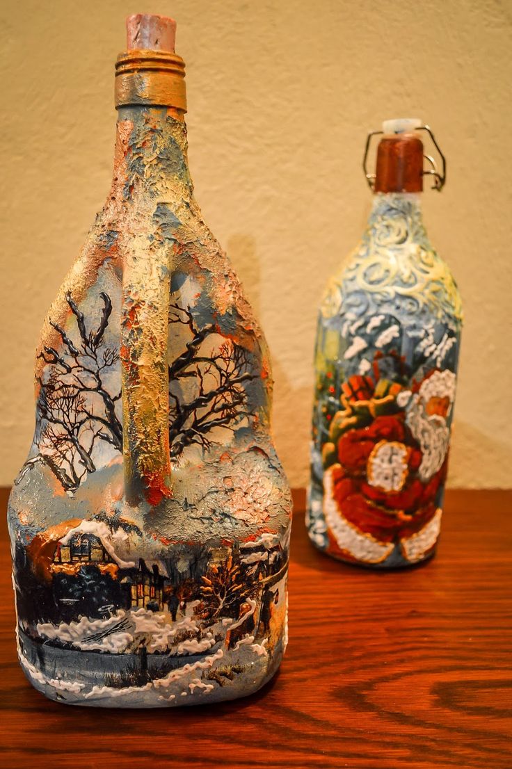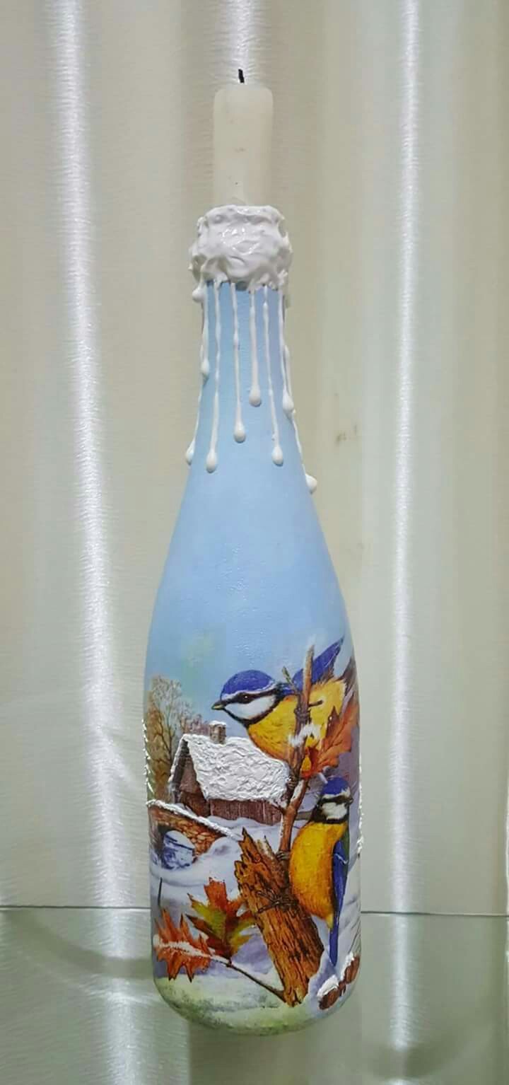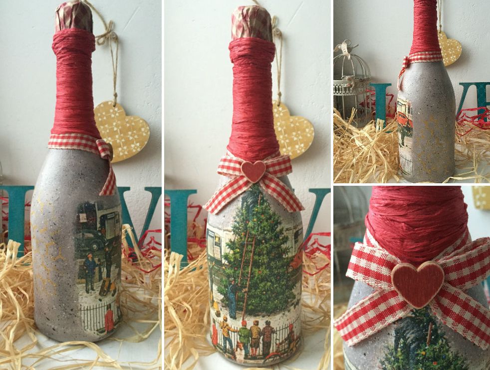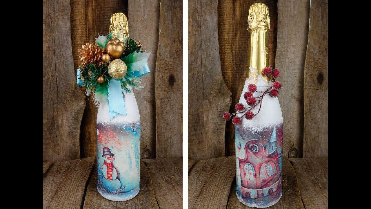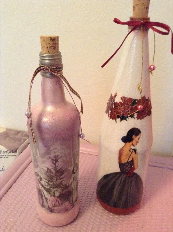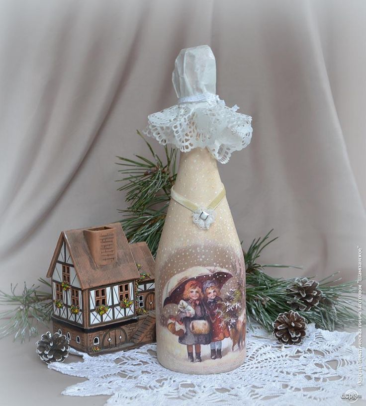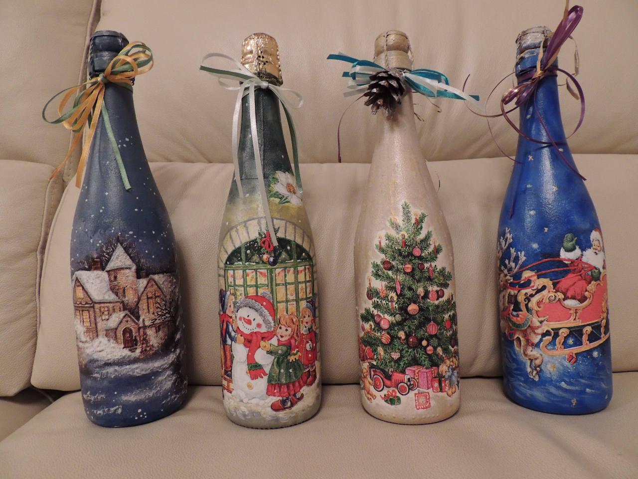 Para as artesãs que já dominaram o básico do artesanato em papel de guardanapo, quero oferecer algo novo e original. Uma idéia na moda é colocar uma garrafa festiva com um pano, criar contornos volumétricos ou fazer a imagem antiga com a ajuda de um craquelure.